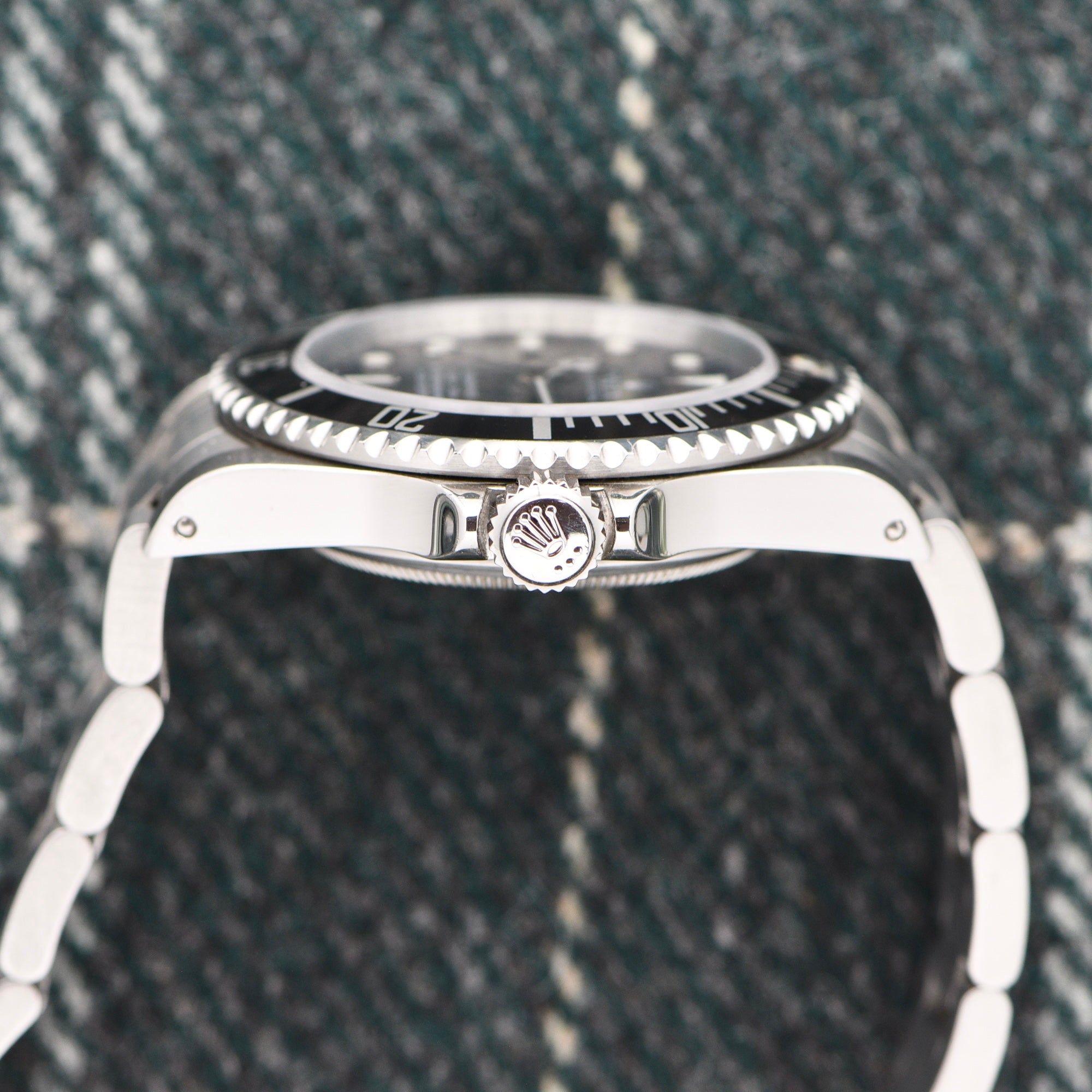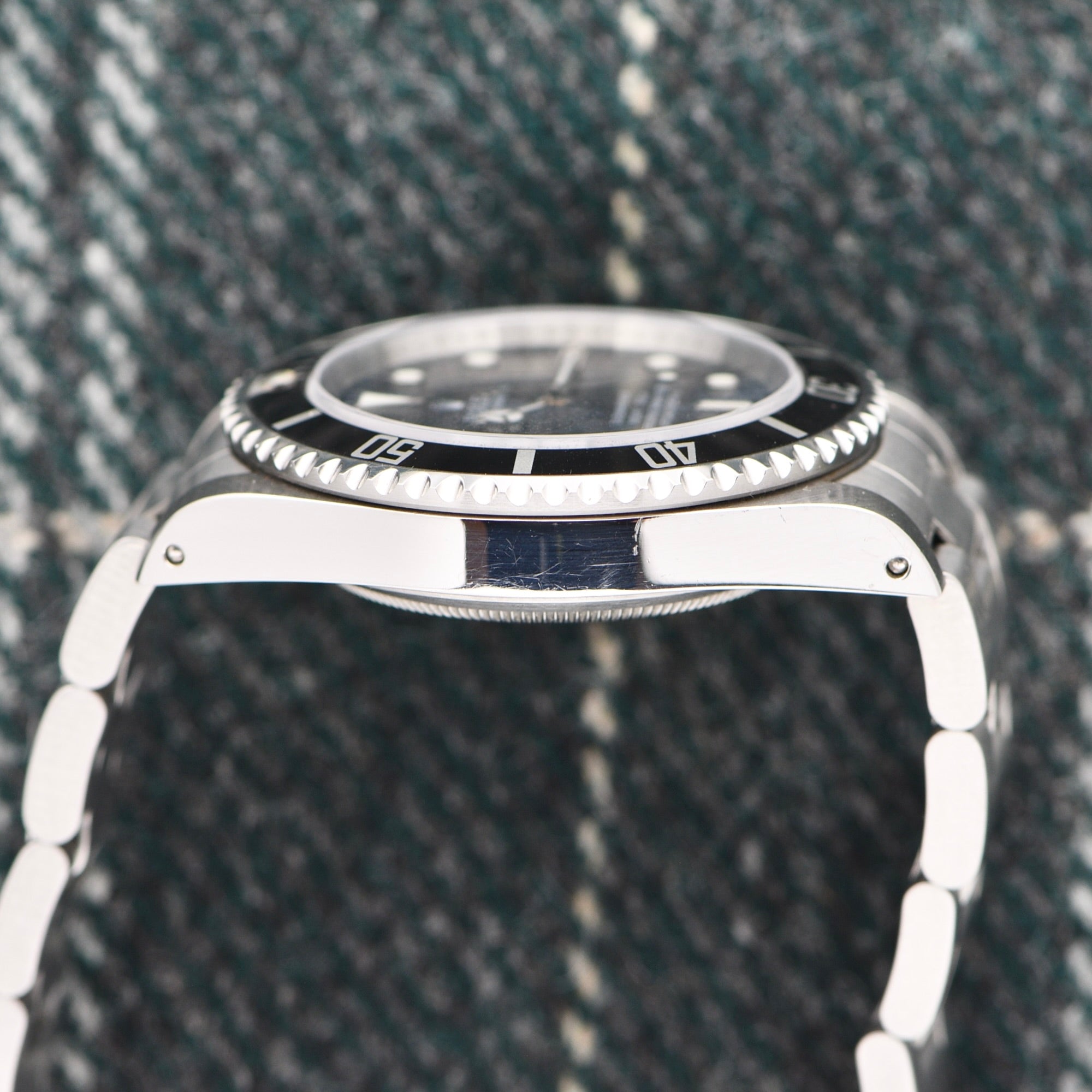 The case is nice and sharp and has even lugs. The bracelet is in just as good of condition. The bezel is also clean with the original pip. The watch comes as a true complete set.