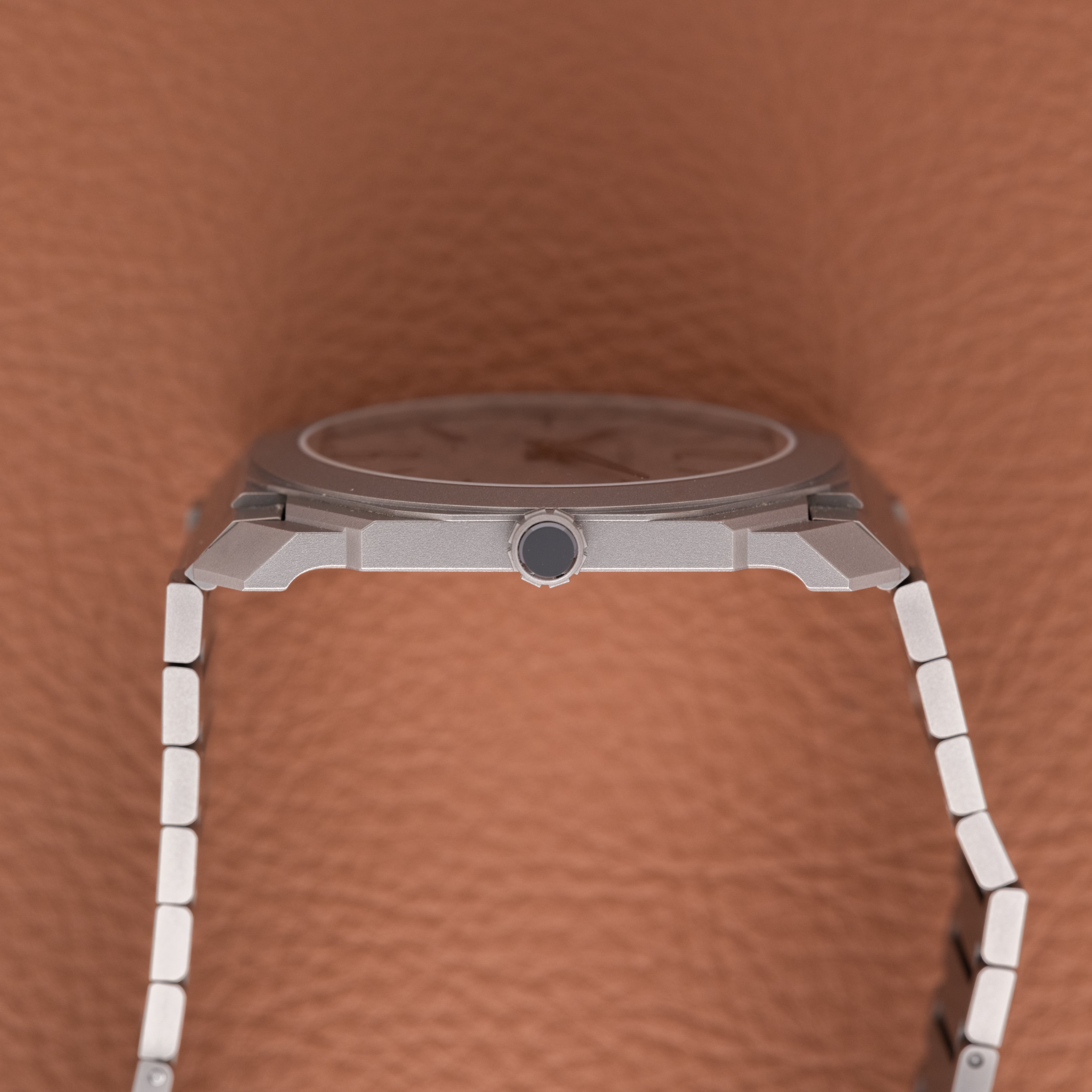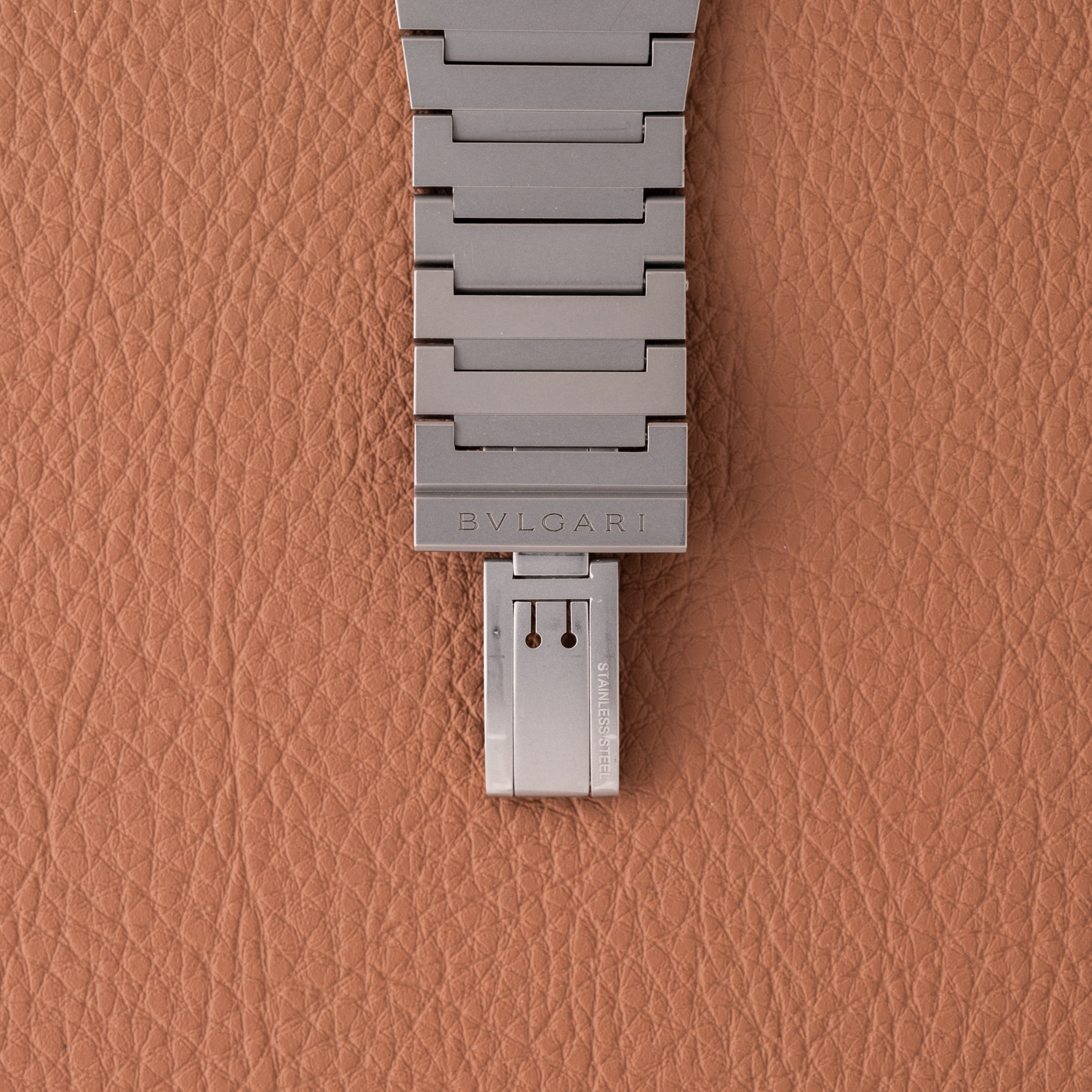 The movement is just as important here. Bvlgari’s use of a micro-rotor automatic caliber allows the watch to stay extremely thin while still offering the convenience of automatic winding. Through the open caseback, the finishing and layout are clean and modern, aligning with the overall design language rather than trying to mimic traditional decoration.