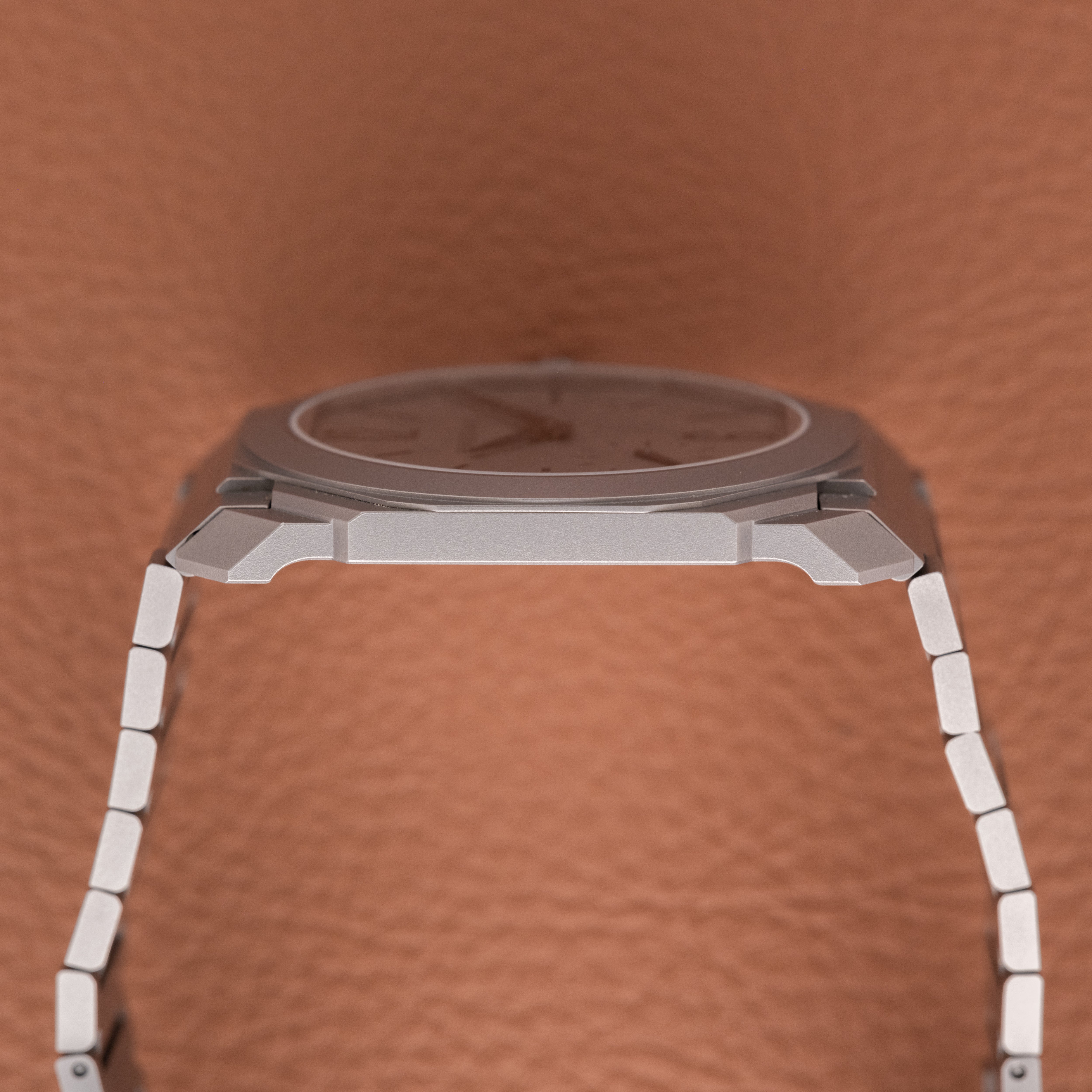 This reference in titanium highlights what the Finissimo concept is really about. The ultra-thin profile, combined with lightweight material, creates a wearing experience noticeably different from most steel sports watches. It almost disappears on the wrist, but visually it still carries a strong presence due to the case design and integrated bracelet.