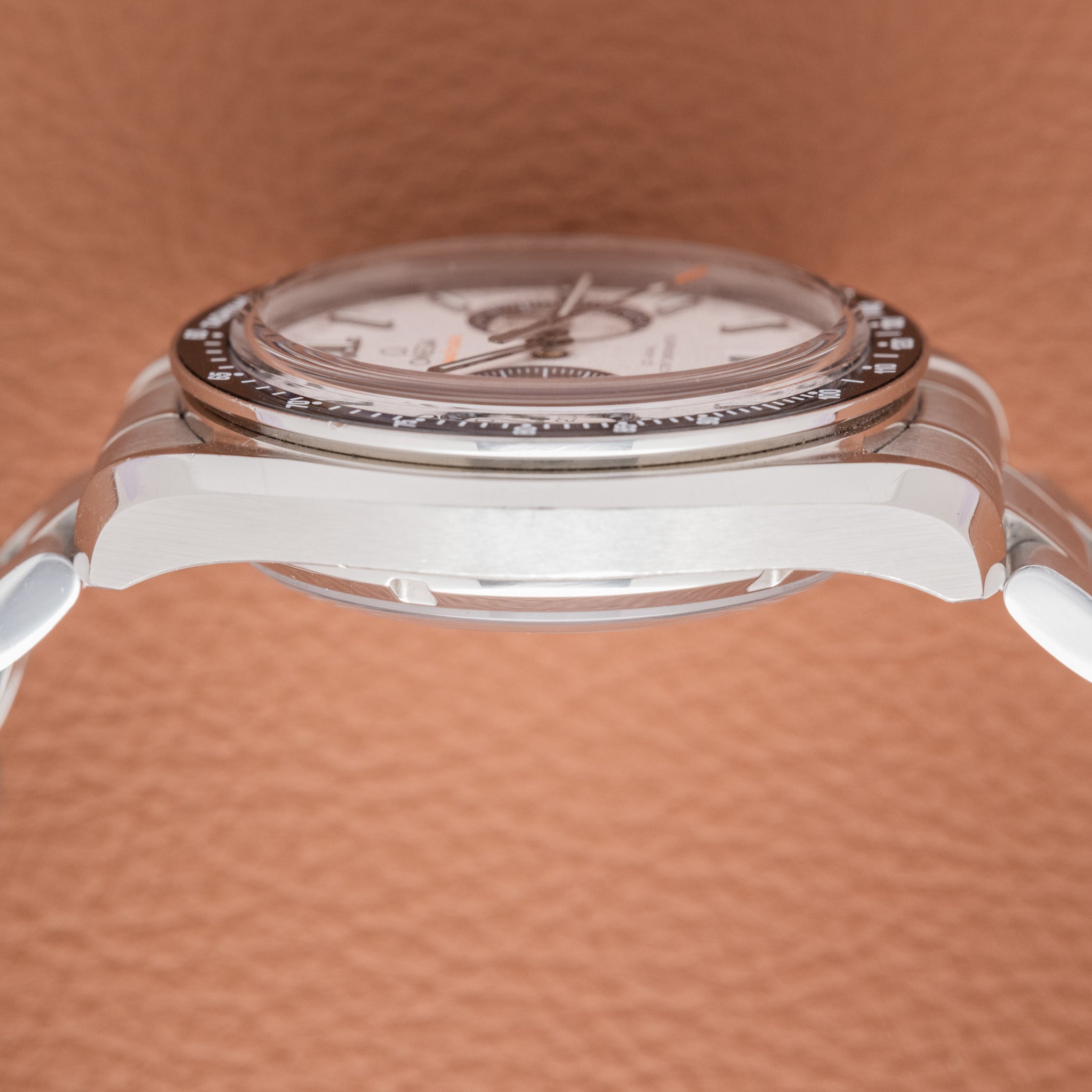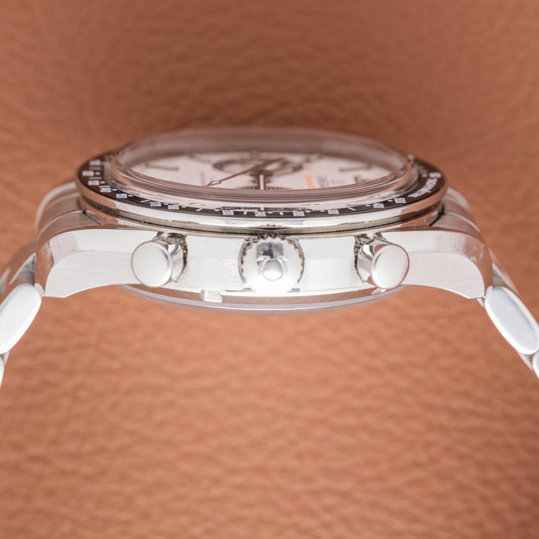 This reference belongs to the modern Speedmaster Professional family but departs from the traditional Moonwatch format with a larger 44.25 mm case, automatic winding, and a two-register layout. The movement is METAS certified as a Master Chronometer, tested for accuracy, power reserve, and resistance to magnetic fields up to 15,000 gauss. While not a direct Moonwatch descendant, these models represent Omega’s contemporary vision for the Speedmaster as a technically advanced everyday chronograph rather than a purely historical piece.