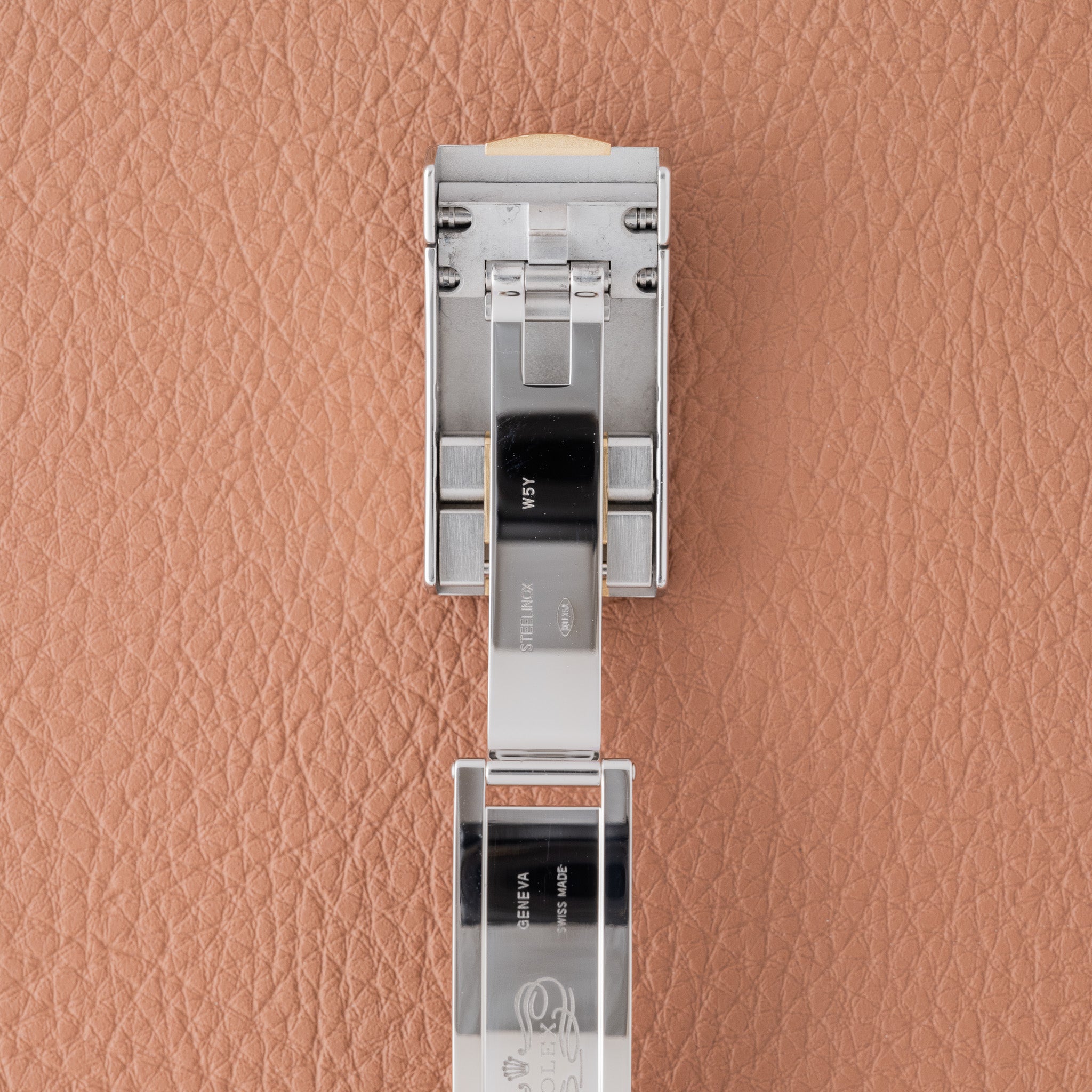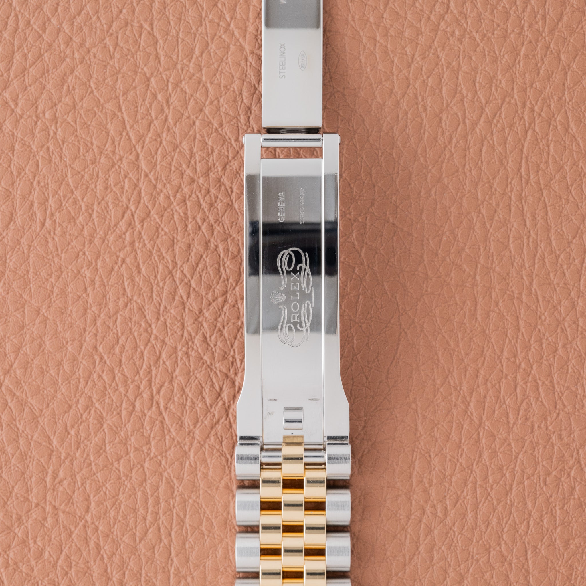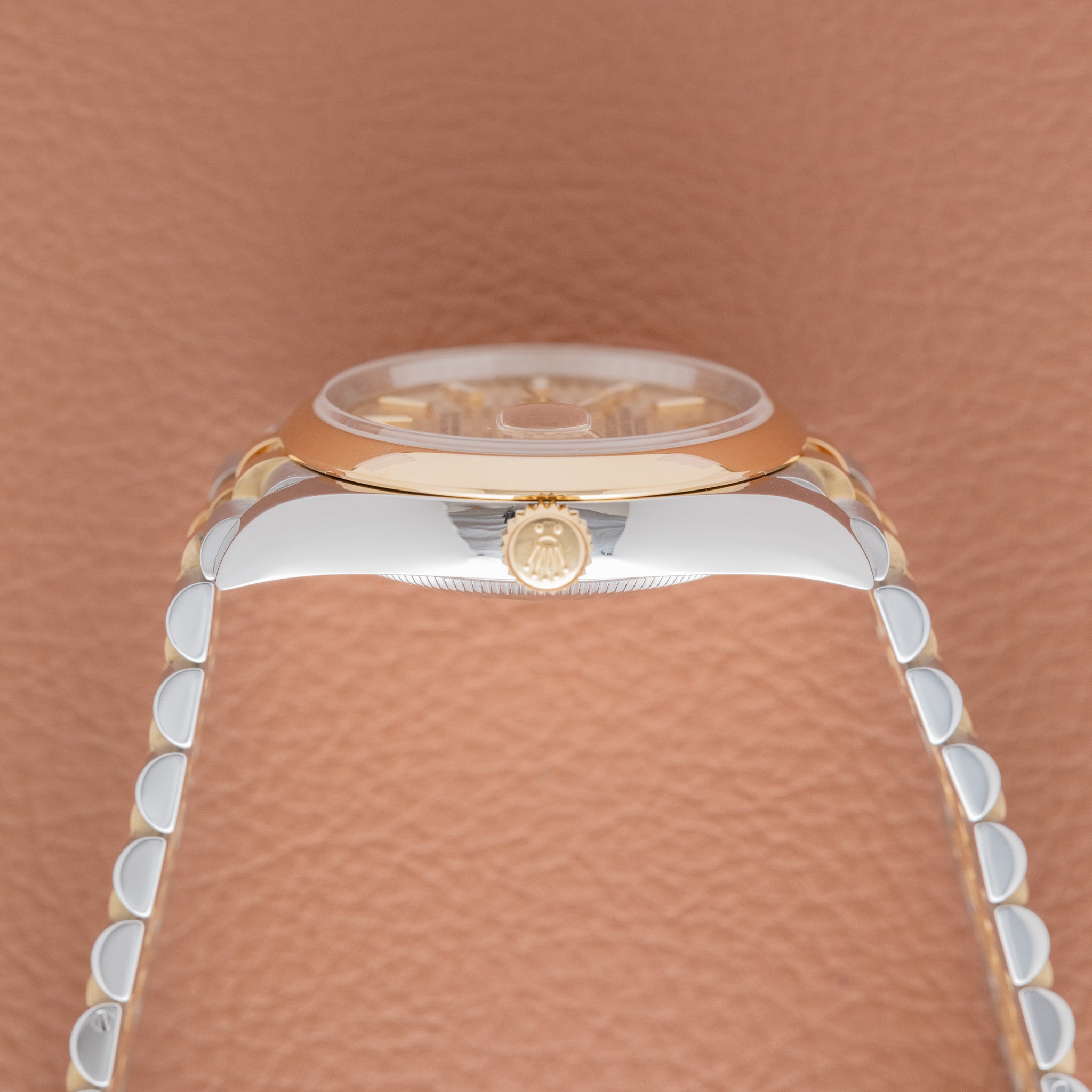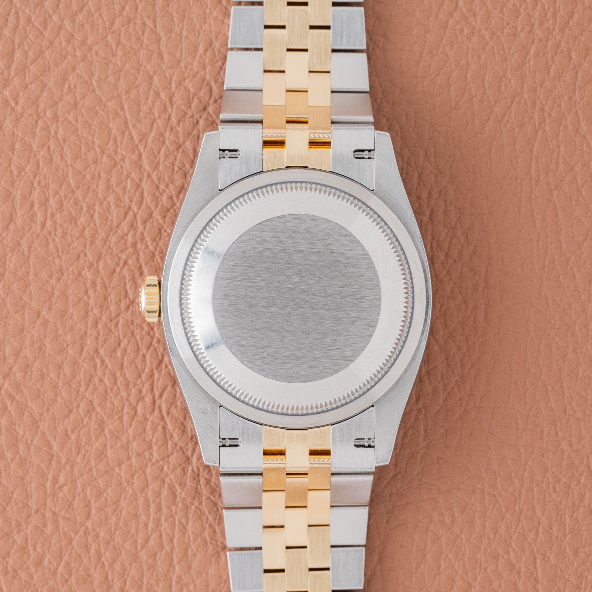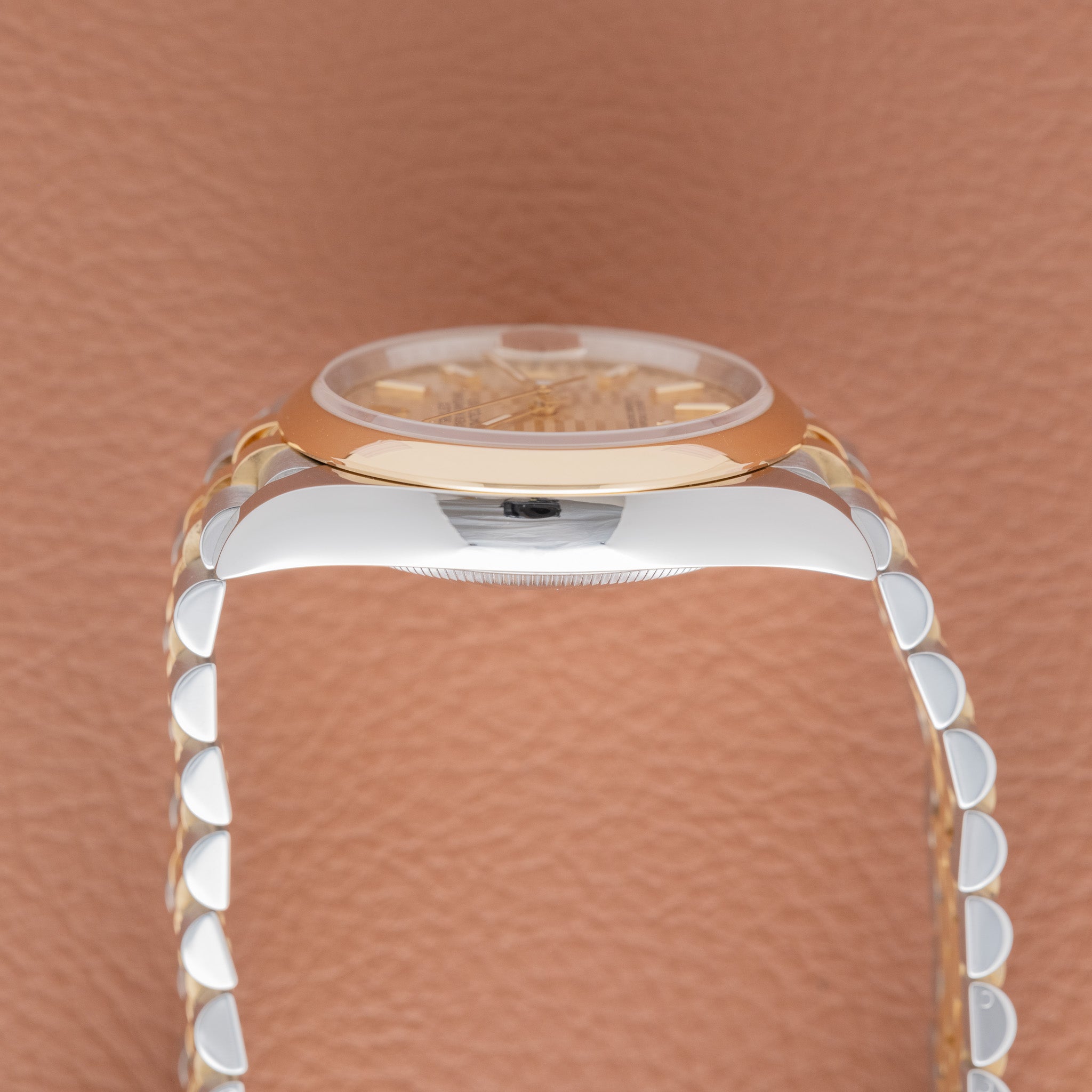 The ref. 126203 represents the modern evolution of the two-tone Datejust, pairing a smooth yellow-gold bezel with an Oystersteel case and an updated movement. While most two tone Datejusts are ordered with a fluted bezel, the smooth bezel configuration is less common and gives the watch a more contemporary feel. The champagne motif dial is also an uncommon variant within the current catalog, adding a distinctive texture that sets it apart from the traditional sunburst champagne tone. This example retains its original factory finish and shows honest wear from use.