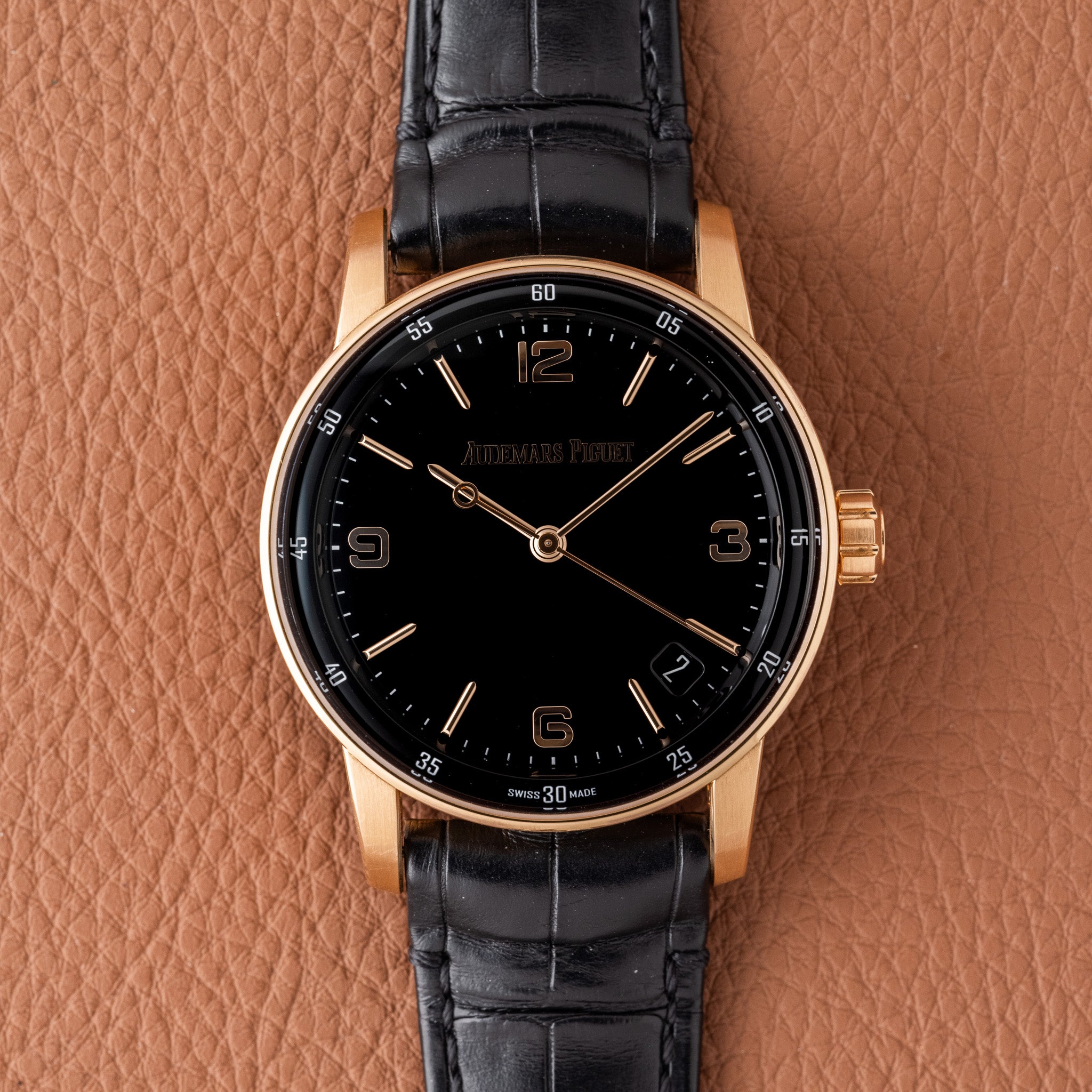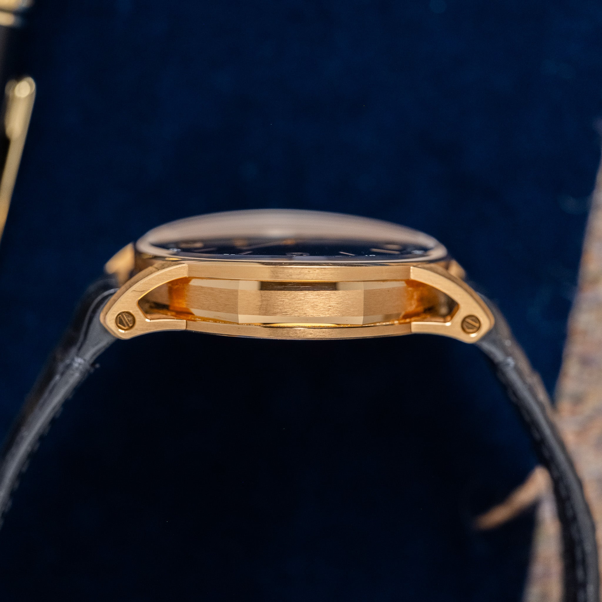 Reference 15210OR pairs the time-only Code 11.59 with an 18k rose gold case and a black lacquer dial. The dial is deceptively complex, using multiple layers of lacquer to create depth while remaining restrained and highly legible. Inside is Audemars Piguet’s in-house Calibre 4302, a modern automatic movement with extended power reserve and contemporary finishing standards. This reference strikes a balance between daily wearability and high watchmaking, making it one of the more versatile executions of the Code 11.59 line.