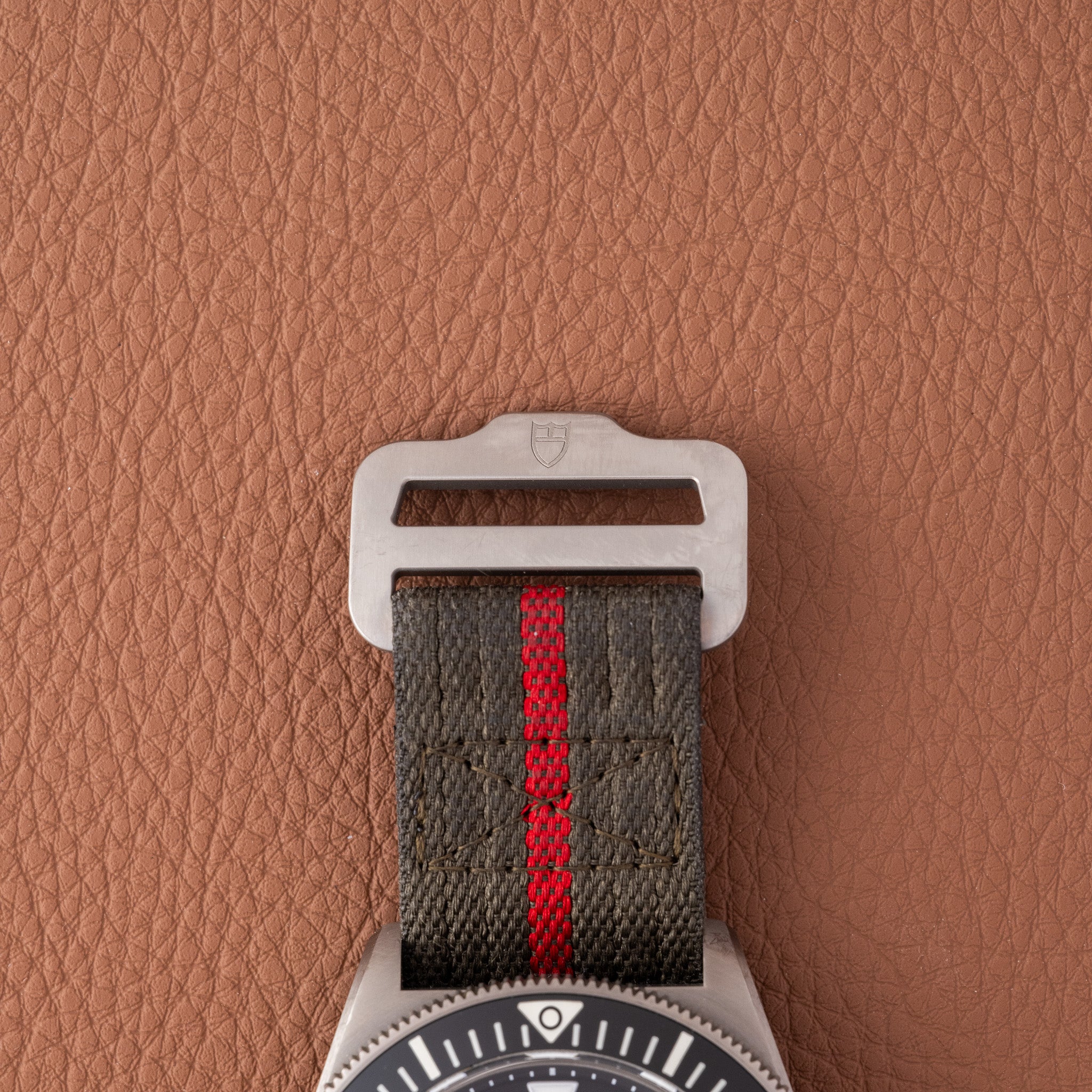 Bracelet: Original one-piece forest-green fabric strap with red center stripe