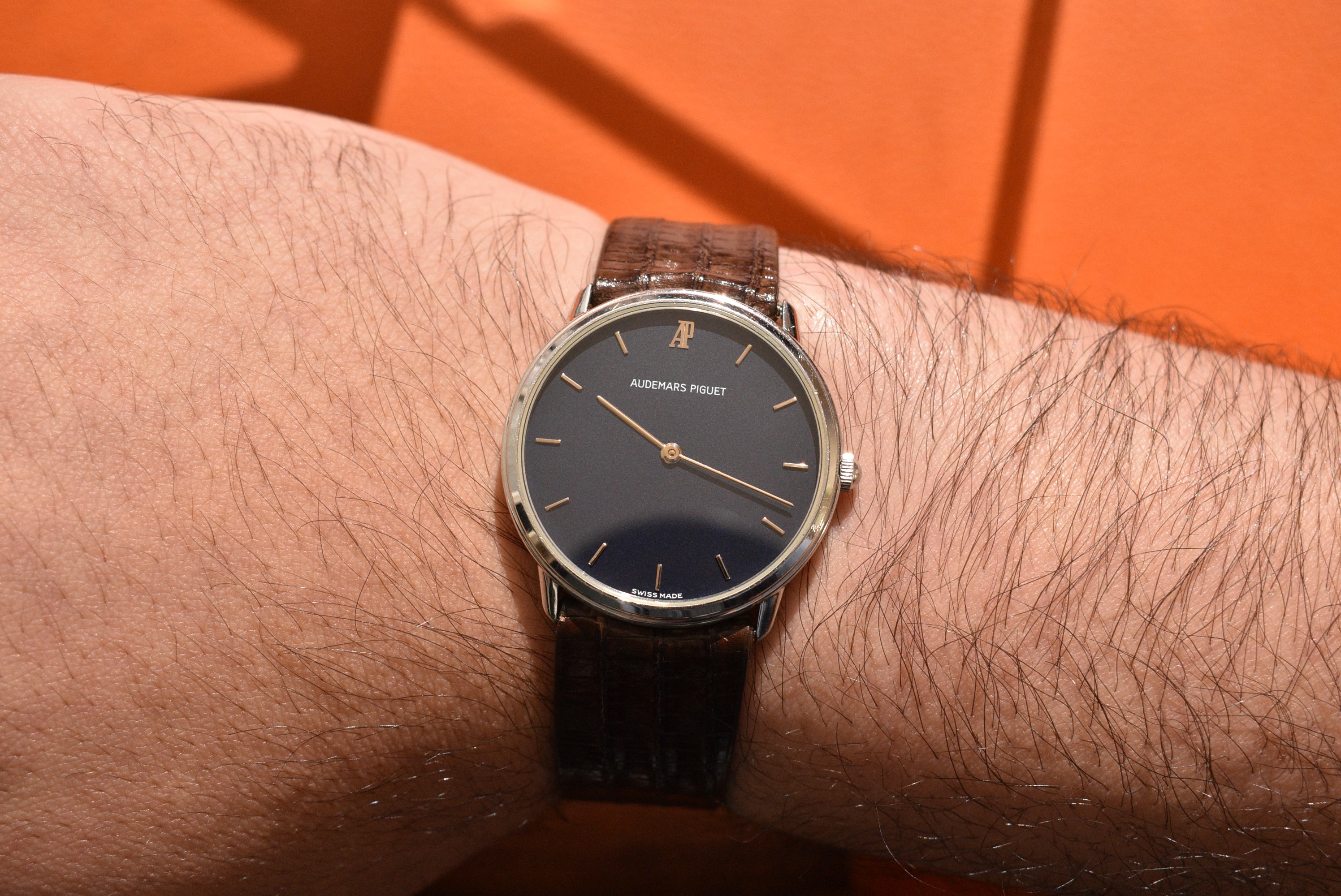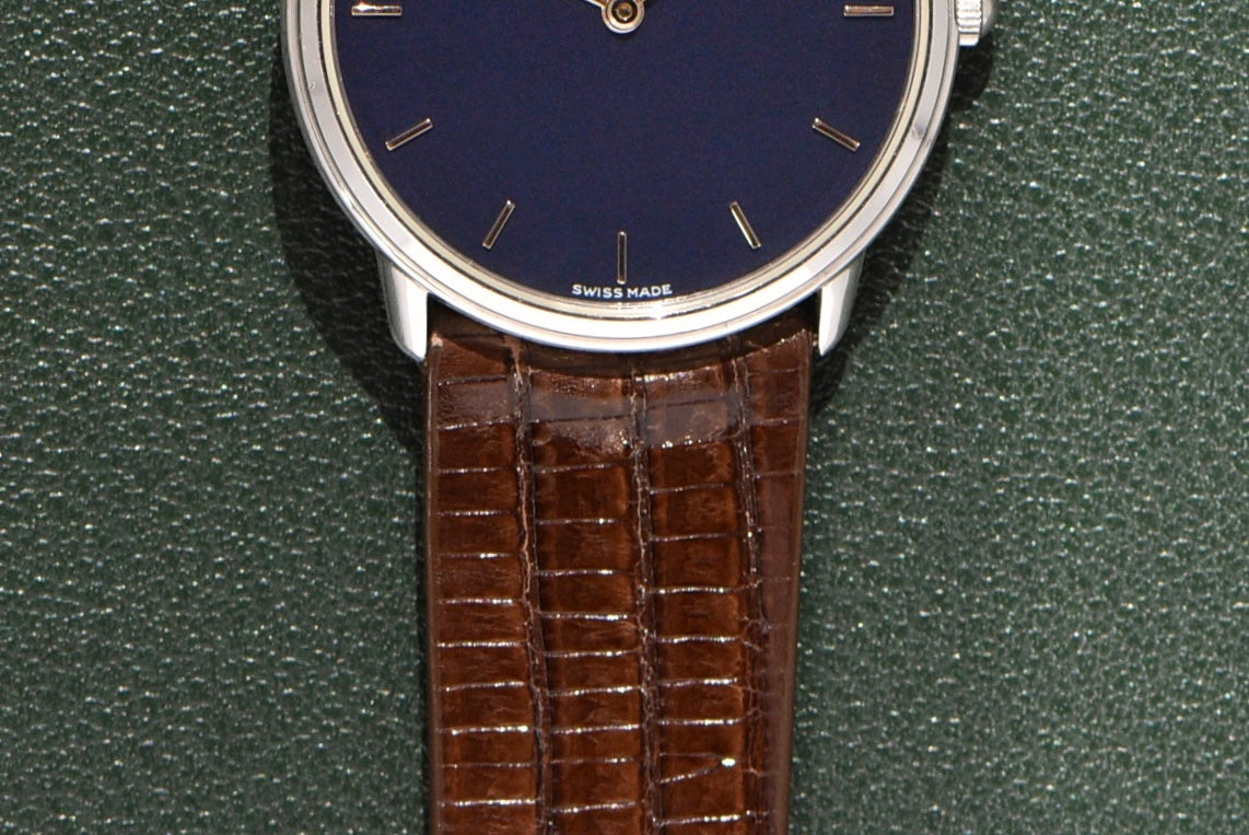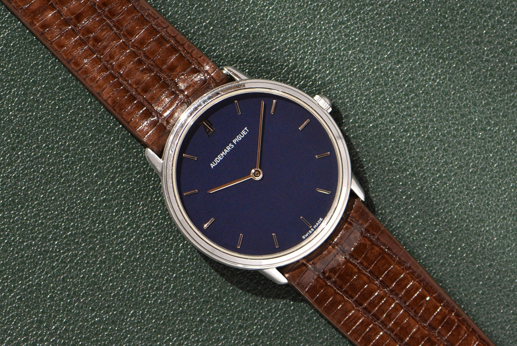It's not every day you find an AP Calatrava. This white gold example comes with its original buckle. The watch is unpolished with a stepped stepped case. The dial is in great condition with a deep matte blue finish and skinny markers and hands.