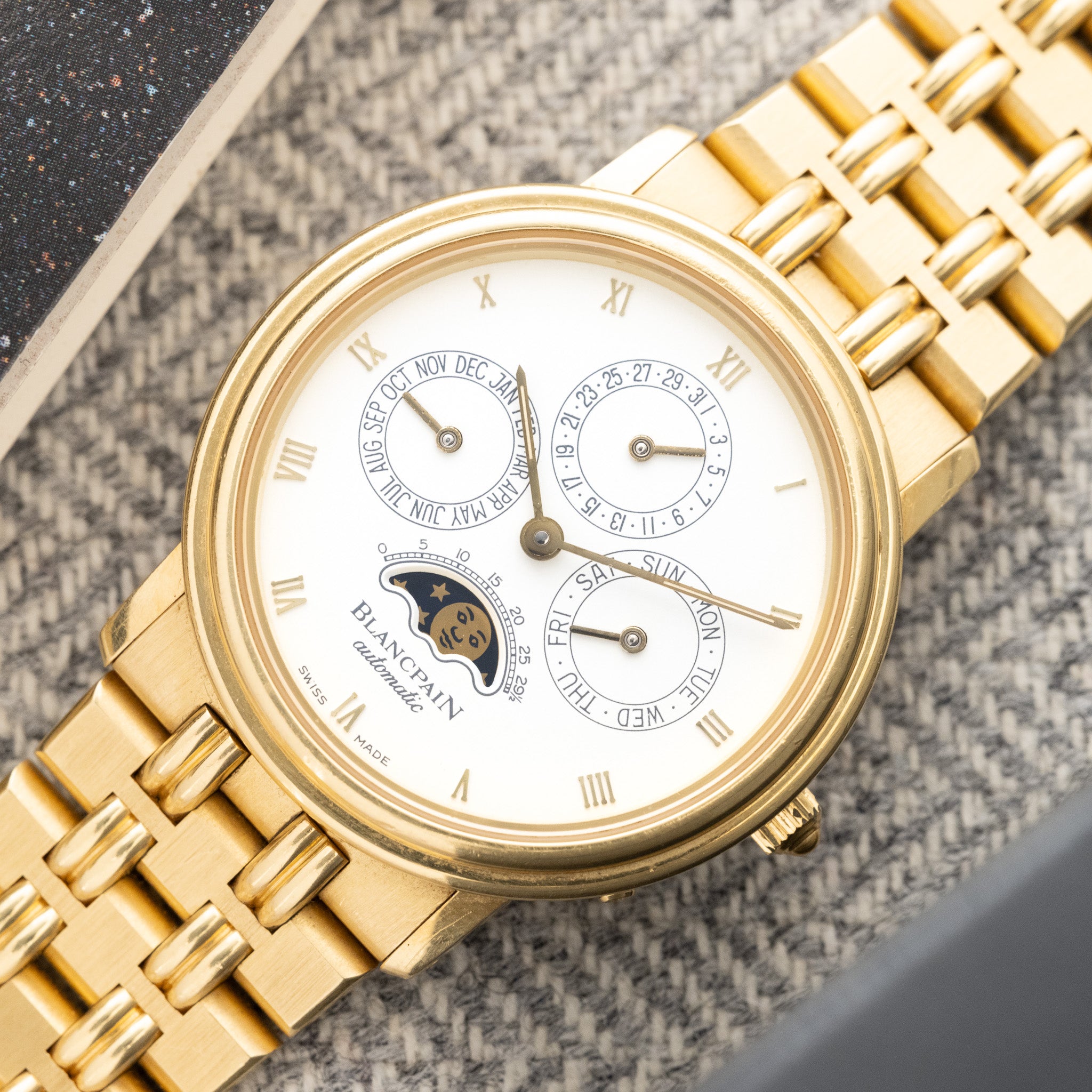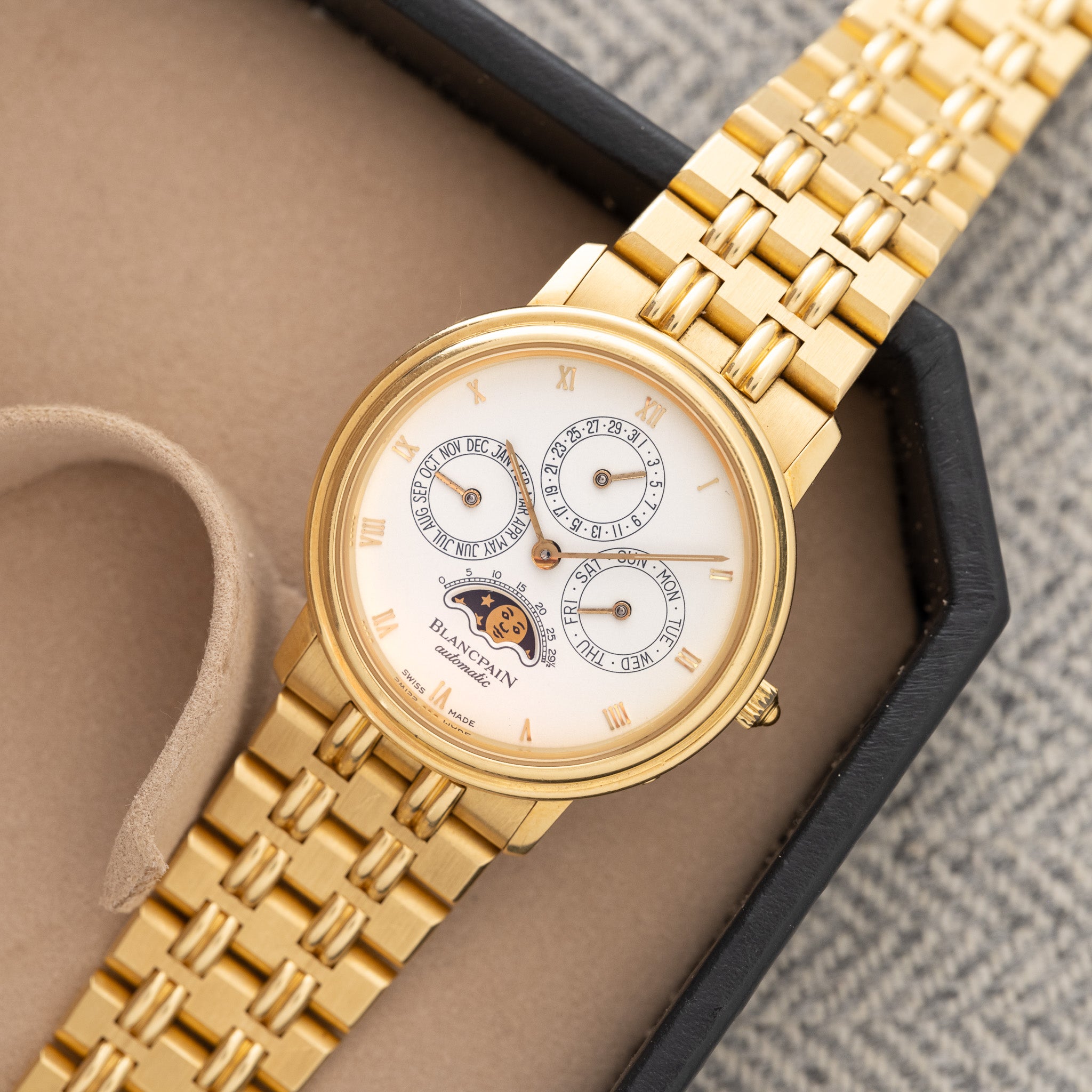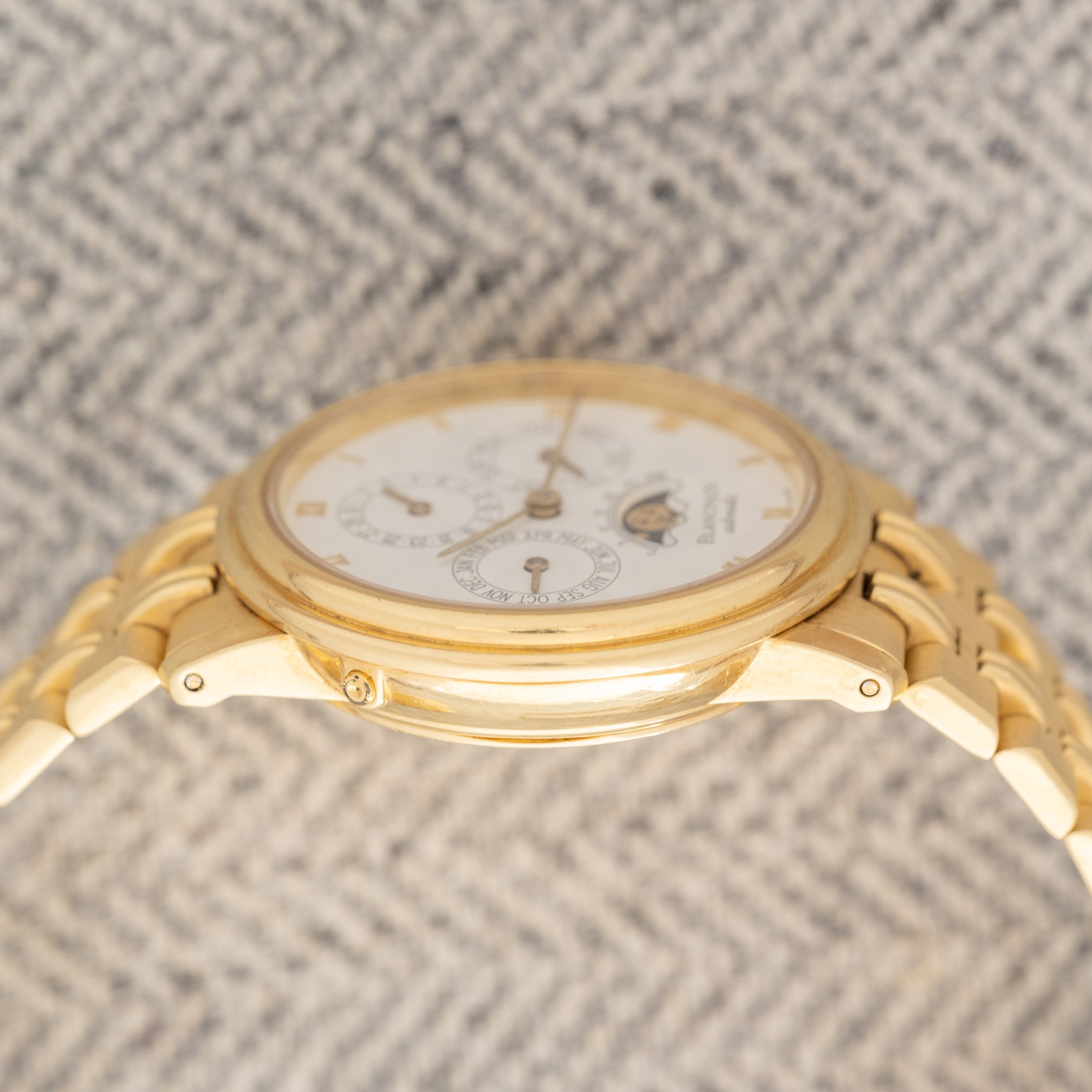 Two things make this particular example special. First, it is in an extraordinary state of preservation. The case is remarkably sharp and without a doubt presents a true unpolished example. The dial is in stunning mint condition without a mark or blemish on it. Second, the watch features the highly coveted and rare Gay Freres 18K gold bracelet. These bracelets were produced by renowned manufacturer Gay Freres for Blancpain and were an option available for purchase on the six masterpieces. The bracelets were prohibitively expensive at the time of retail, and very few can be found on Blancpains from this era. This particular bracelet exhibits no stretch and is in phenomenal condition. Several prominent collectors have commented that the bracelet is a must-have, and we agree that it is one of the best constructed, best wearing bracelets we have ever encountered. This watch presents an incredible opportunity not only to acquire a near perfect design with an exceptional bracelet, but also to obtain amazing value on a timepiece that continues to rise in collecting circles as one of the most important perpetual calendars of the era.