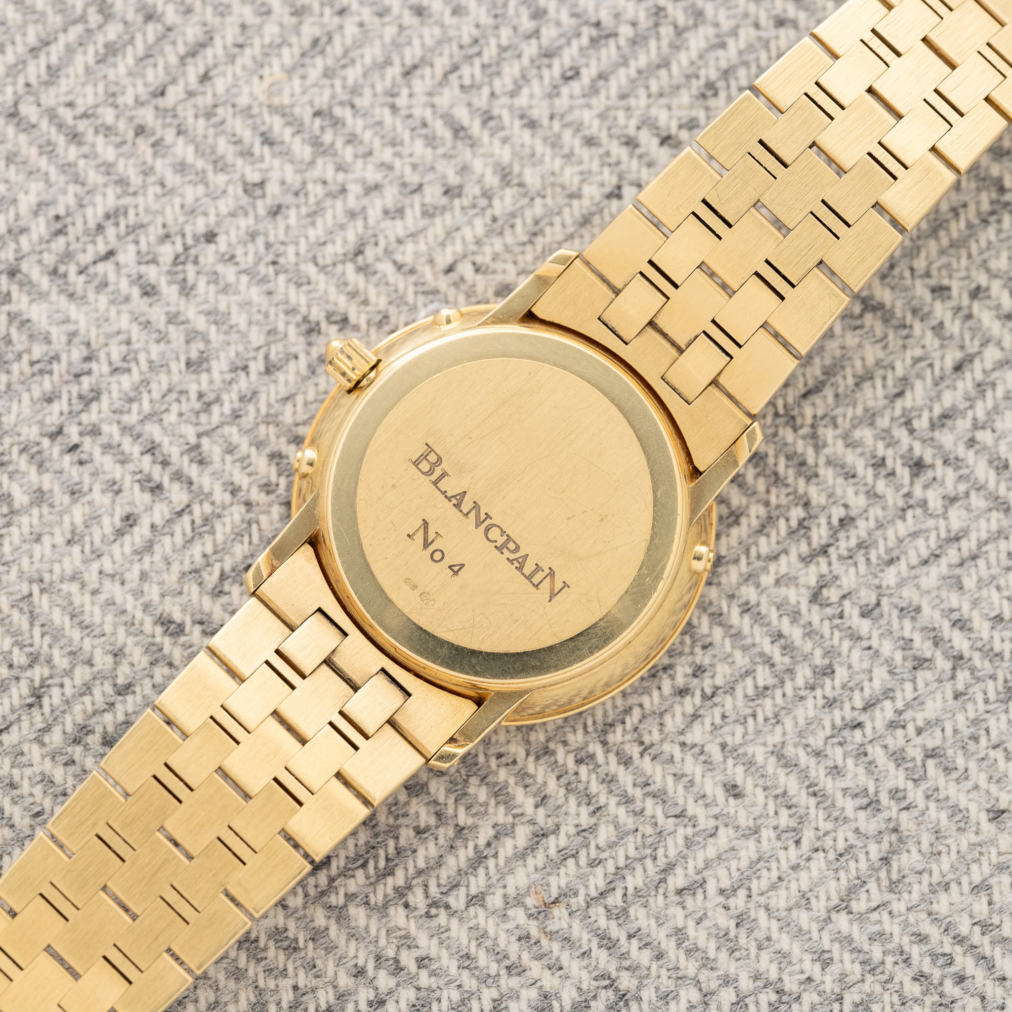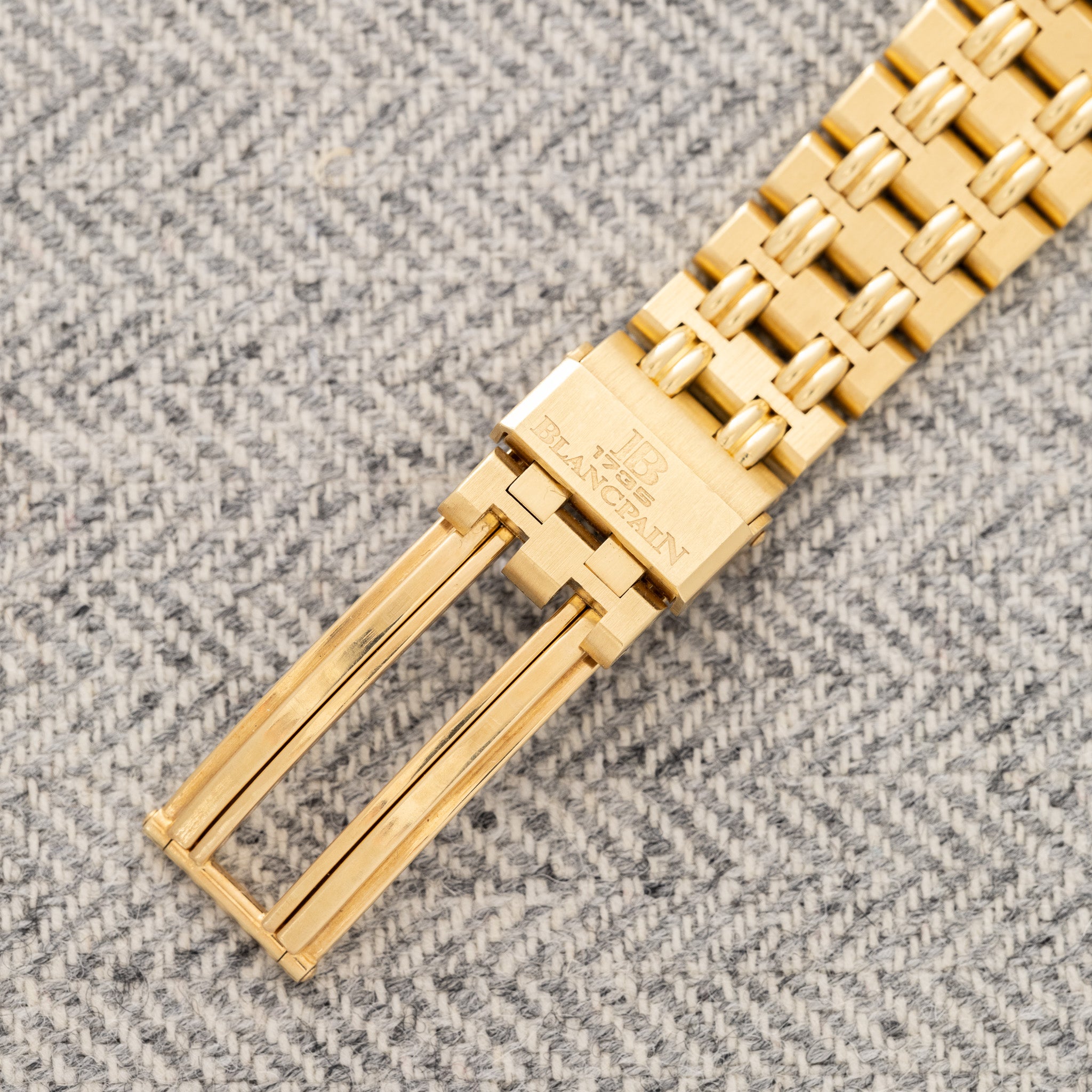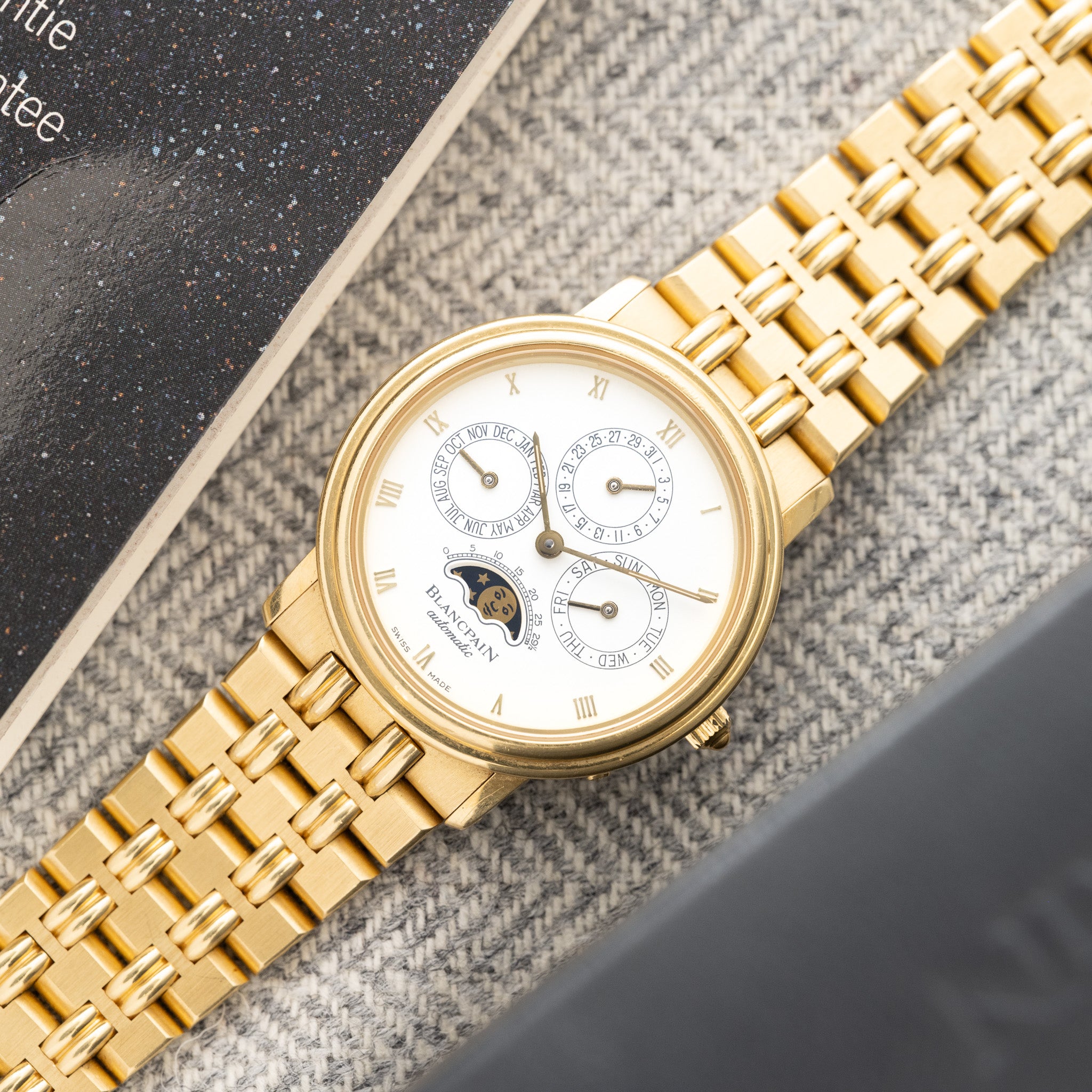 Two things make this particular example special. First, it is in an extraordinary state of preservation. The case is remarkably sharp and without a doubt presents a true unpolished example. The dial is in stunning mint condition without a mark or blemish on it. Second, the watch features the highly coveted and rare Gay Freres 18K gold bracelet. These bracelets were produced by renowned manufacturer Gay Freres for Blancpain and were an option available for purchase on the six masterpieces. The bracelets were prohibitively expensive at the time of retail, and very few can be found on Blancpains from this era. This particular bracelet exhibits no stretch and is in phenomenal condition. Several prominent collectors have commented that the bracelet is a must-have, and we agree that it is one of the best constructed, best wearing bracelets we have ever encountered. This watch presents an incredible opportunity not only to acquire a near perfect design with an exceptional bracelet, but also to obtain amazing value on a timepiece that continues to rise in collecting circles as one of the most important perpetual calendars of the era.