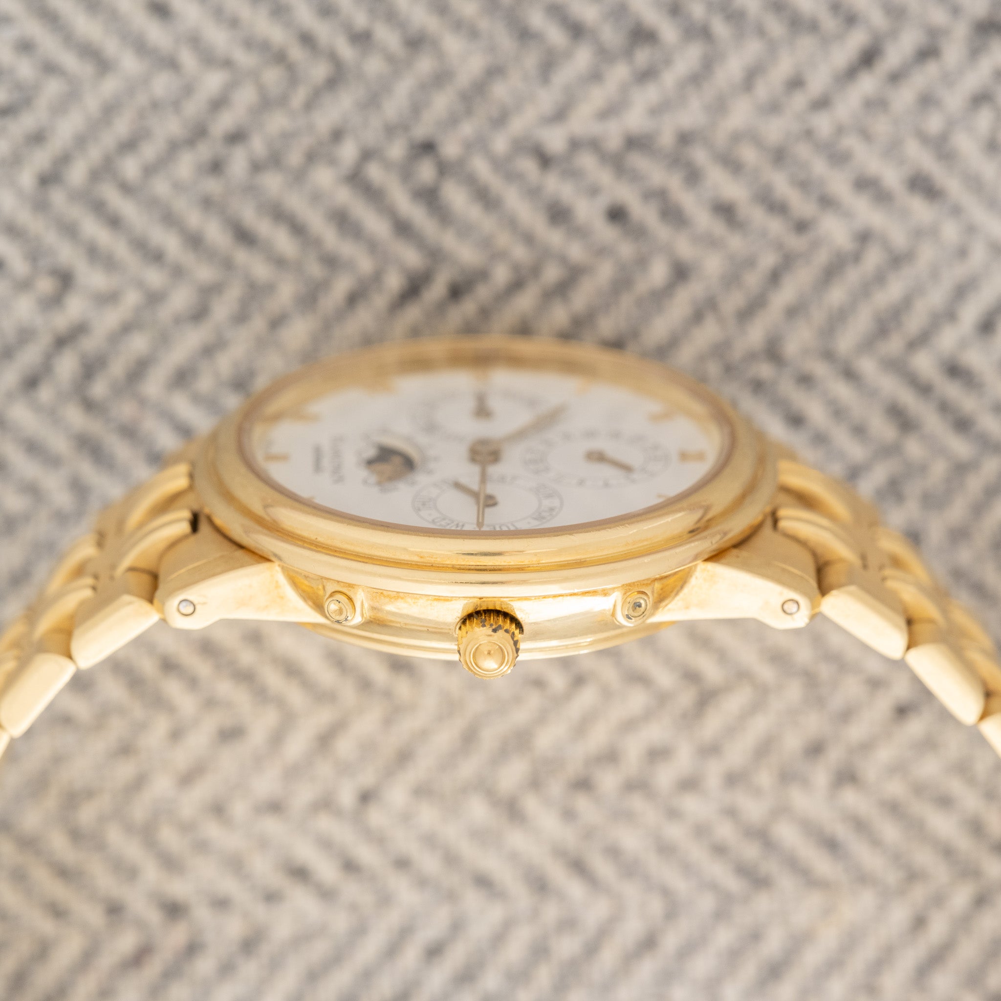 To re-launch the brand, Biver and Piguet produced what is now known as the “six masterpieces,” a collection that began with the triple calendar moonphase and ultra-thin time-only. Then, in 1986, came the Ref. 5395 Perpetual Calendar. The present example, from 1988, is presented in an unpolished 34mm x 9mm thick yellow gold case. The thin, elegant case is likely amongst the best wearing that we have ever encountered in a dress watch, no less a perpetual calendar. As acclaimed watch journalist Tony Traina stated in a 2023 Hodinkee Article about this watch, “With its three subdials and moonphase at 6 o’clock, the dial is beautiful and symmetrical and, to me, puts the watch alongside the ultra thin QPs [perpetual calendars] introduced by the big boys [Patek Philippe, Audemars Piguet, and Vacheron Constantin] around the same time (for a fraction of the price, might I add).” We could not have said it any better, and having handled these other ultra-thin perpetual calendars, some of which exceed six-figures in price, we believe this watch offers a near perfect design and incredible value.