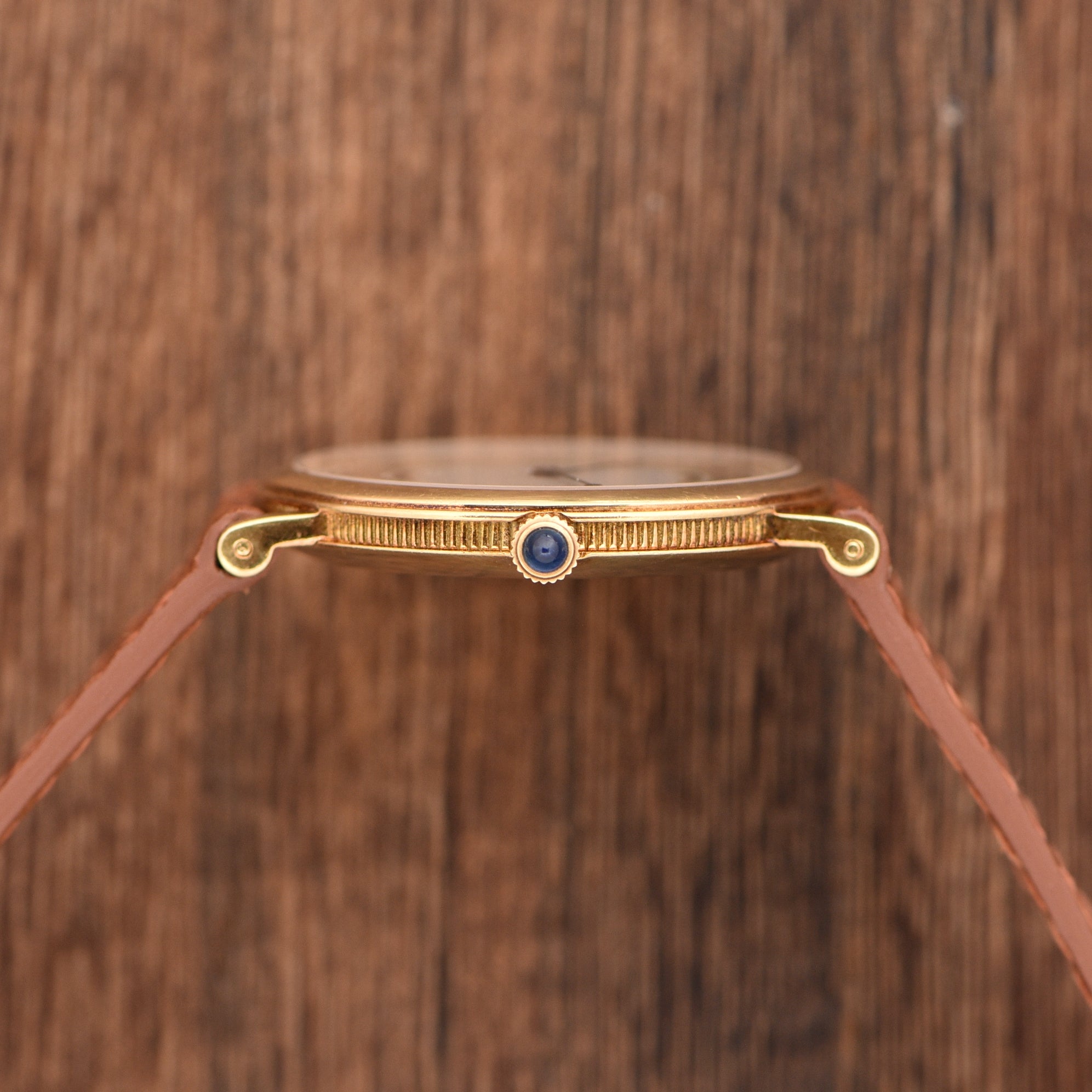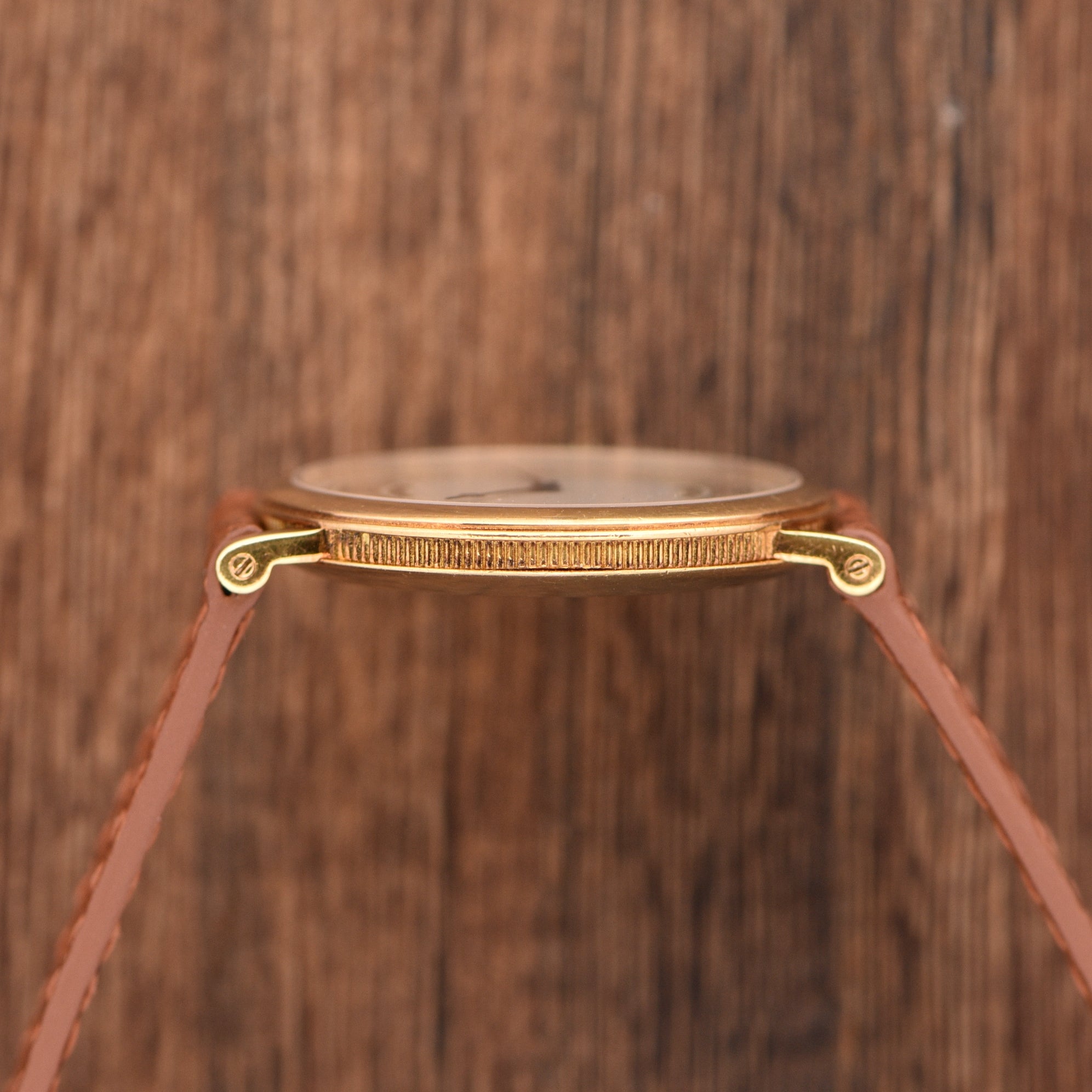 Case: The case size is 31.5 by 35.5mm. The case is 5.2mm thin, even with an automatic movement. The solid 18k gold case is in great condition. An earlier example with the French hallmarks on the caseback.