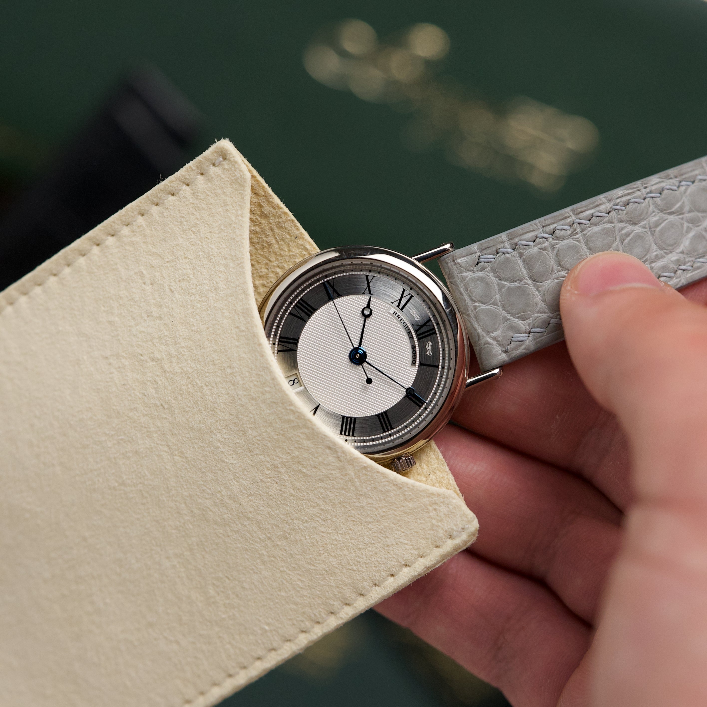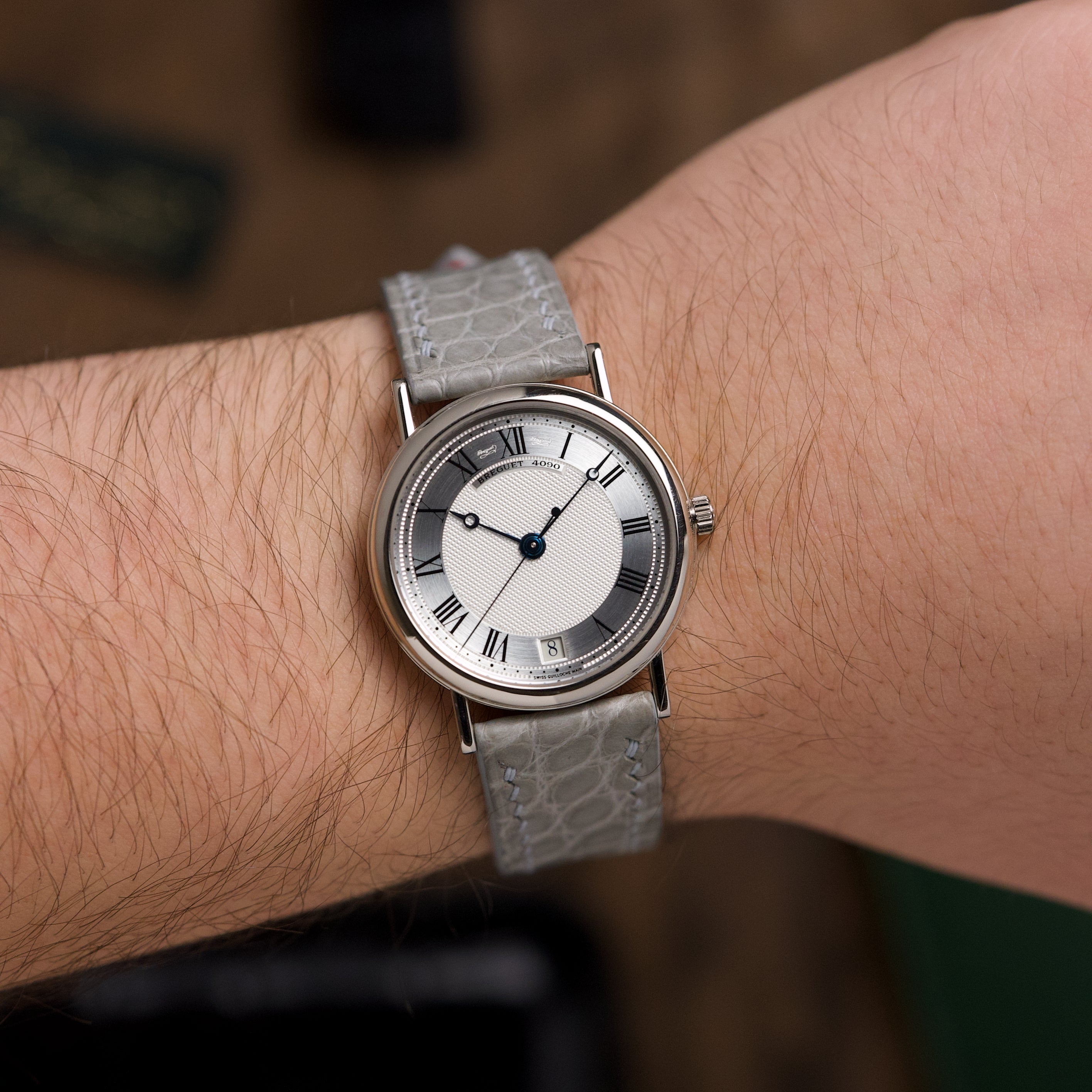 Dial: The spectacular guilloche dial is what Breguet is known for. The silver dial, with its guilloche and brushed finishes, is in great shape. The dial layout is clean with a well-placed date window at six o’clock. The blued Breguet hands are clean and show no discoloration.