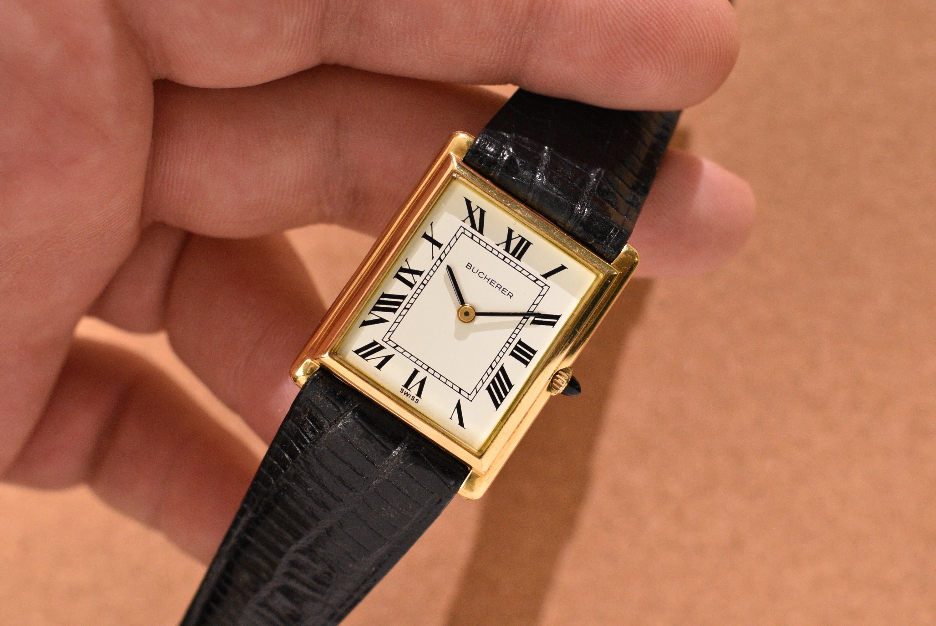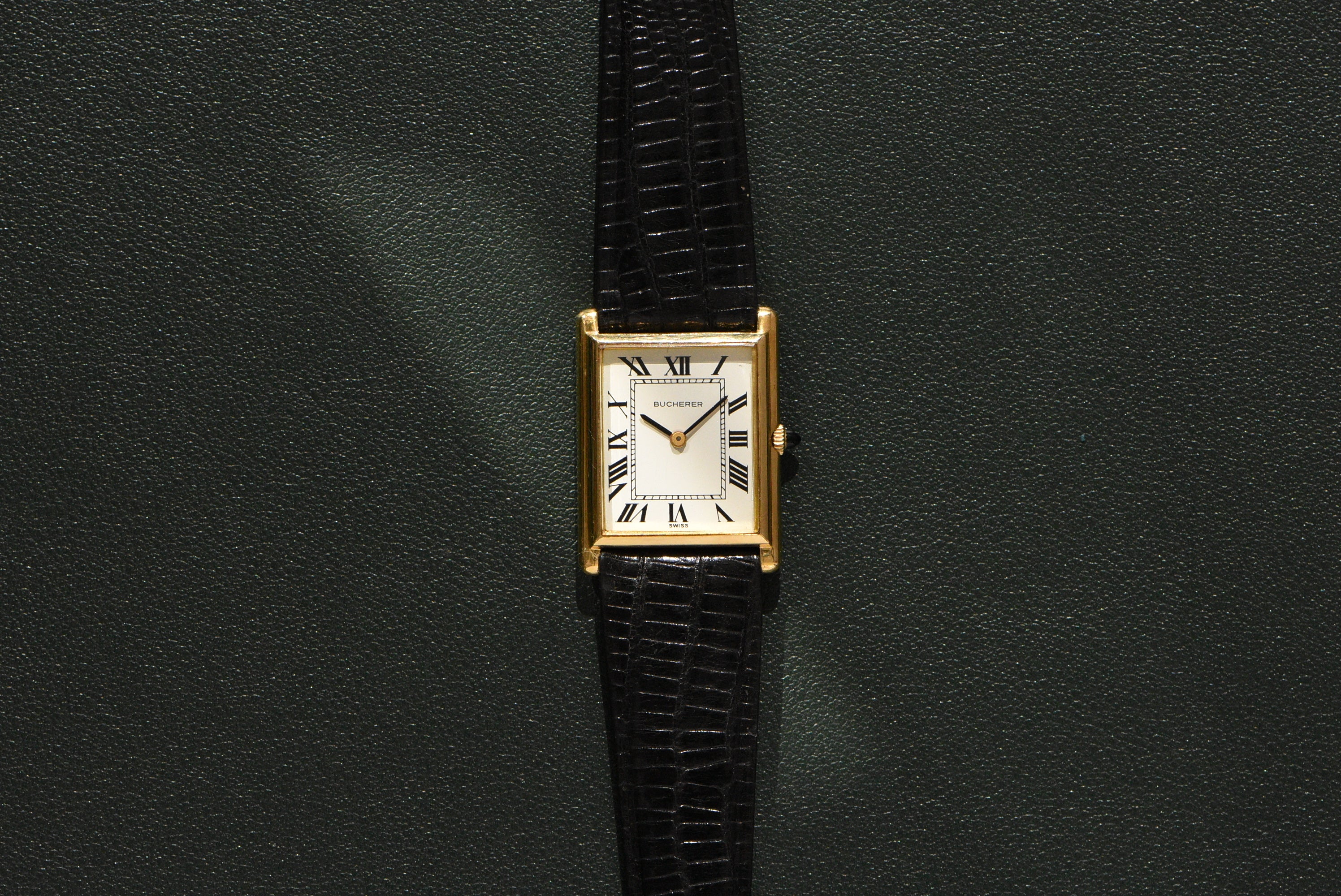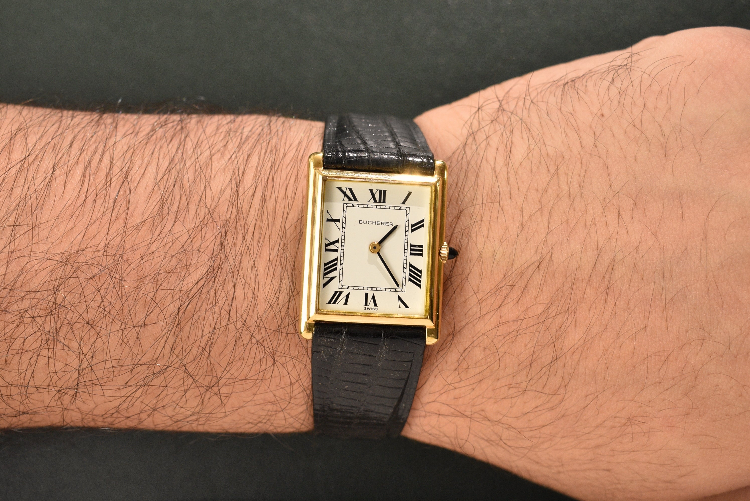 Known for their luxury jewelry retail stores, Bucherer once upon a time sold their own watches. Here is a very rare example of one of the more popular models. Their version of the Cartier Tank. This time with a solid gold stepped case in a larger case size. Housed inside is the same movement Cartier was using at the time also. So if you really think about it, for the money, this is a serious value proposition.