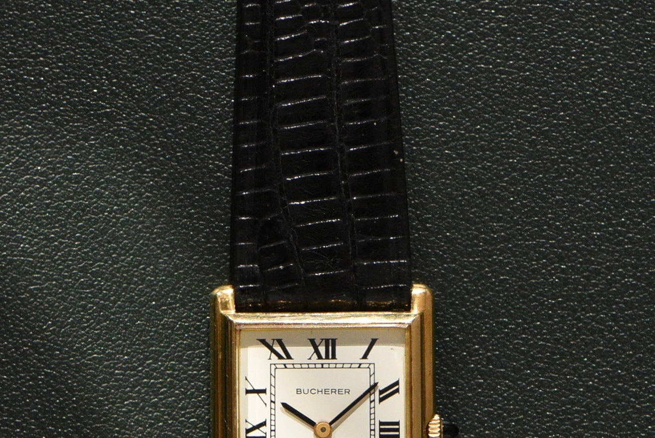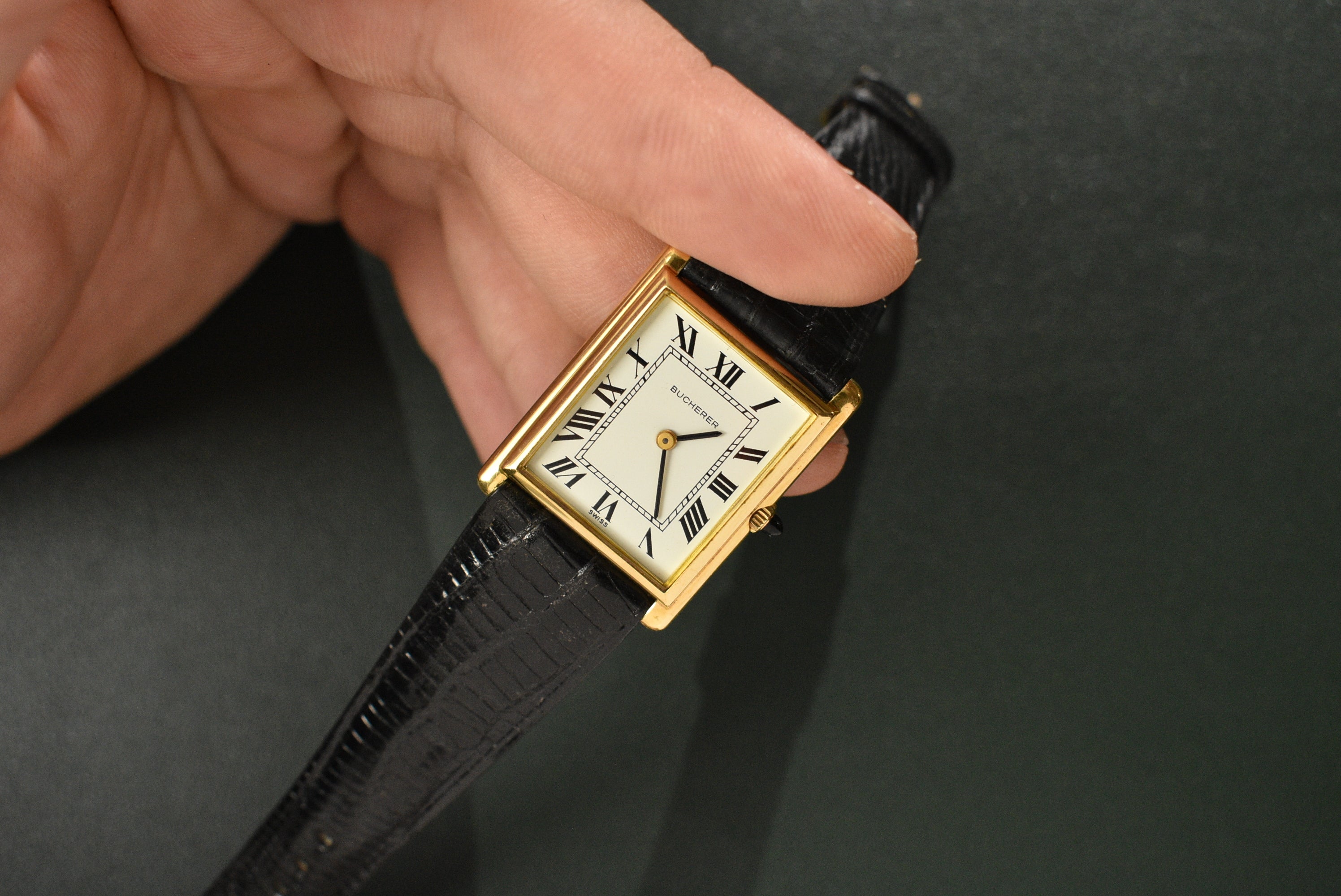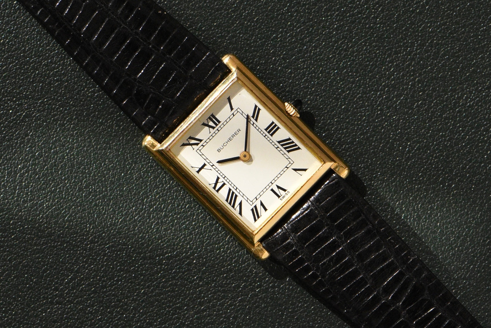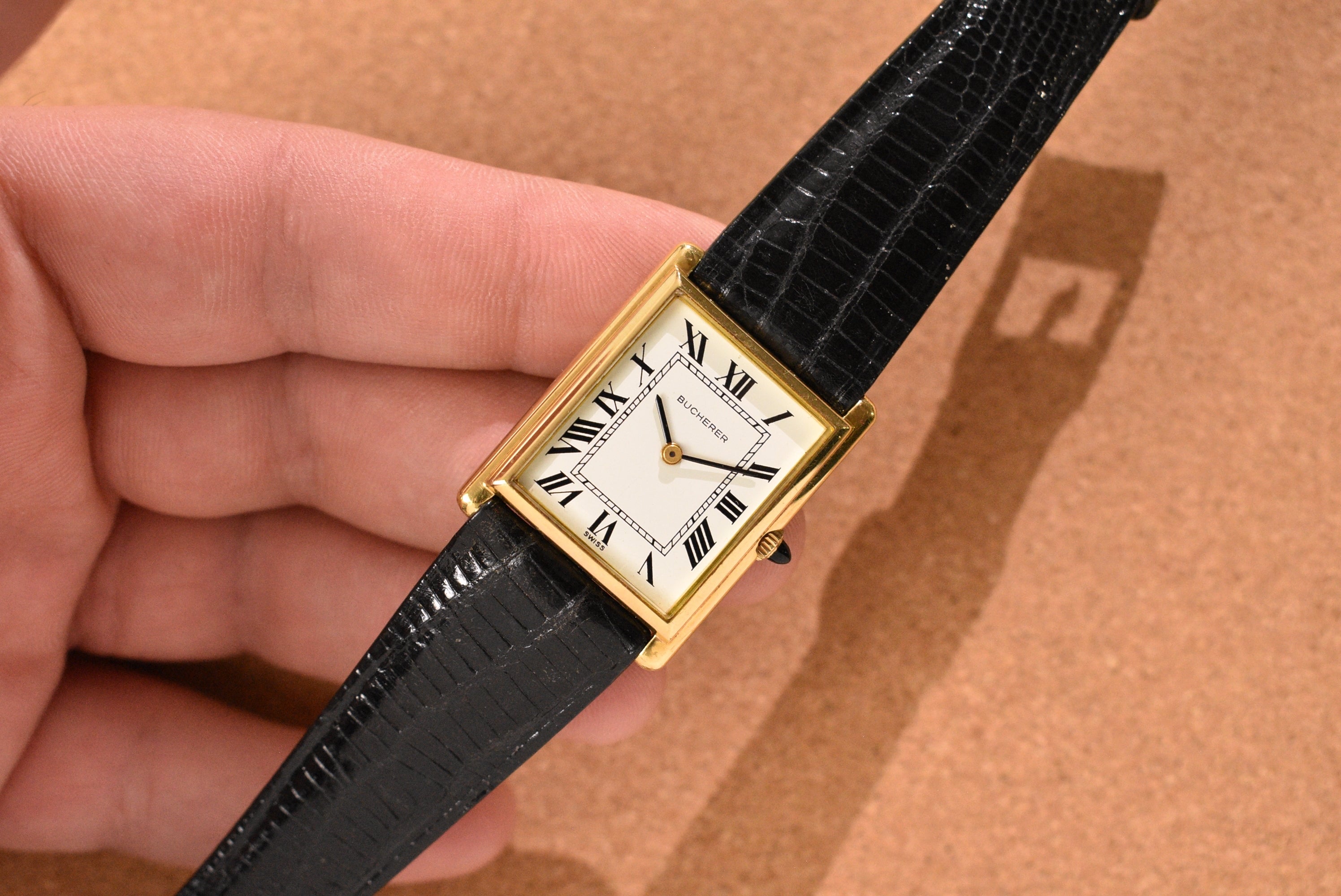 Known for their luxury jewelry retail stores, Bucherer once upon a time sold their own watches. Here is a very rare example of one of the more popular models. Their version of the Cartier Tank. This time with a solid gold stepped case in a larger case size. Housed inside is the same movement Cartier was using at the time also. So if you really think about it, for the money, this is a serious value proposition.
