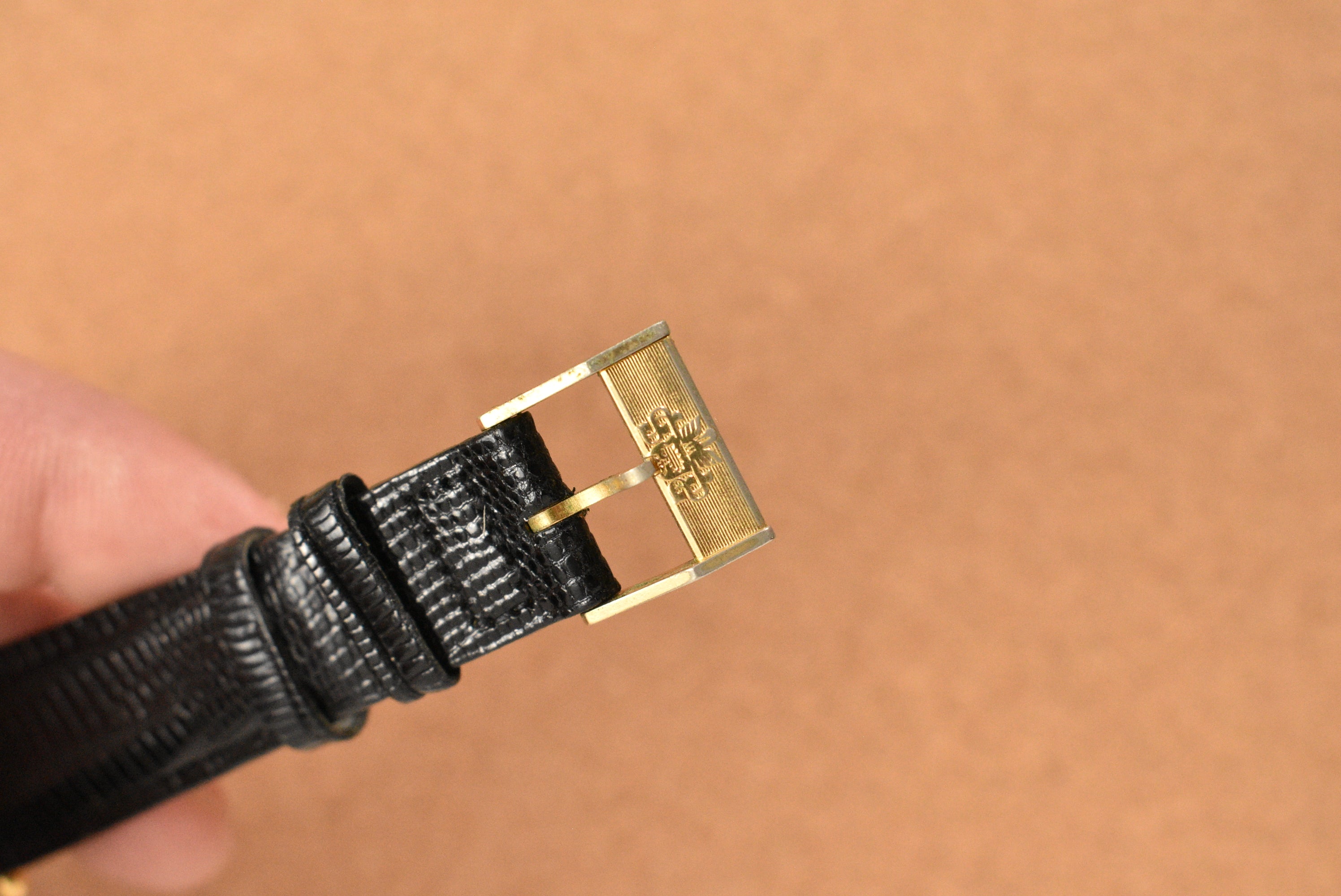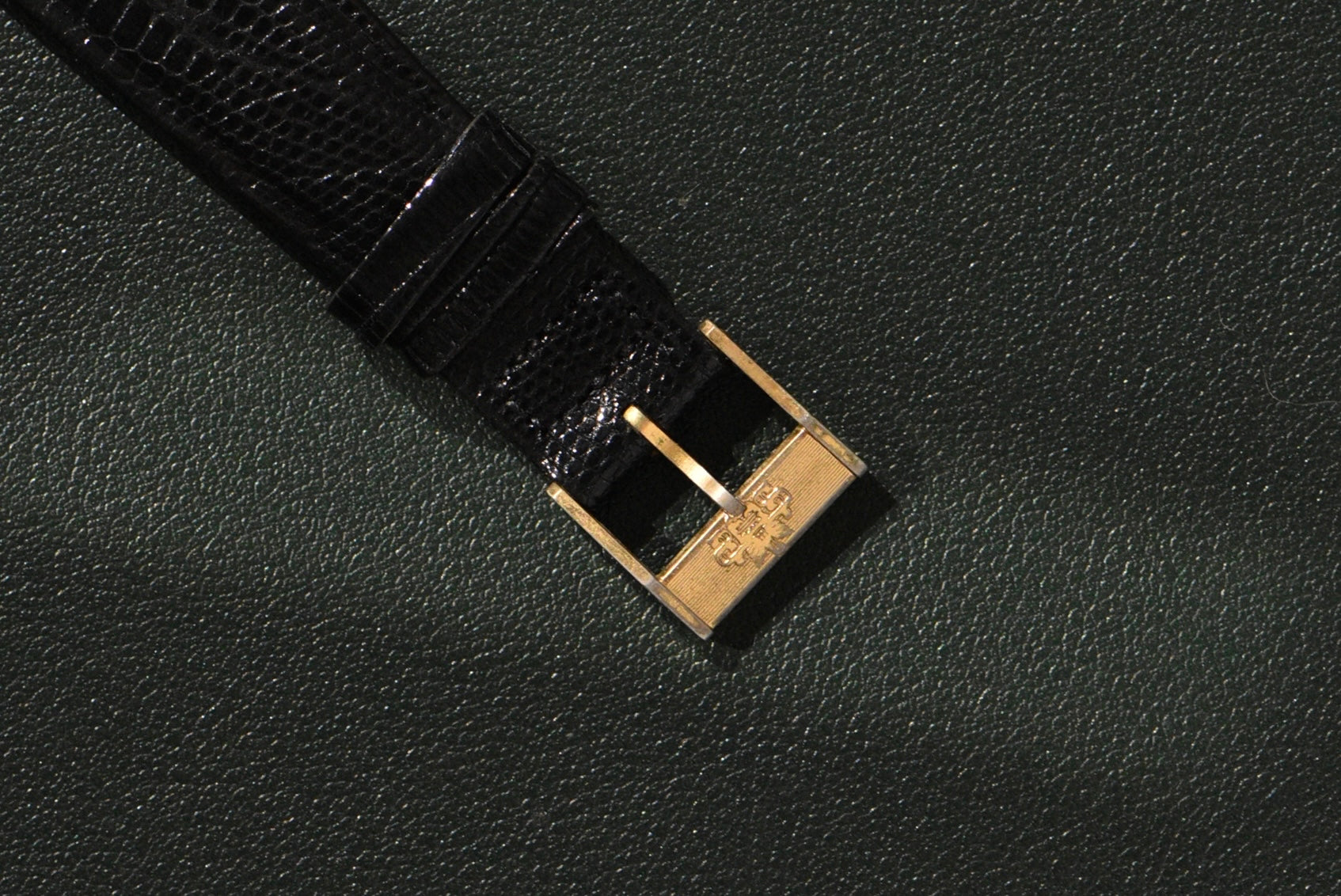 A very clean example of a super rare watch. Houses a manual ETA 2412 (same movement used by Chopard, Cartier, etc.). The solid gold case is unpolished and has all its markings still intact. The sapphire crystal has a few scratches but no cracks or nicks. The watch comes with its original buckle.