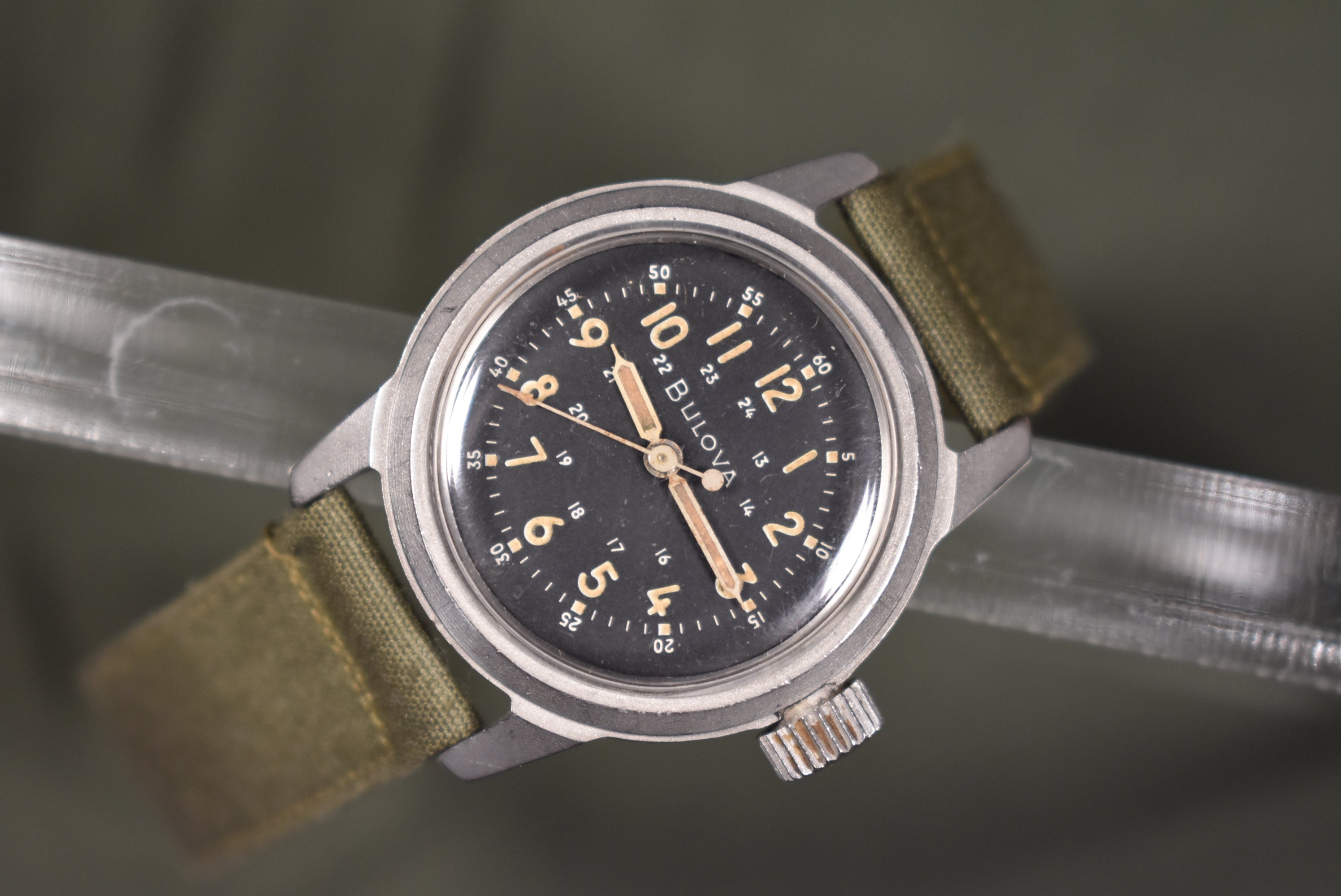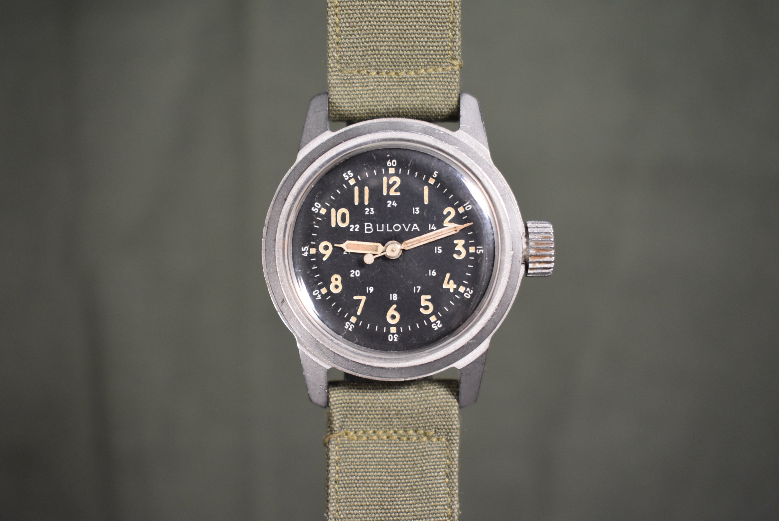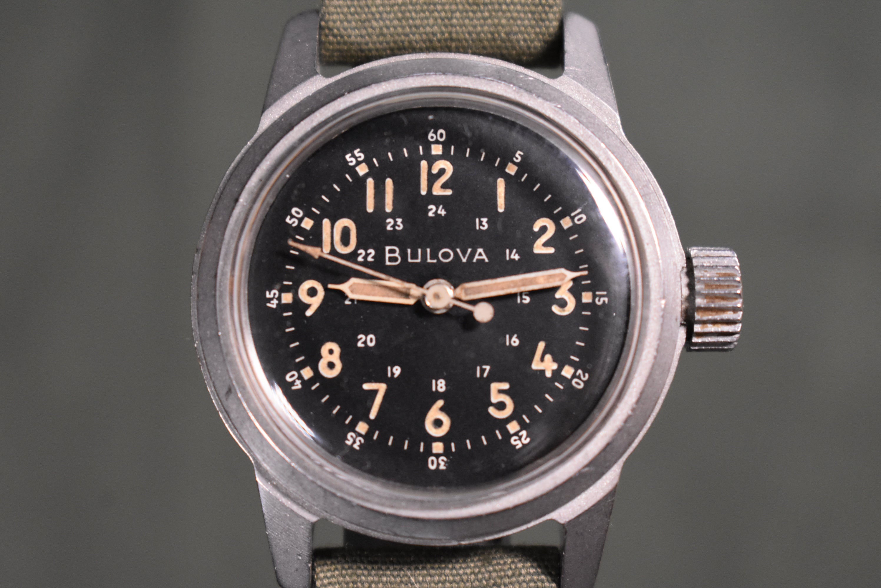 This is a stunning A17a used by the US Air Force. The watch features a stunning dial with beautiful pumpkin patina. The watch features a period-correct military strap also. This is a true stunner and looks amazing! It also makes a great investment seeing how much appreciation in price military watches have gotten recently. It is always fun to get these specific Bulova models in and when you get your hands on one you will understand why. The 32mm case doesn't feel small at all because of the chunky case and big crown. The watch has an amazing presence on the wrist and the 10BNCH movement can take a lot of beating to it and still run which is amazing.