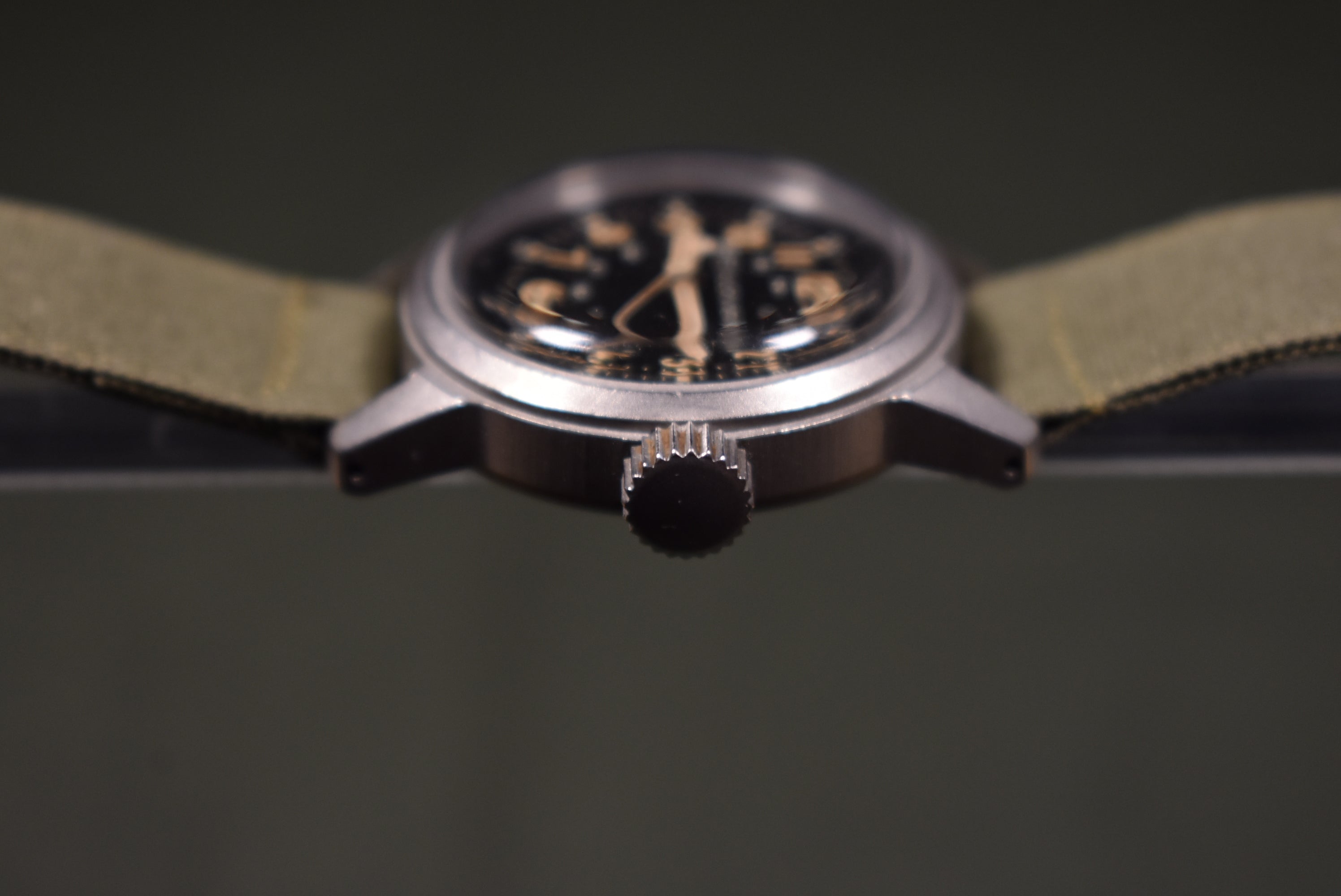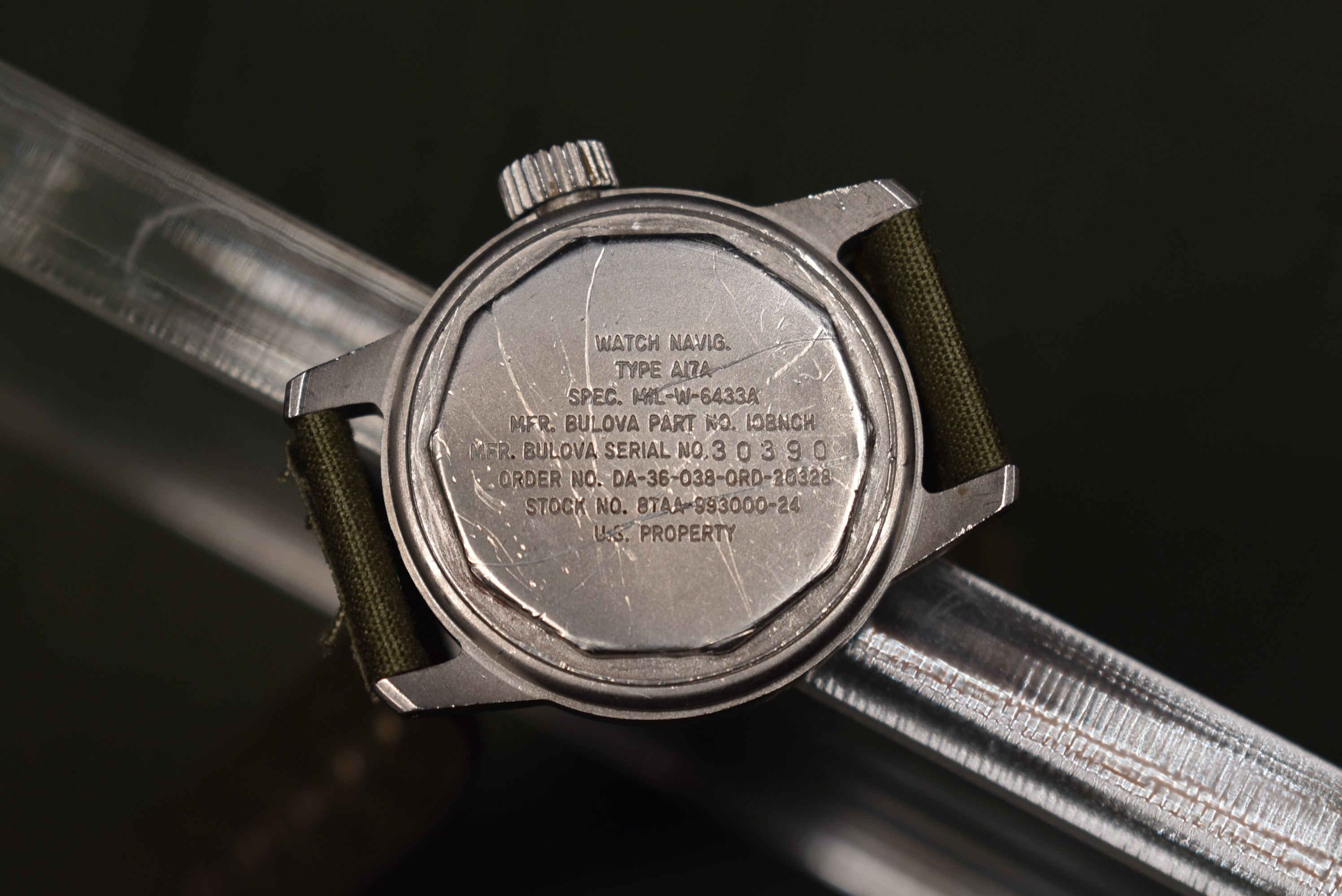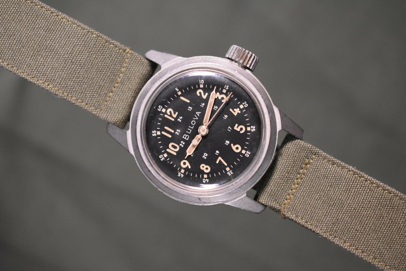 This is a stunning A17a used by the US Air Force. The watch features a stunning dial with beautiful pumpkin patina. The watch features a period-correct military strap also. This is a true stunner and looks amazing! It also makes a great investment seeing how much appreciation in price military watches have gotten recently. It is always fun to get these specific Bulova models in and when you get your hands on one you will understand why. The 32mm case doesn't feel small at all because of the chunky case and big crown. The watch has an amazing presence on the wrist and the 10BNCH movement can take a lot of beating to it and still run which is amazing.