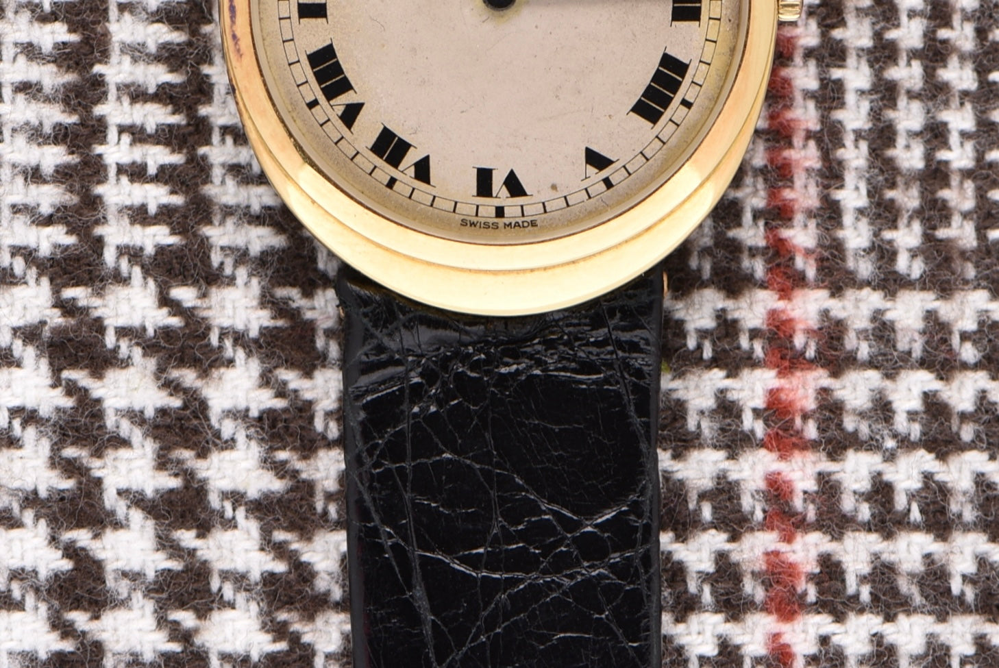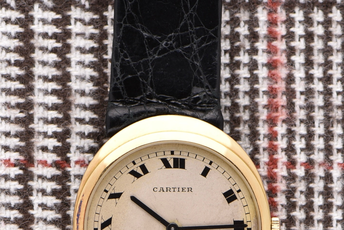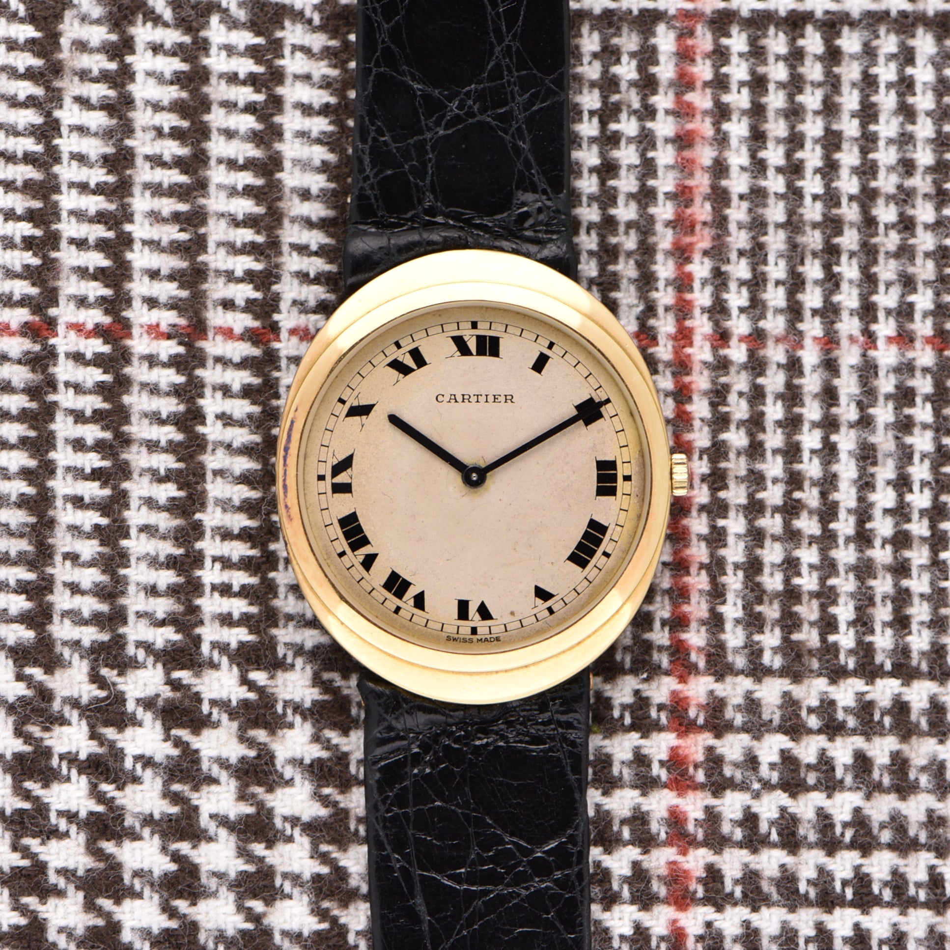 What we have here is a combination of three brands: Cartier, Bueche Girod, and Frederic Piguet. Piguet was the go-to for watchmakers looking to house an ultraslim manual movement in their watches. Even though the movement is signed BG, it's a Piguet movement. The case is solid gold and signed by Bueche. It is a very unique oval stepped case. Then the dial, signed Cartier, means it was retailed by the brand. The dial features a stunning matte finish with large deco hands. The CARTIER font is also unique to the era. These elliptical Cartiers don't come up often so it's a pleasure to have one offered in the shop!
