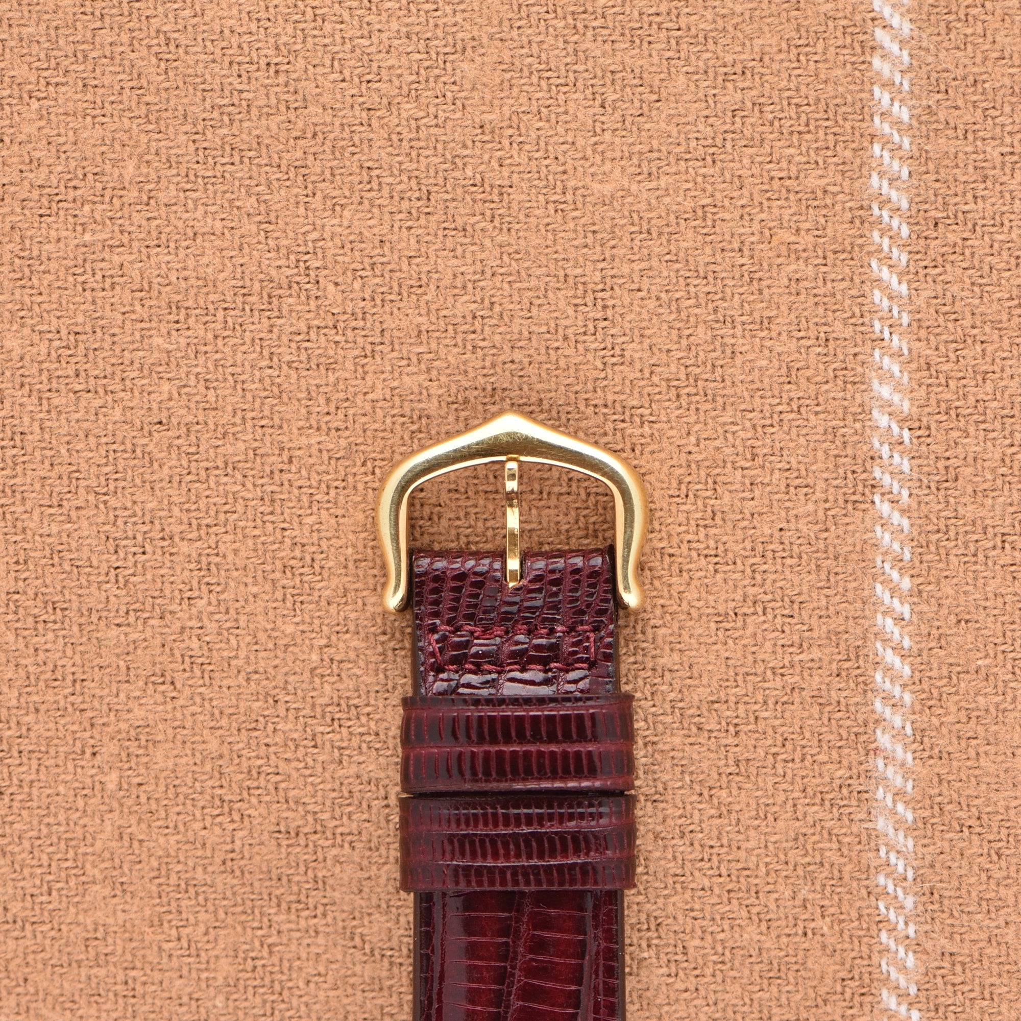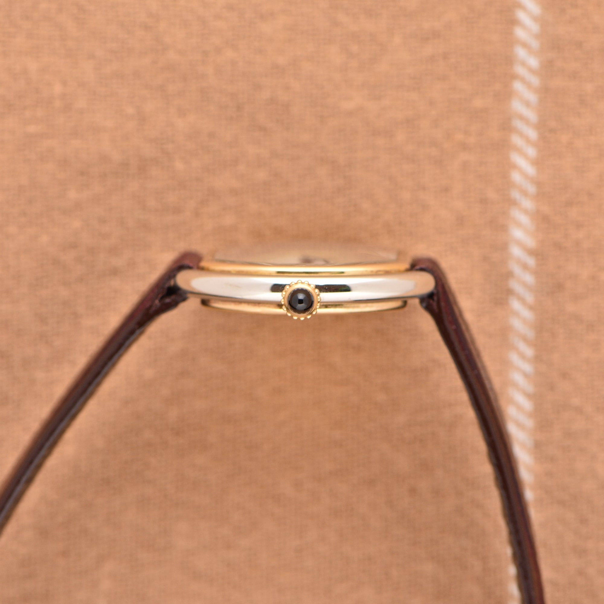 The stepped case is in white and yellow gold. The watch has its original cabochon crown and Paris dial. The dial is in very nice condition with very little lacquer wear. The watch comes with a gold-plated Cartier buckle.