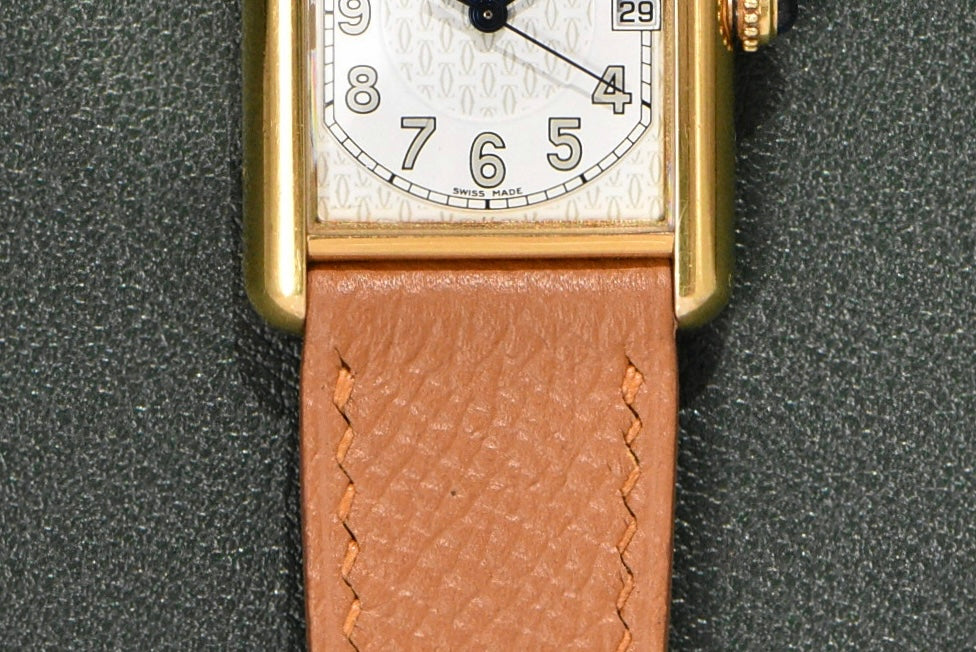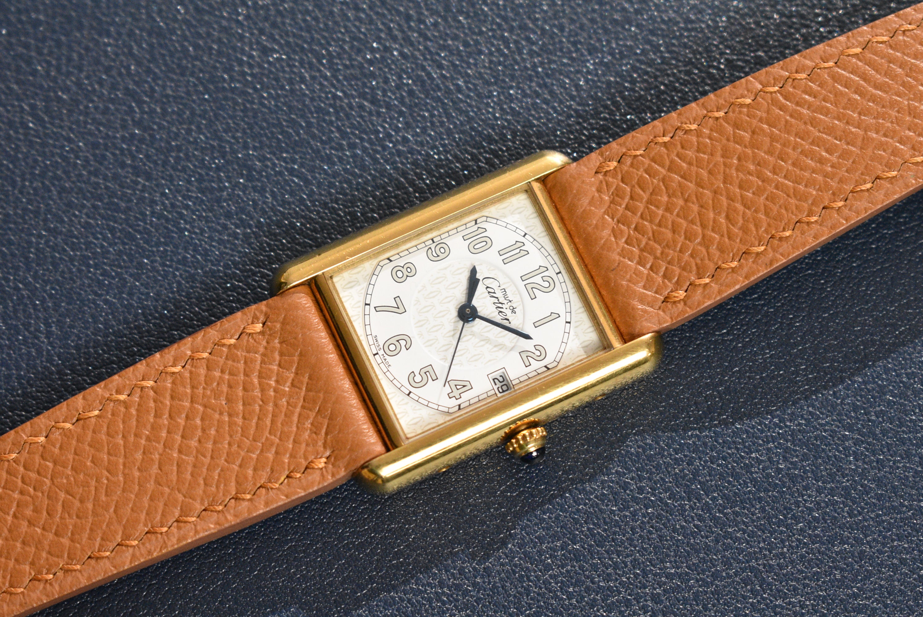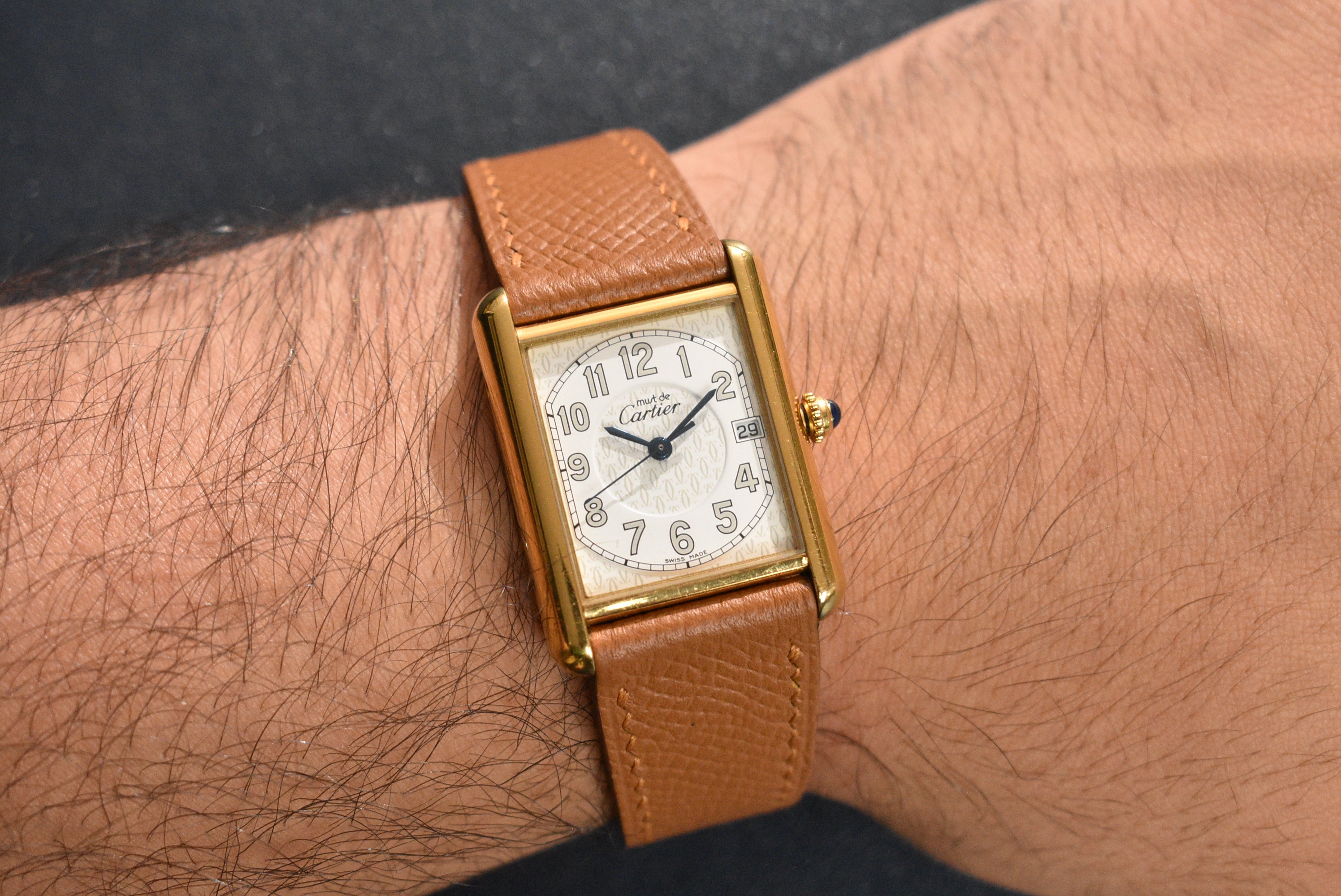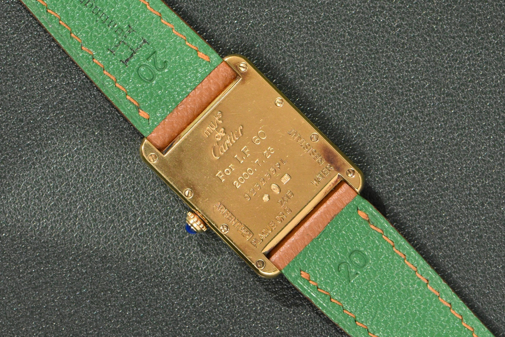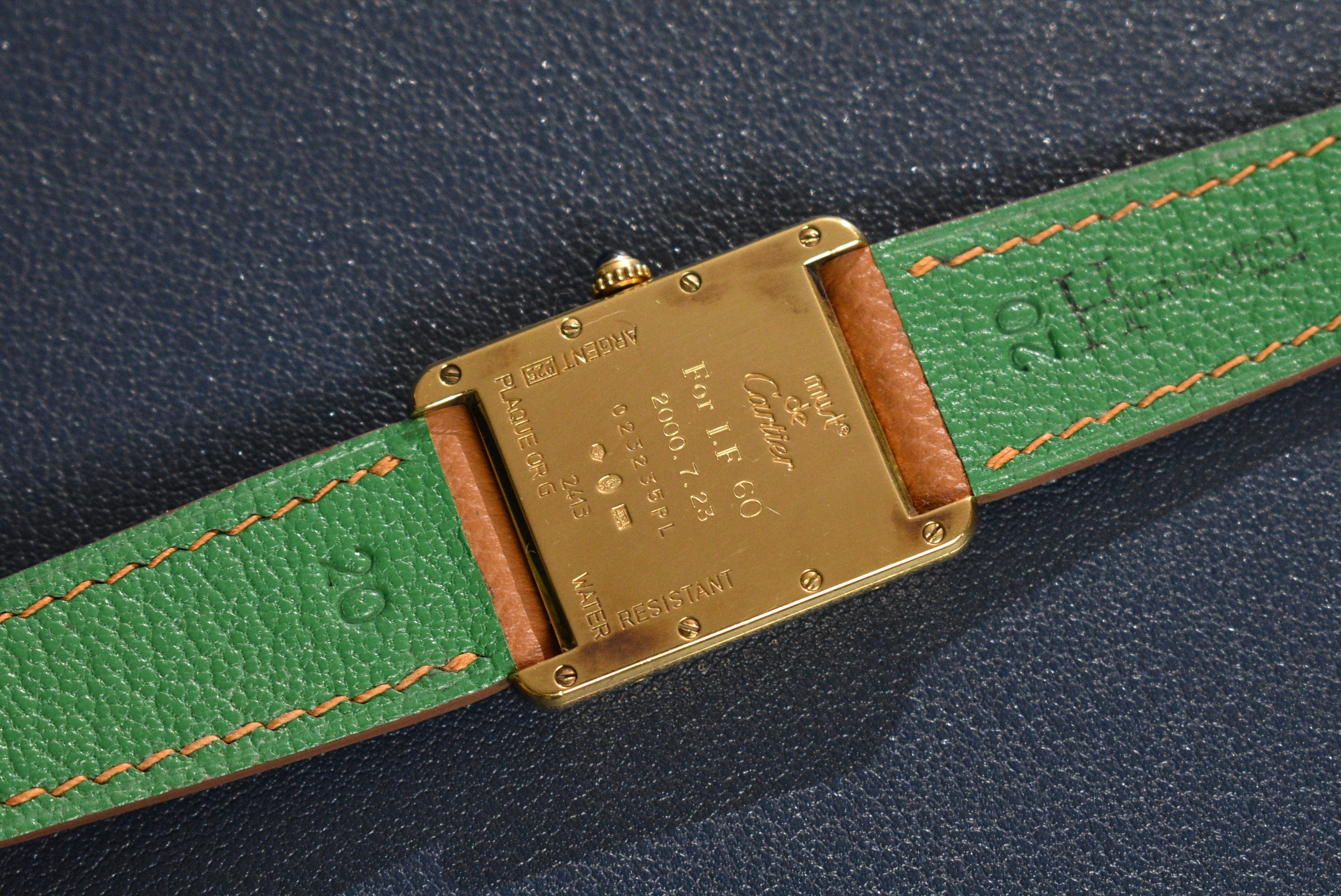 All around, this rare jumbo Tank is in great condition. The rare dial is very clean. The case has no serious wear. It also has no wear on the gold plating. The case back has a small engraving from 2000. The watch comes on our handmade strap with its original Cartier buckle
