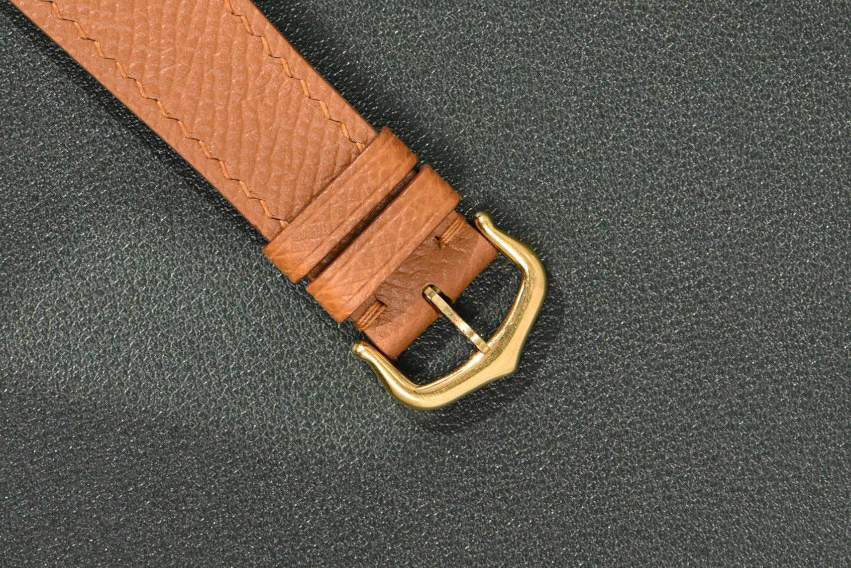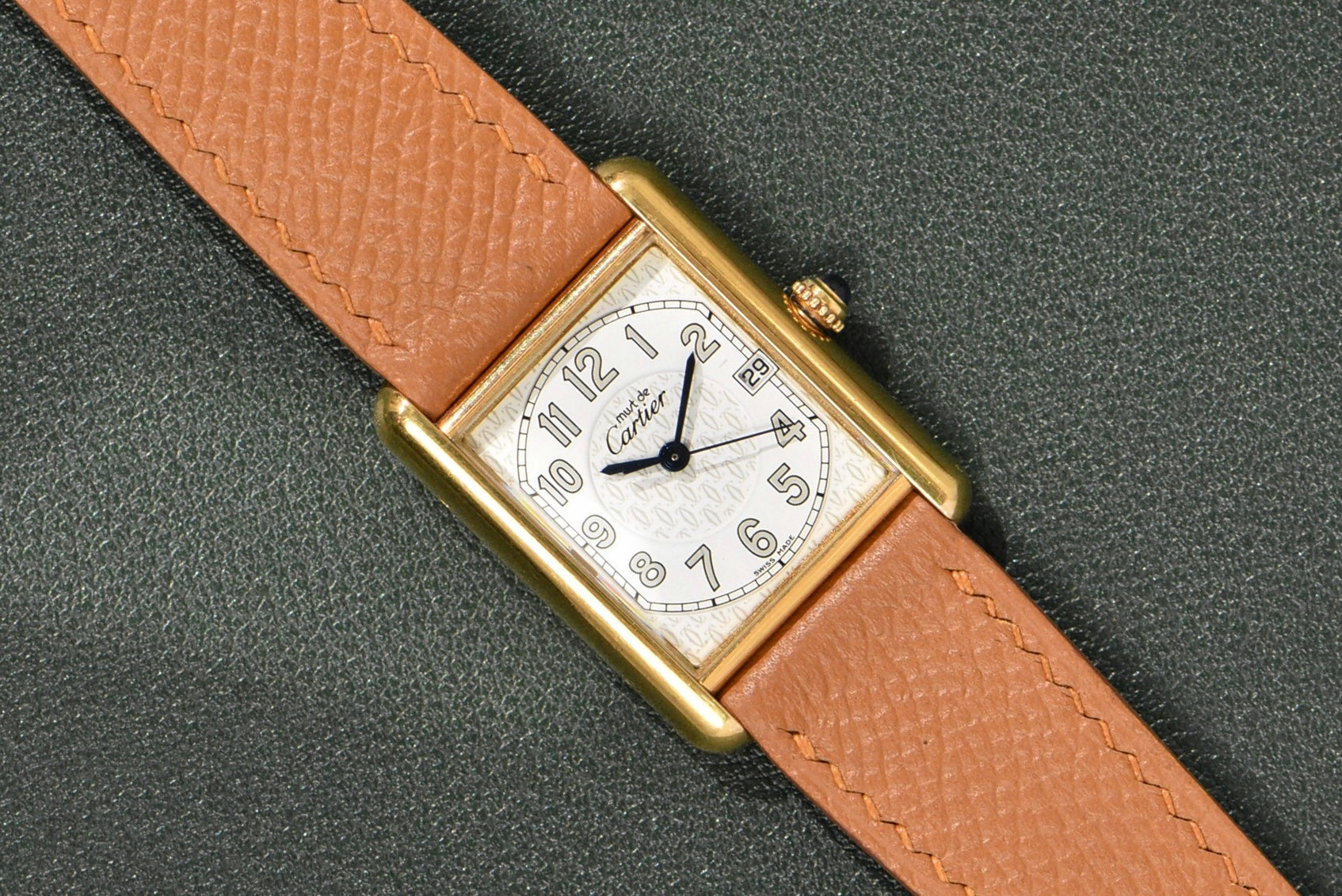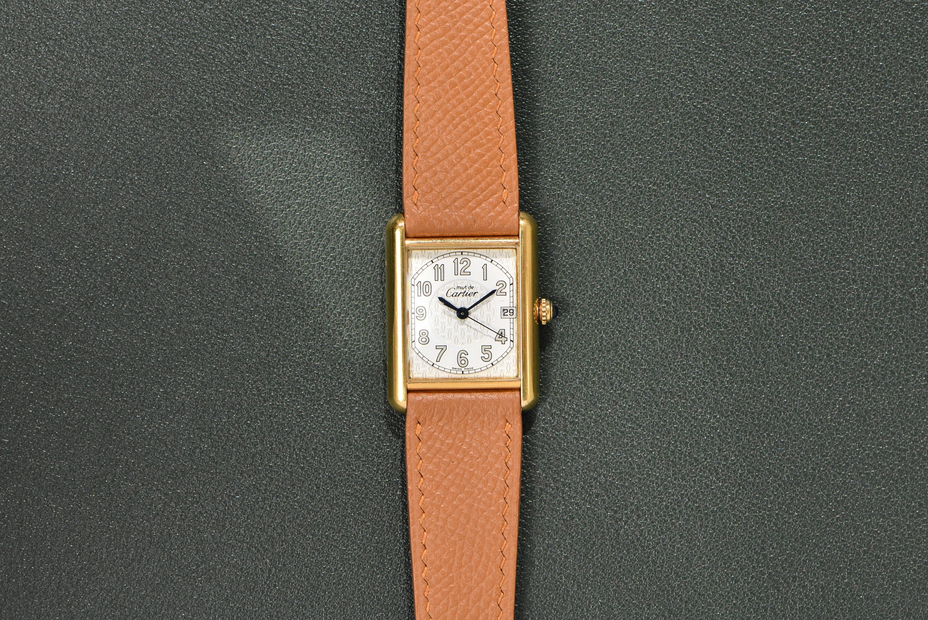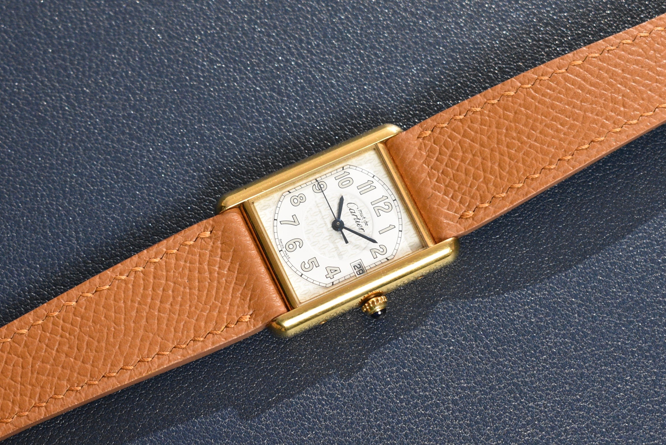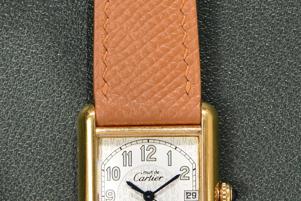 All around, this rare jumbo Tank is in great condition. The rare dial is very clean. The case has no serious wear. It also has no wear on the gold plating. The case back has a small engraving from 2000. The watch comes on our handmade strap with its original Cartier buckle