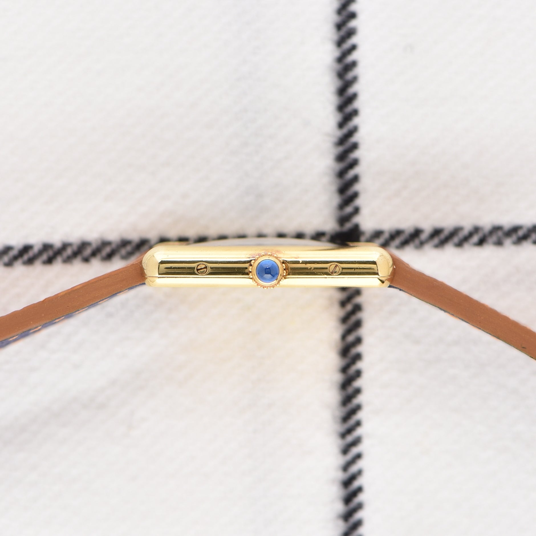 The Must de Cartier line, created by Robert Hocq and Alain-Dominique Perrin, aimed to attract new customers by offering accessories and leather goods with the essence of Cartier. The Must de Cartier Tank wristwatch was the brand's most iconic item, made from sterling silver with a minimum of 10k plating at 2.5 microns thick. Launched in 1976, the line marked key milestones for the brand, including being the first non-precious metal watch and the first mass-produced watch. The brand produced around 3000 watches per year before the Must line, and by the end of the 70s, they were producing over 160,000 watches per year. The dials varied, with faux-stone dials resembling onyx and lapis, lacquer dials in wood and tortoiseshell, and the Trinity dial featuring five stripes in a center section in yellow, white, and rose gold. The Trinity dial was a favorite among fans.