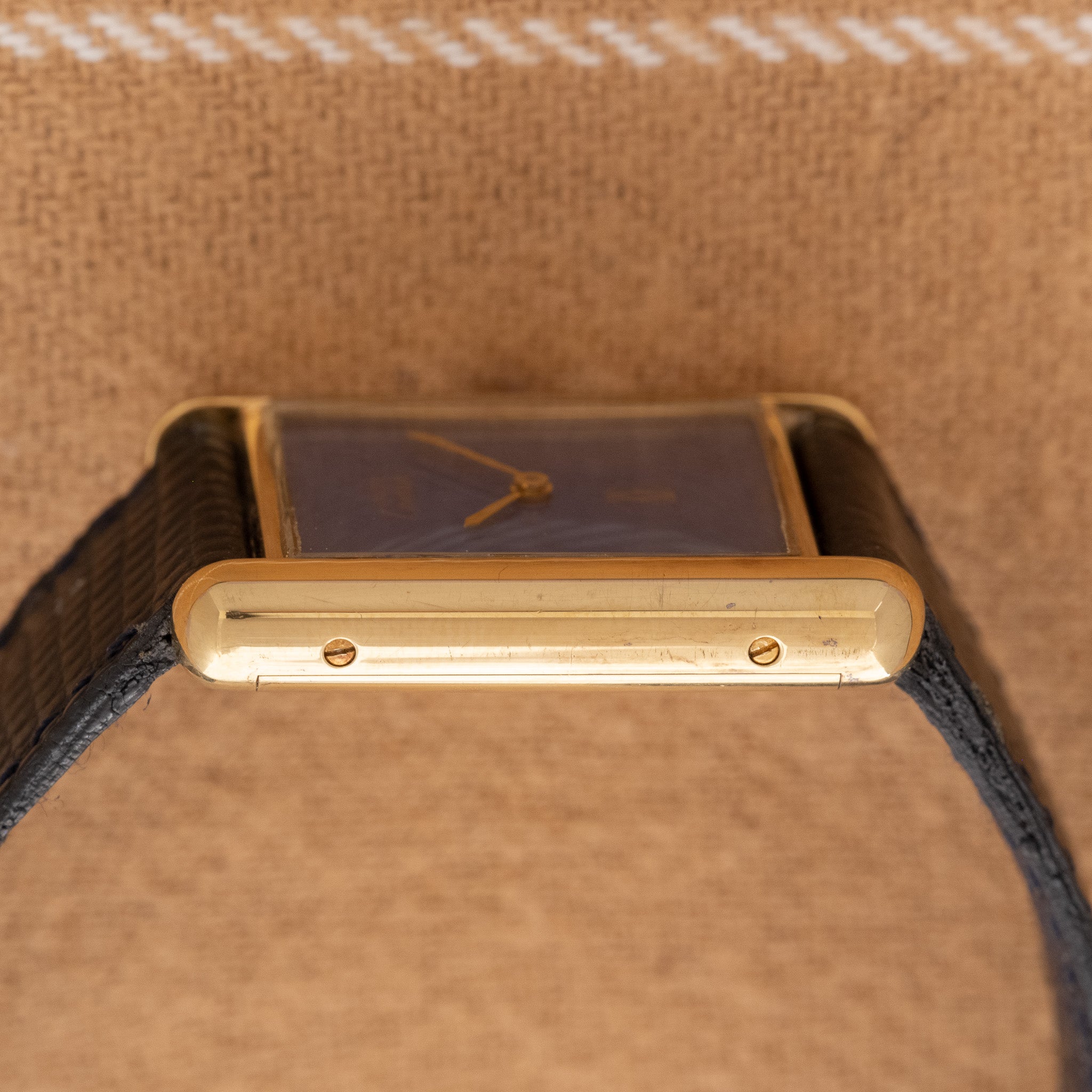 Case: The large size Tank case is 23x30mm. The case is in fantastic condition. The gold plating is thick and even.