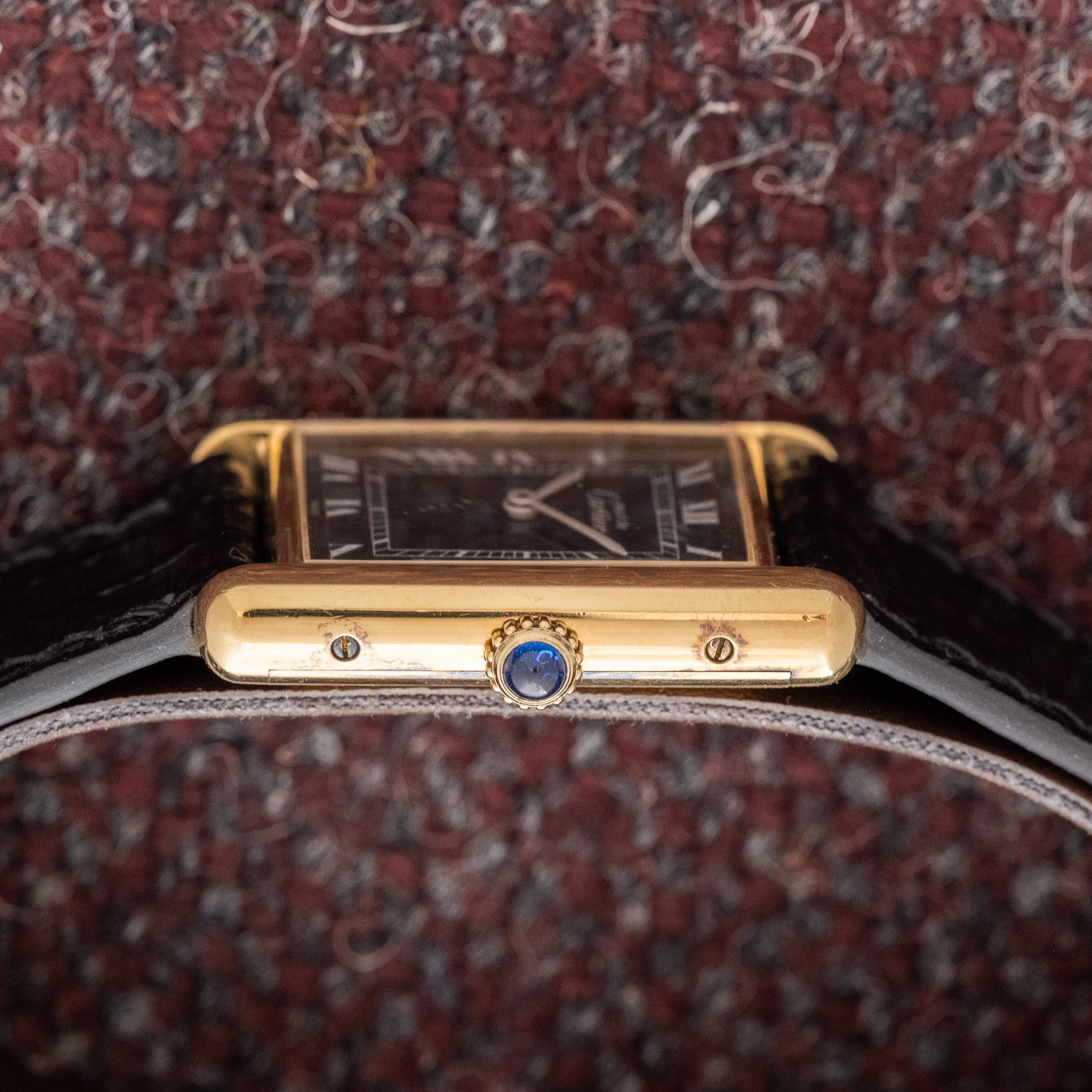 Case: The large size Tank case is 23x30mm. The case is in fantastic condition. The gold plating is thick and even.