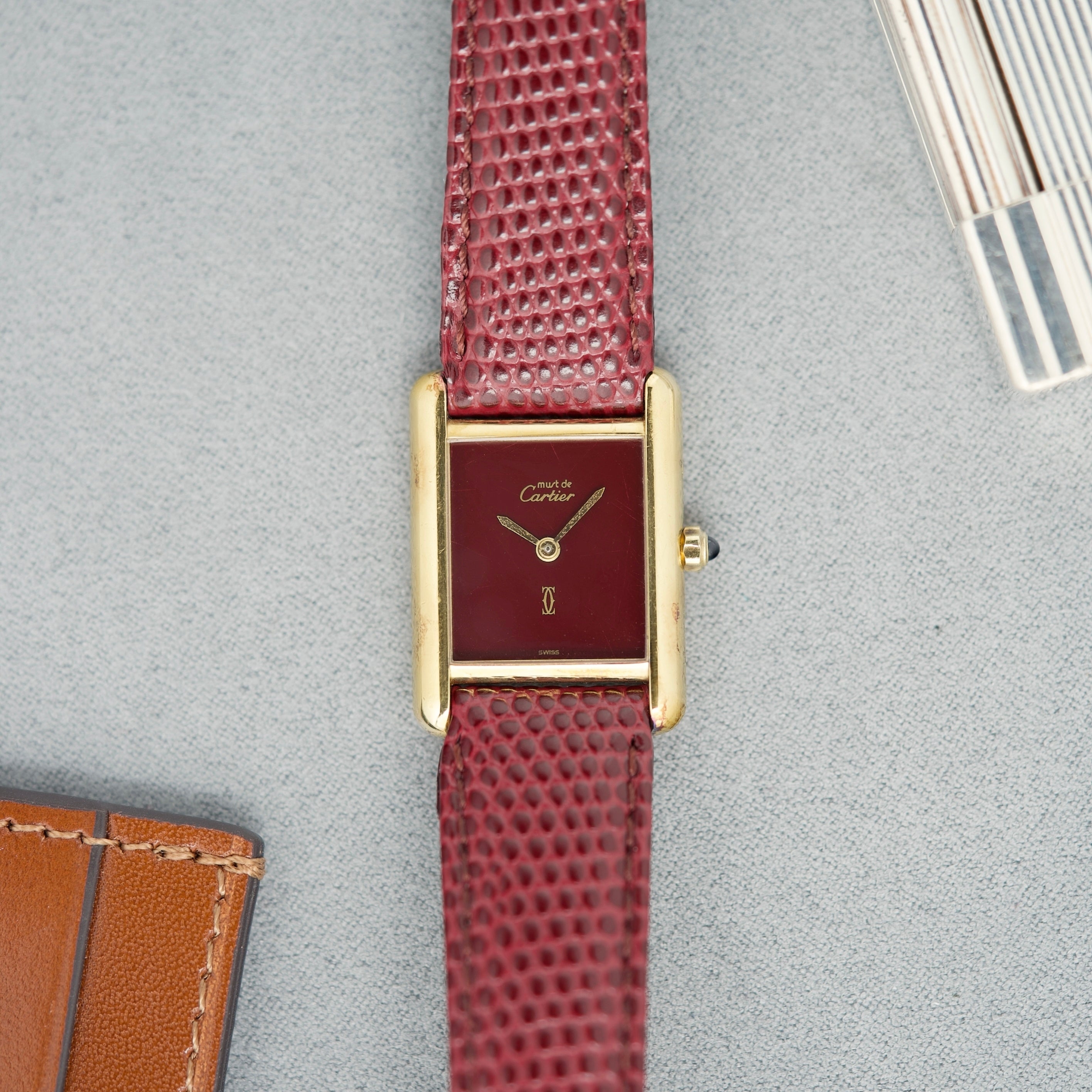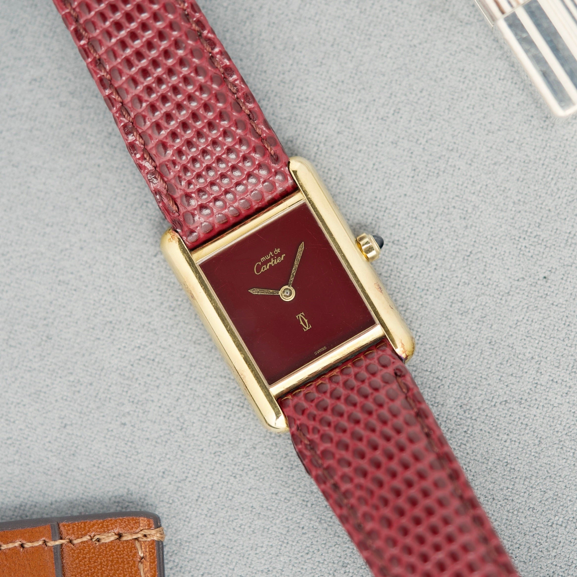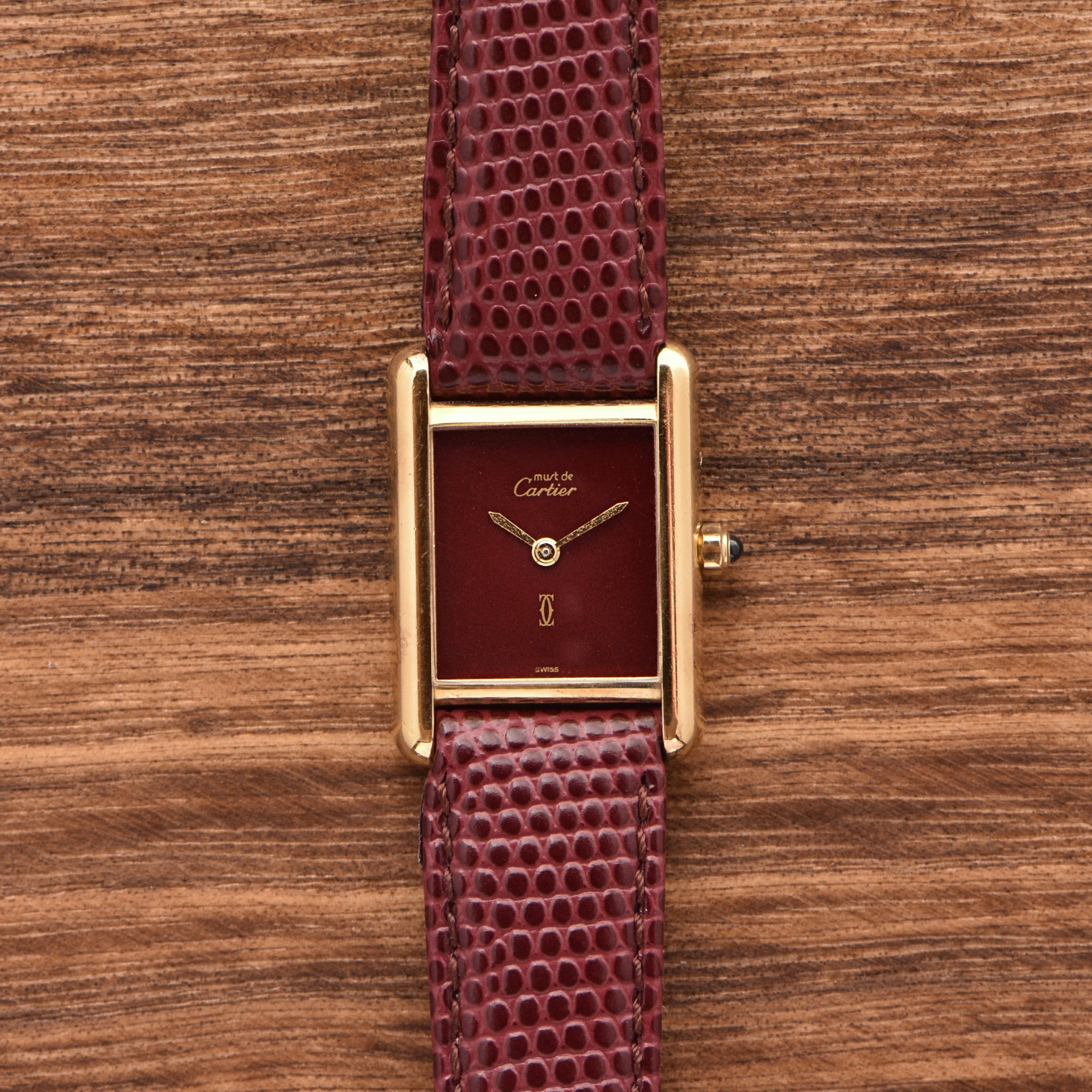 Dial: The dial is Bordeaux, a very nice shade of burgundy. The dial has normal spidering on the clear lacquer like most Must De Tanks from the 80s and 90s. The logo and such are fully intact with no signs of wear.