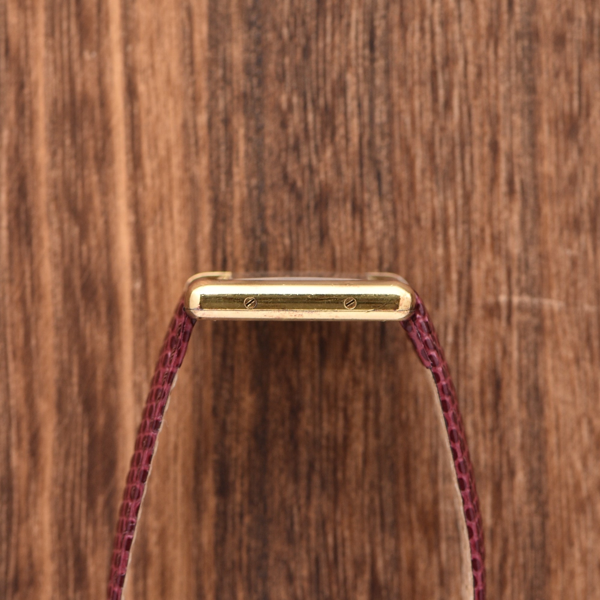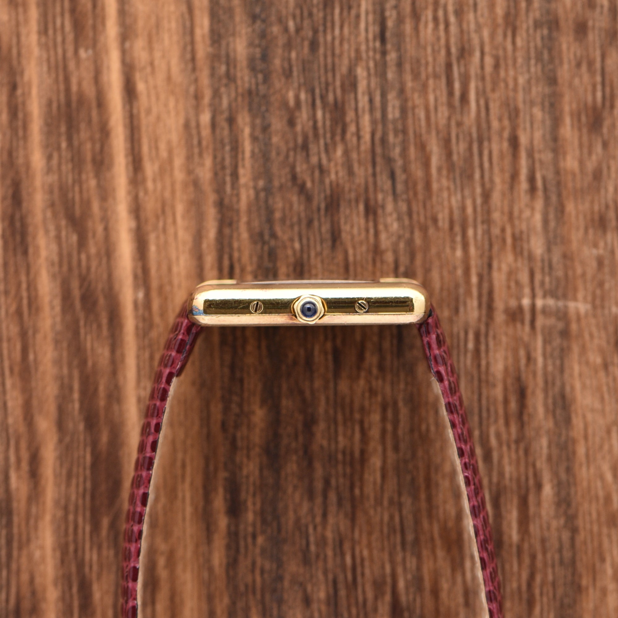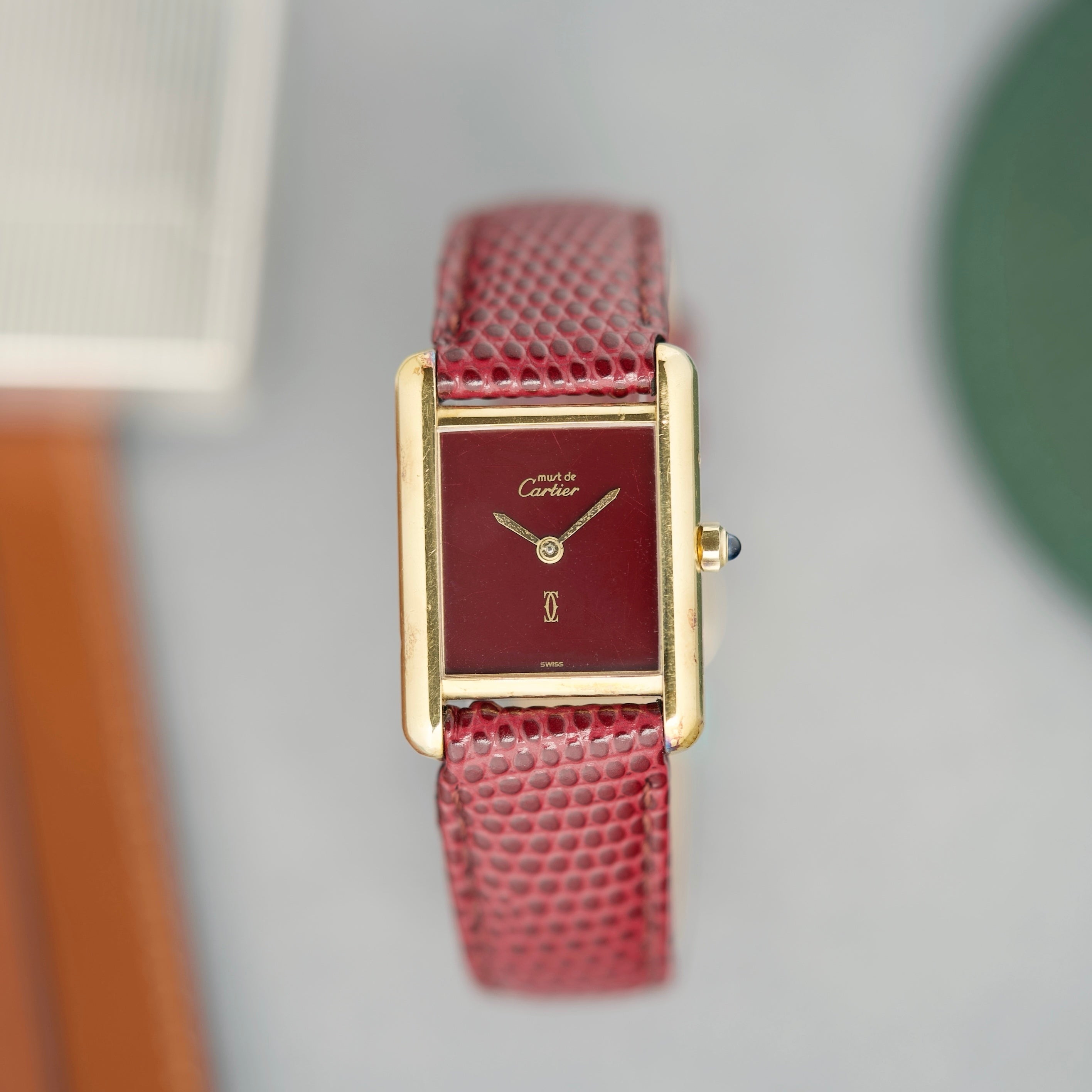 Dial: The dial is Bordeaux, a very nice shade of burgundy. The dial has normal spidering on the clear lacquer like most Must De Tanks from the 80s and 90s. The logo and such are fully intact with no signs of wear.