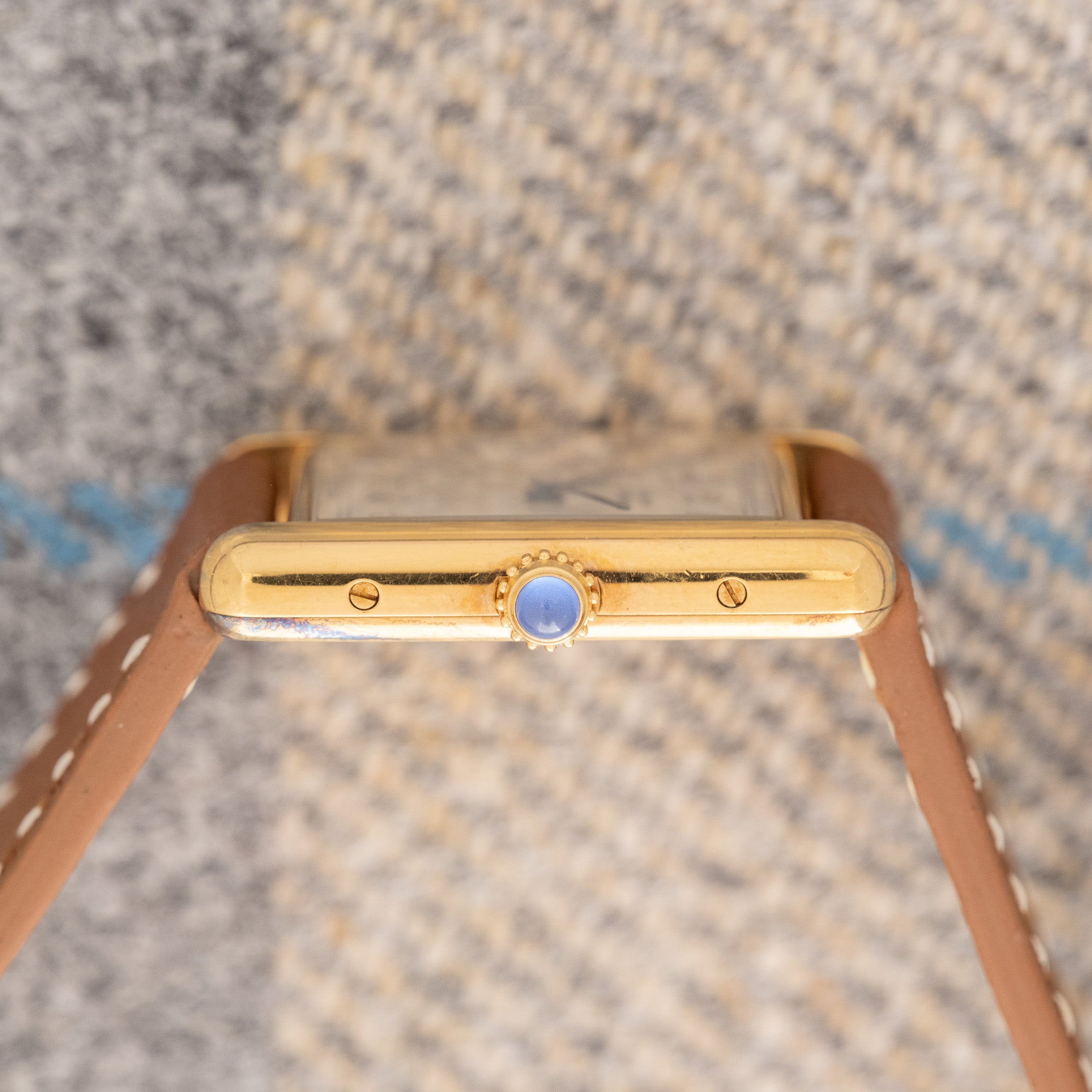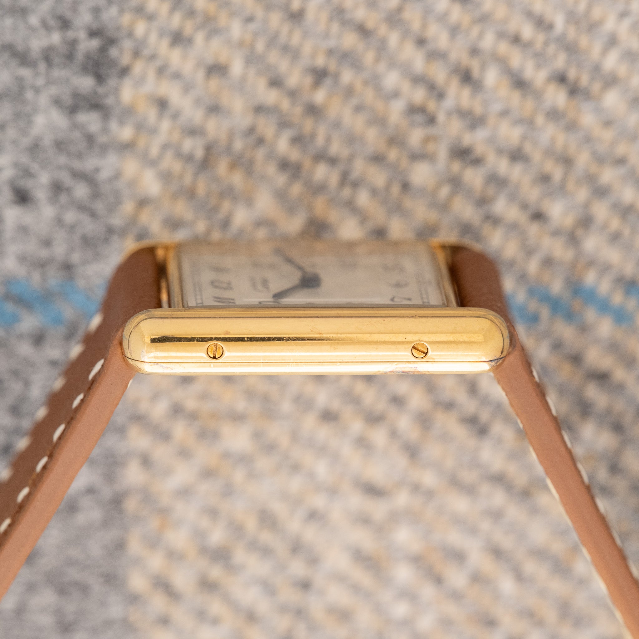 This specific example is a rare dial for the Tank model. It features a silver dial with beautiful Breguet numerals. While the Roman dials are classics for Cartier, the Breguet numerals are a nice change to the Tank. Breguet numerals give the dial a different feel while still being classy and clean. We paired this with our Butterscotch strap, an Italian calfskin strap in tan. It's a fun way to dress down the Tank while still keeping it clean.
