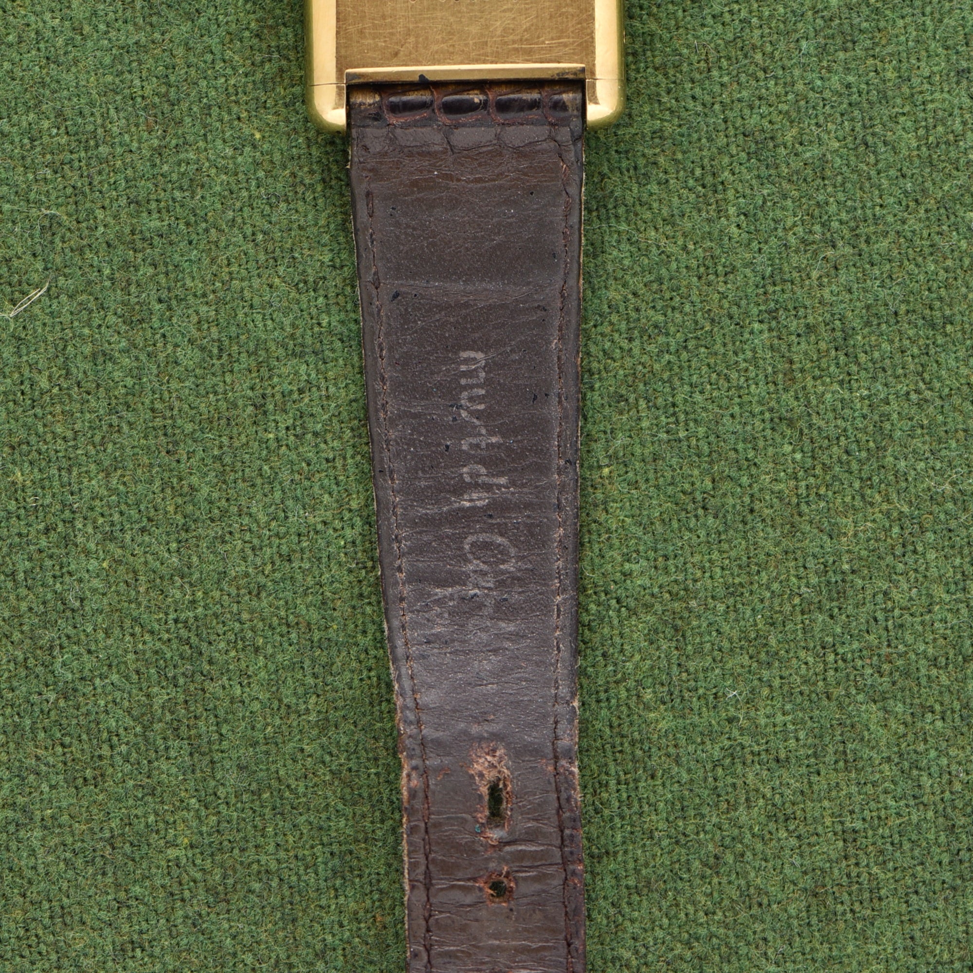 The dial, mimicking a wood finish, has noticeable swirl marks and scratches throughout. The case has no plate wear and comes with the original strap and buckle.