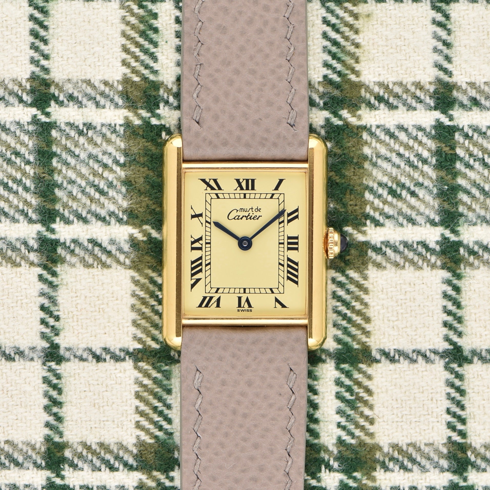 The Must de Cartier line, created by Robert Hocq and Alain-Dominique Perrin, aimed to attract new customers by offering accessories and leather goods with the essence of Cartier. The Must de Cartier Tank wristwatch was the brand's most iconic item, made from sterling silver with a minimum of 10k plating at 2.5 microns thick. Launched in 1976, the line marked key milestones for the brand, including being the first non-precious metal watch and the first mass-produced watch. The brand produced around 3000 watches per year before the Must line, and by the end of the 70s, they were producing over 160,000 watches per year. The dials varied, with faux-stone dials resembling onyx and lapis, lacquer dials in wood and tortoiseshell, and the Trinity dial featuring five stripes in a center section in yellow, white, and rose gold. The Trinity dial was a favorite among fans.