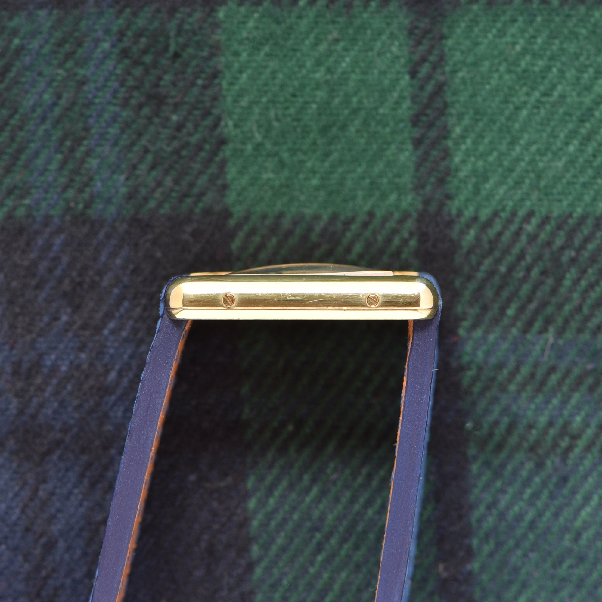 The case has very minimal wear that is barely noticeable near the lugs. The crystal has very light wear, almost unnoticeable. The dial is very clean with some oxidation on the metal inlays. The watch is on our very own blue lizard handmade strap.
