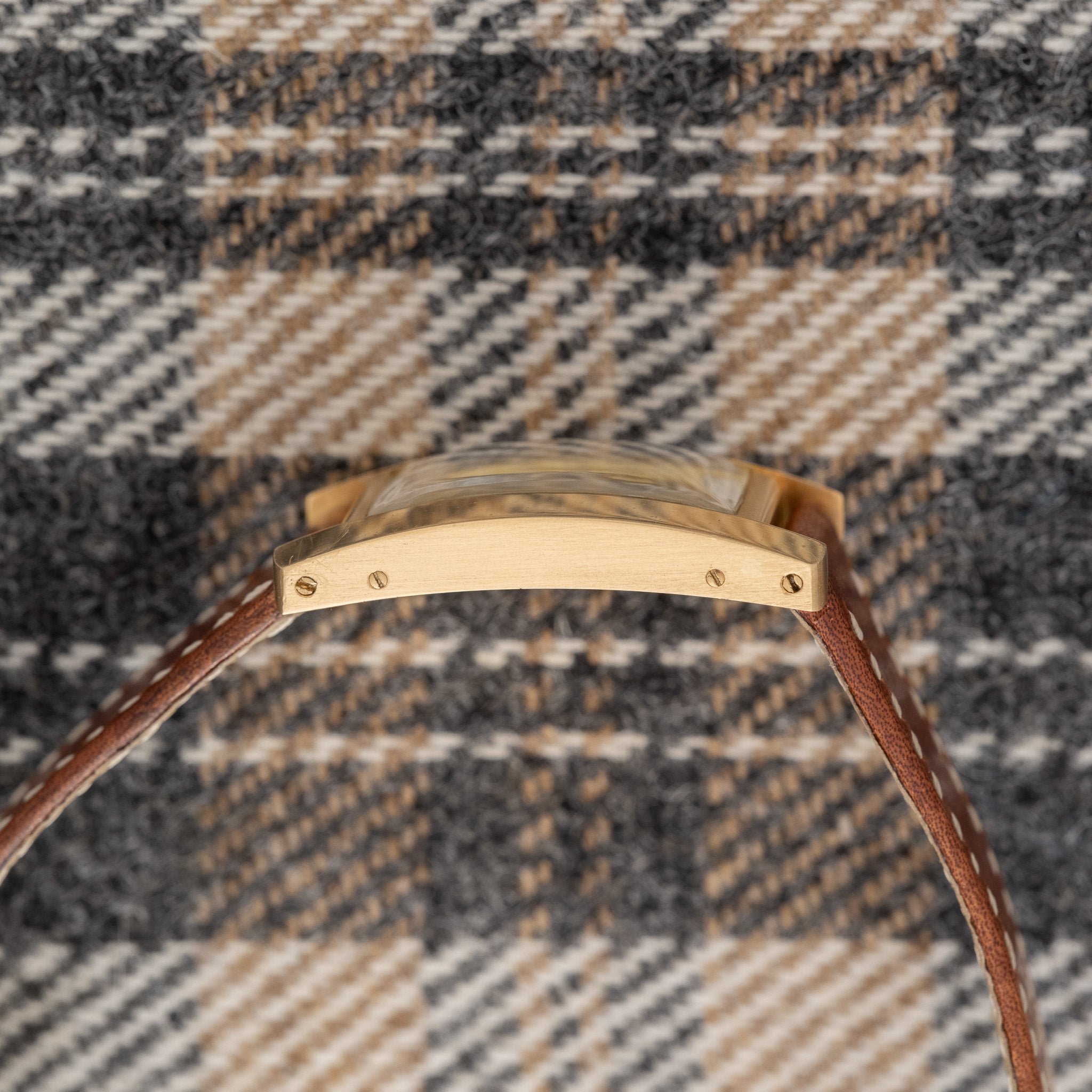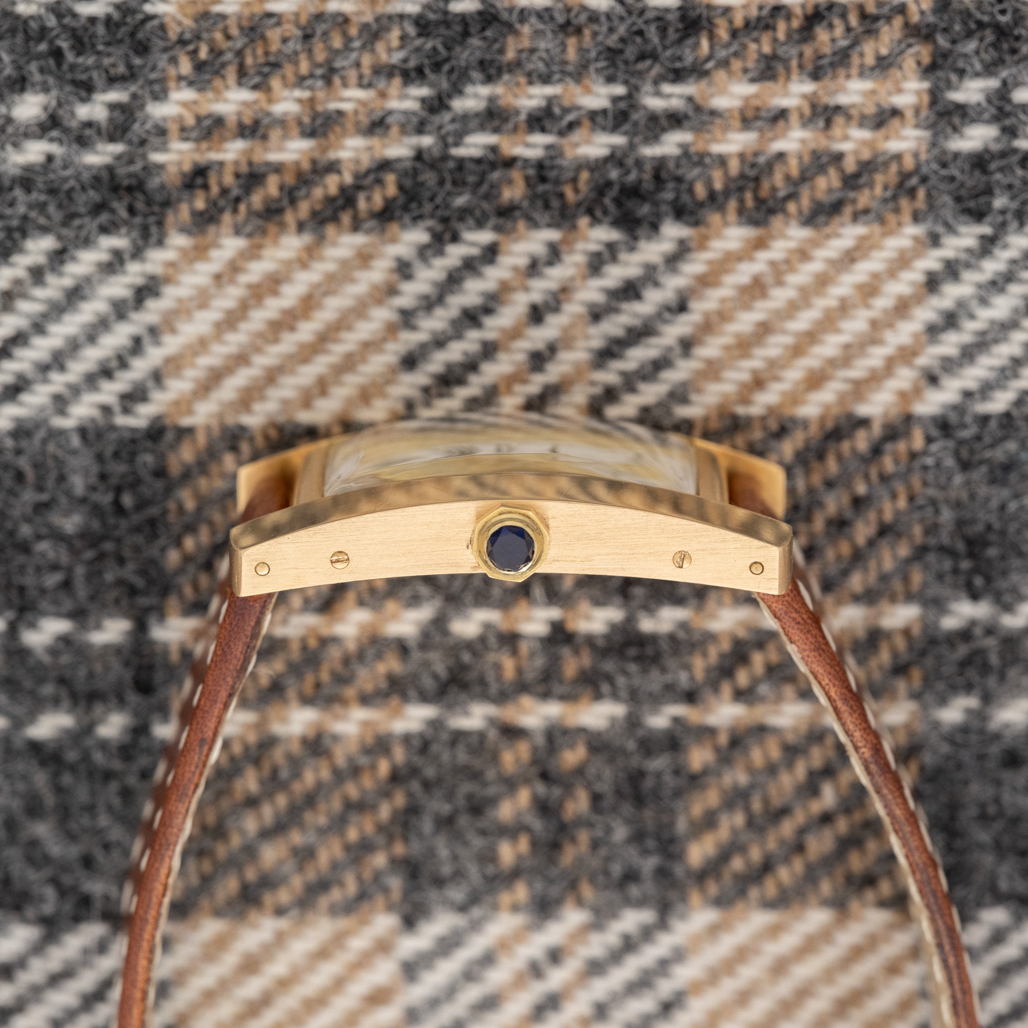 The present example is in pristine untouched condition housed in the classic 18K yellow gold curved case. We have never seen another midsize Cintree in this level of condition. It is evident that it sat in a drawer or safe for virtually the entirety of its life. The case sides are so sharp they might cut you! Present within the watch is a flawless Paris-signed dial with iconic Cartier blued sword hands. The watch features the original large sized octagonal sapphire cabochon crown. On the caseback we find deep crisp hallmarks and an endearing personalized engraving denoting the passing down of this watch from father to daughter. We love these personalized engravings as they add intimacy and history to the watch as it gets passed down from owner to owner. We thoroughly embrace the notion that people should engrave their watches!