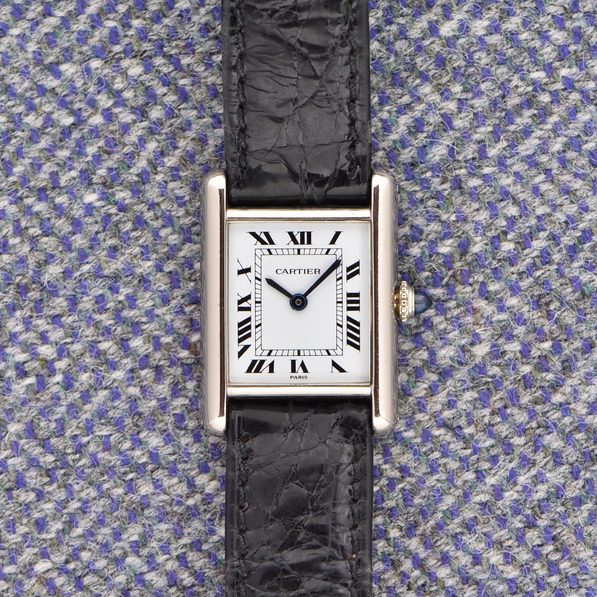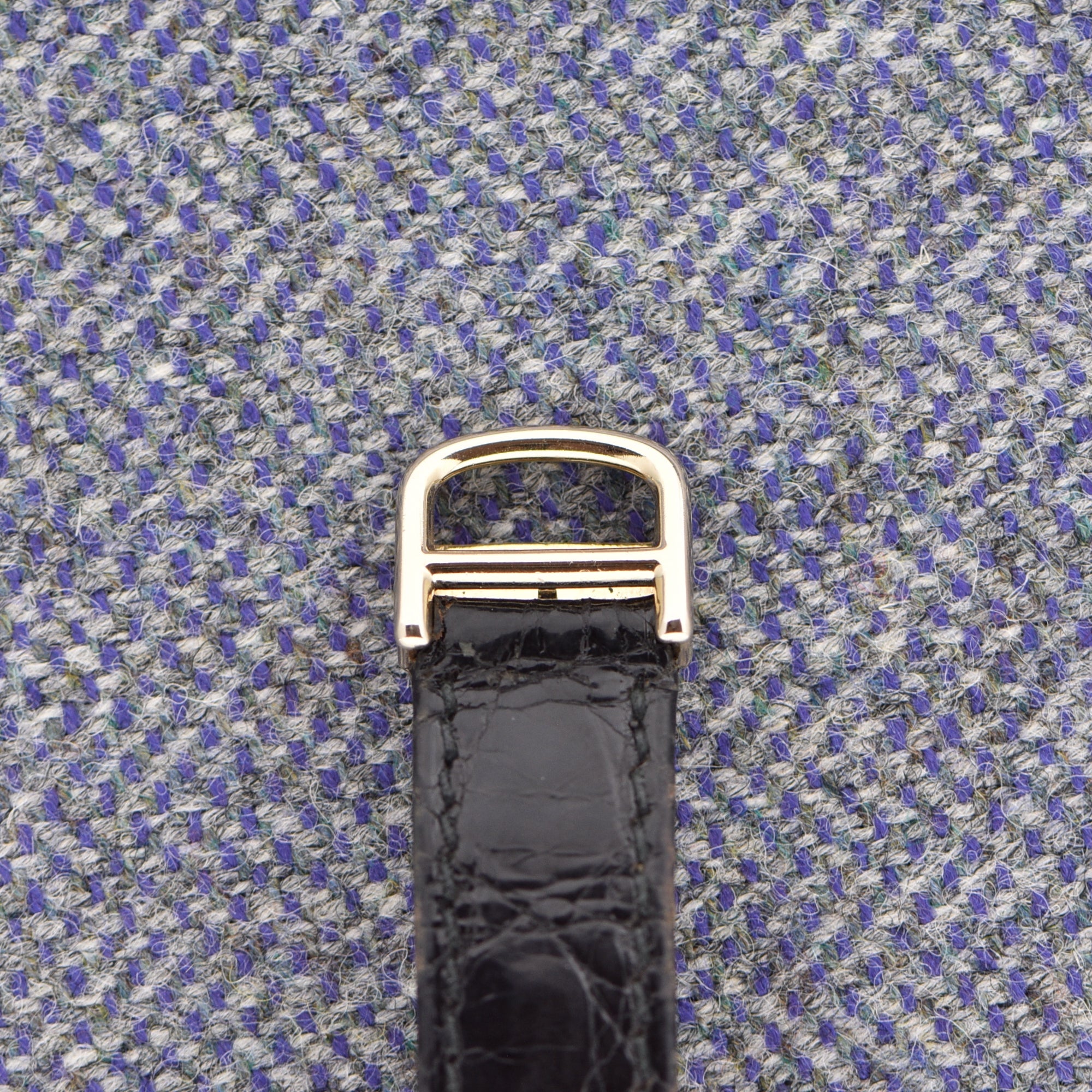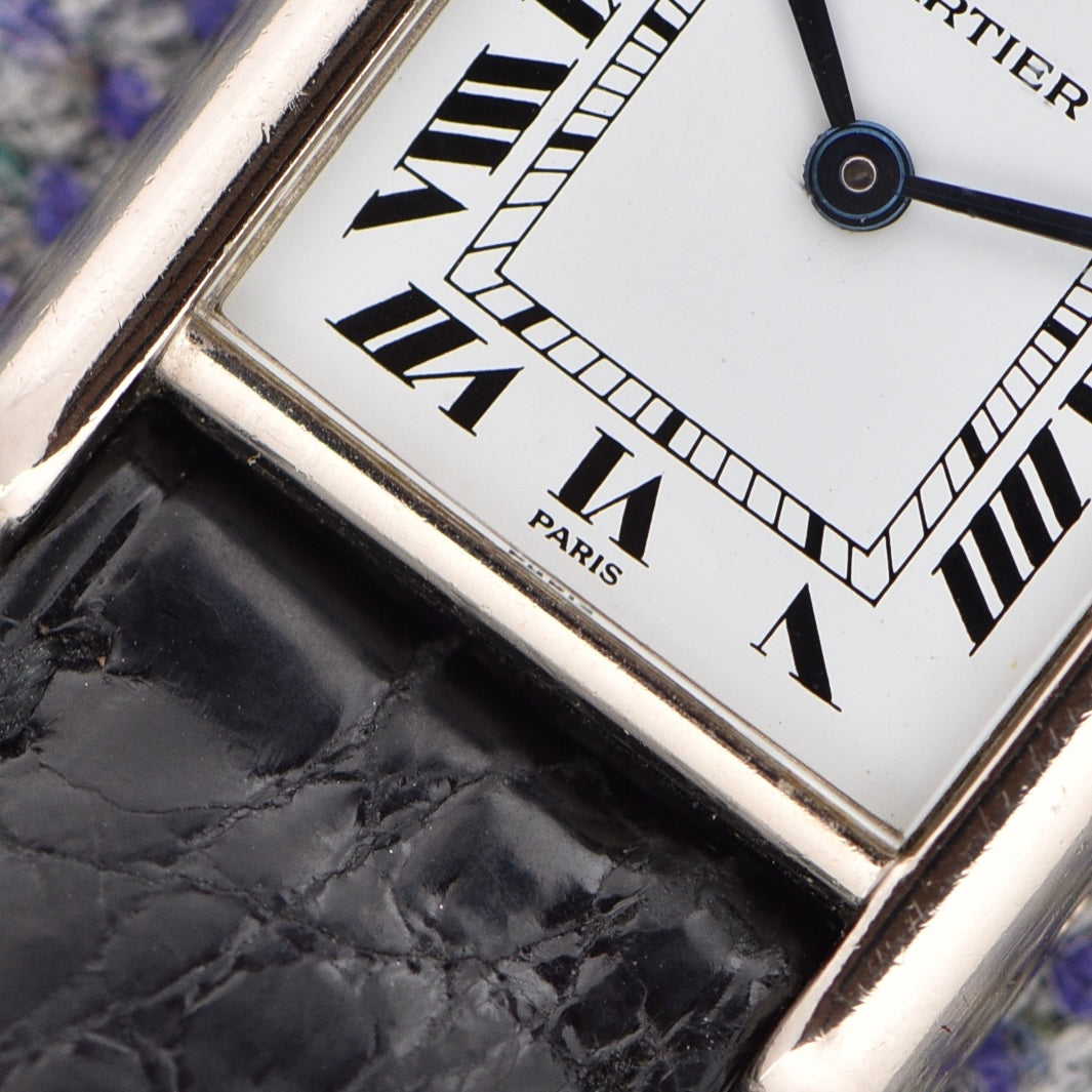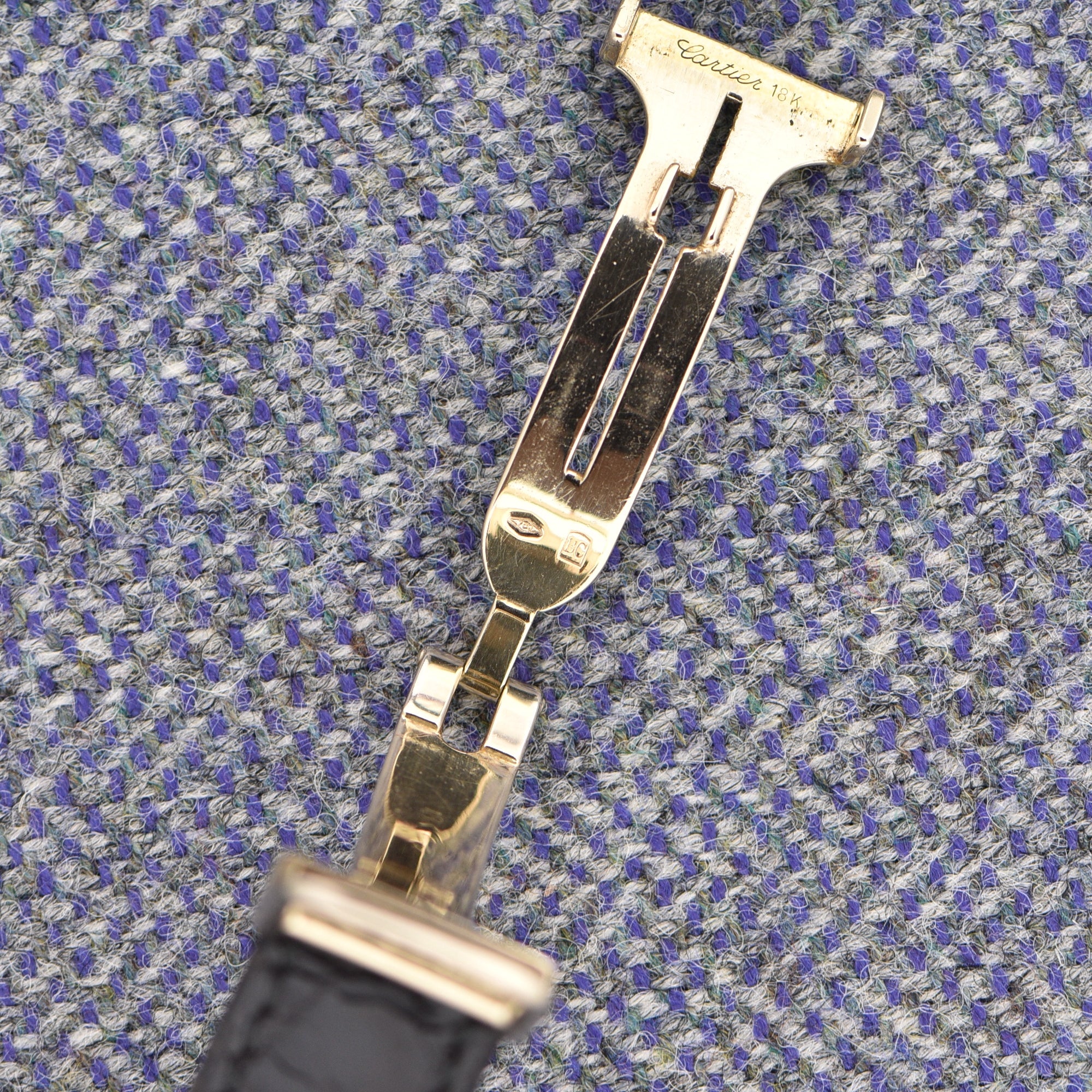 This Louis is in amazing condition, with normal wear. The rare white gold case does show signs of a polish. The watch is an early example of the 78087 with a large pointed crown. The Paris stamped dial has very little wear. The watch comes with a Cartier deployant buckle, also in white gold.