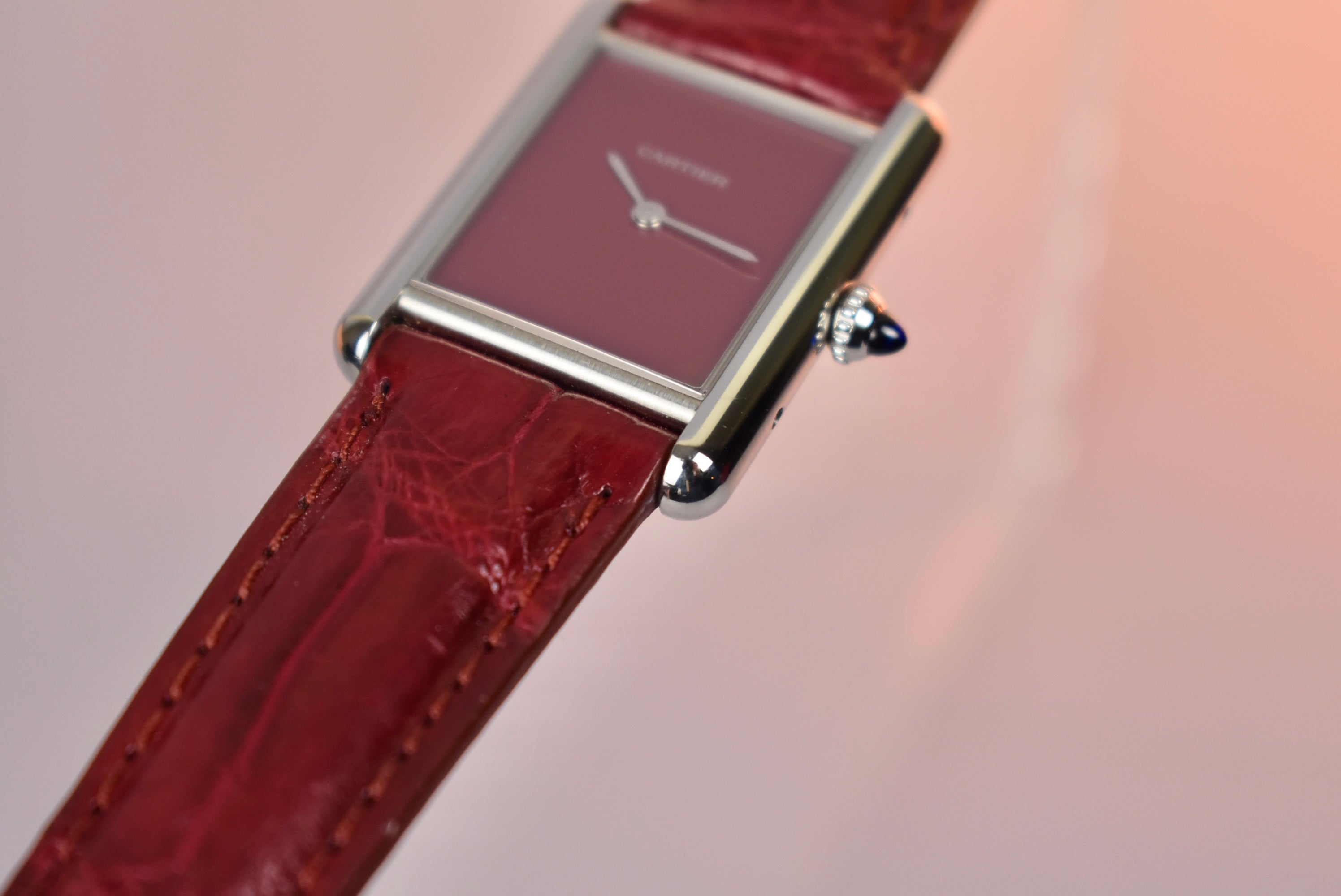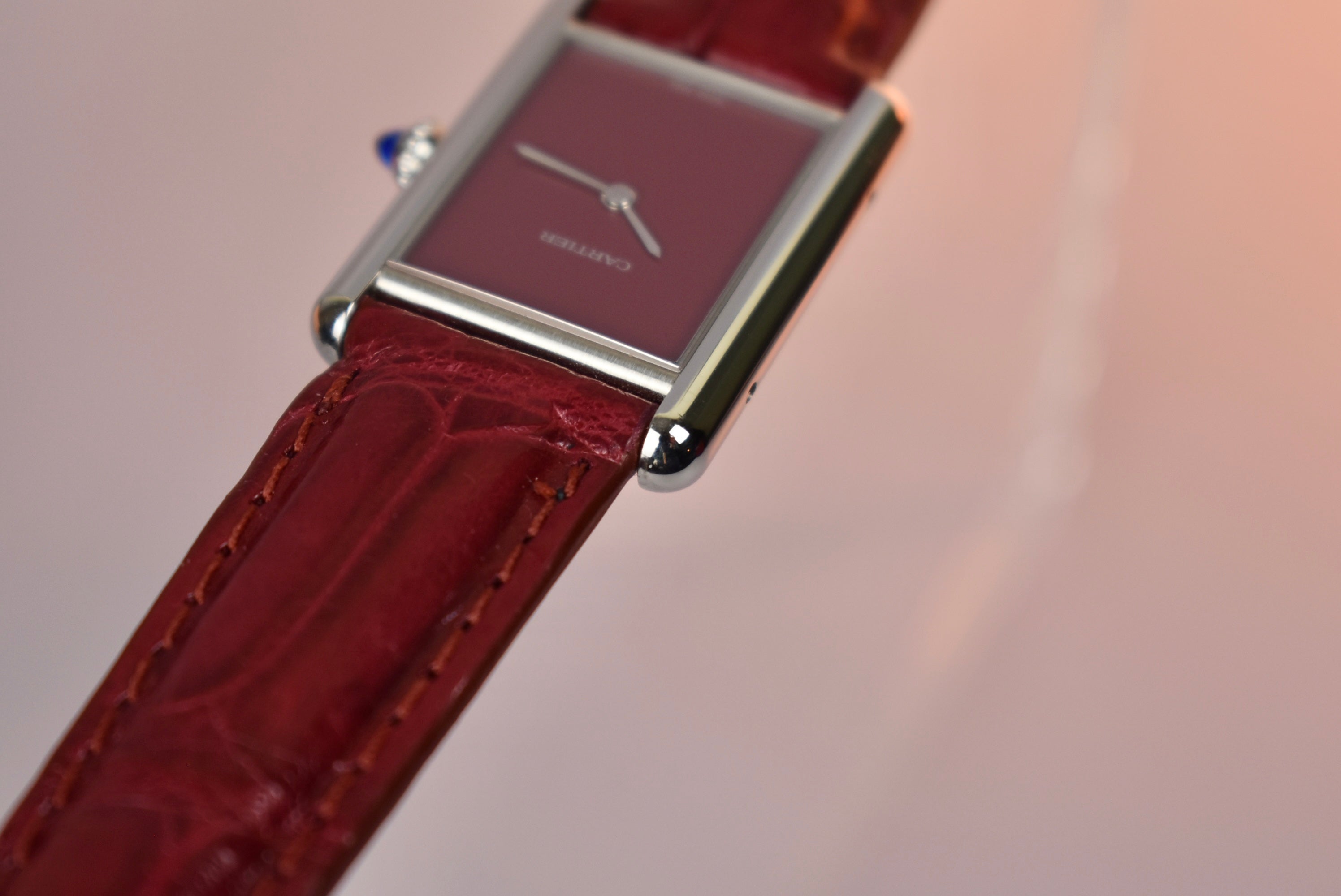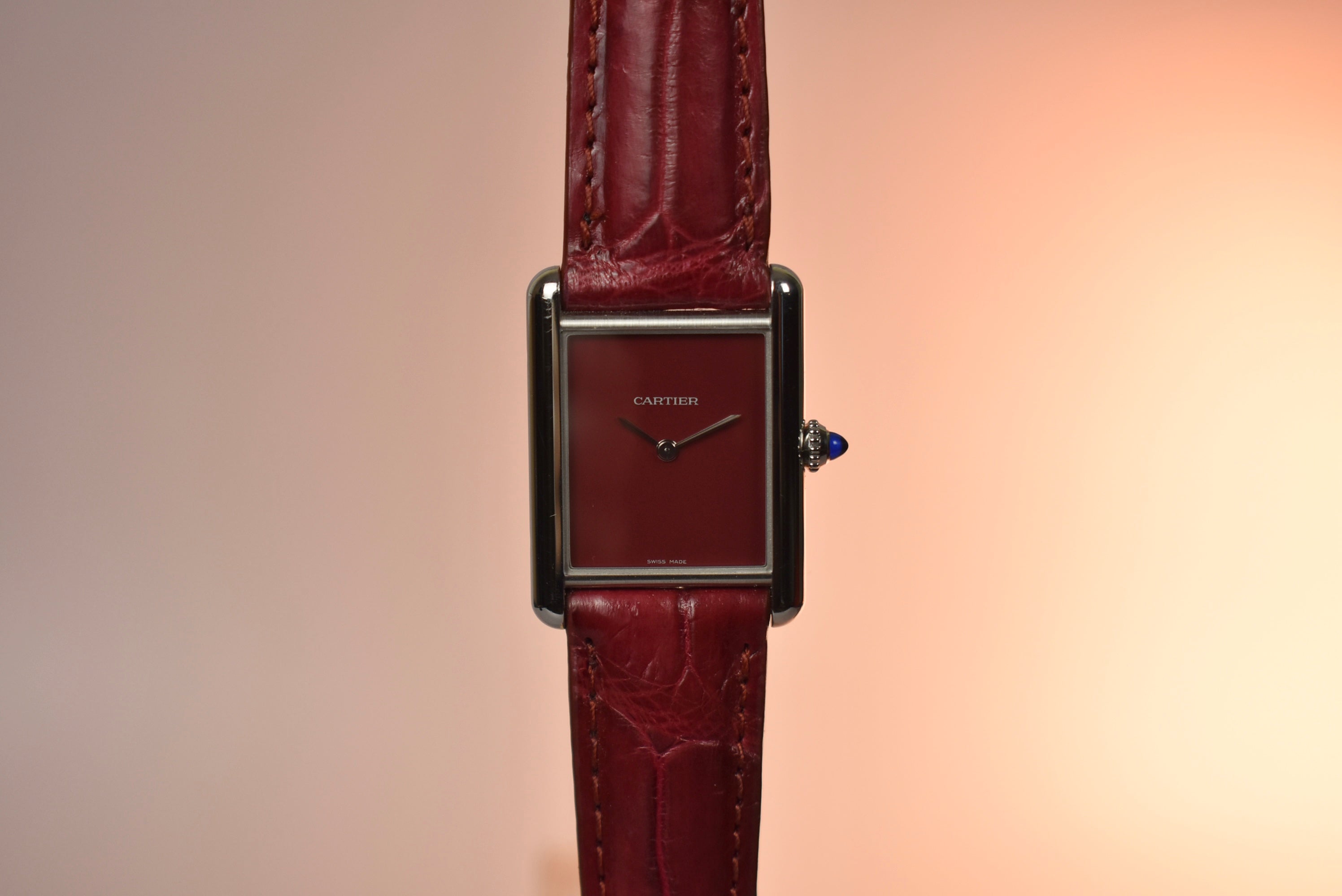 Cased in a bigger size, the new Must De line by Cartier gives you the vintage feel with a modern twist. Seen in the older Tank models, the burgundy dials were found with gold cases. This modern tank features a steel case, burgundy dial, a new strap and box with paperwork.