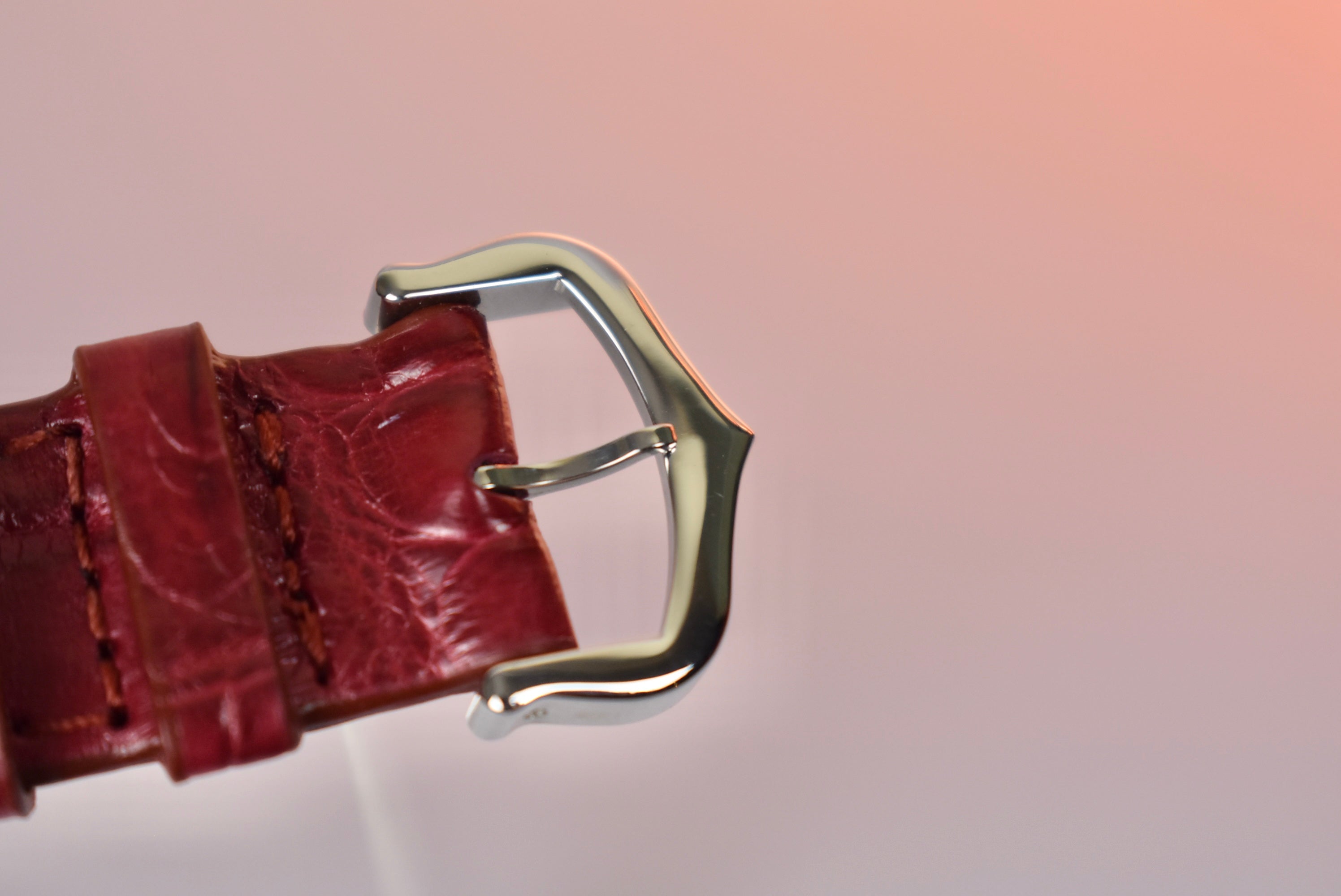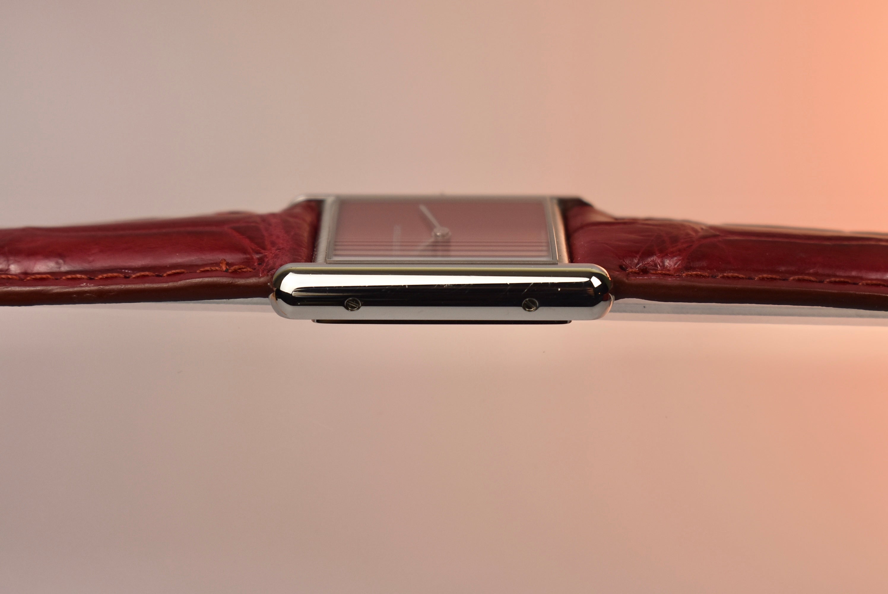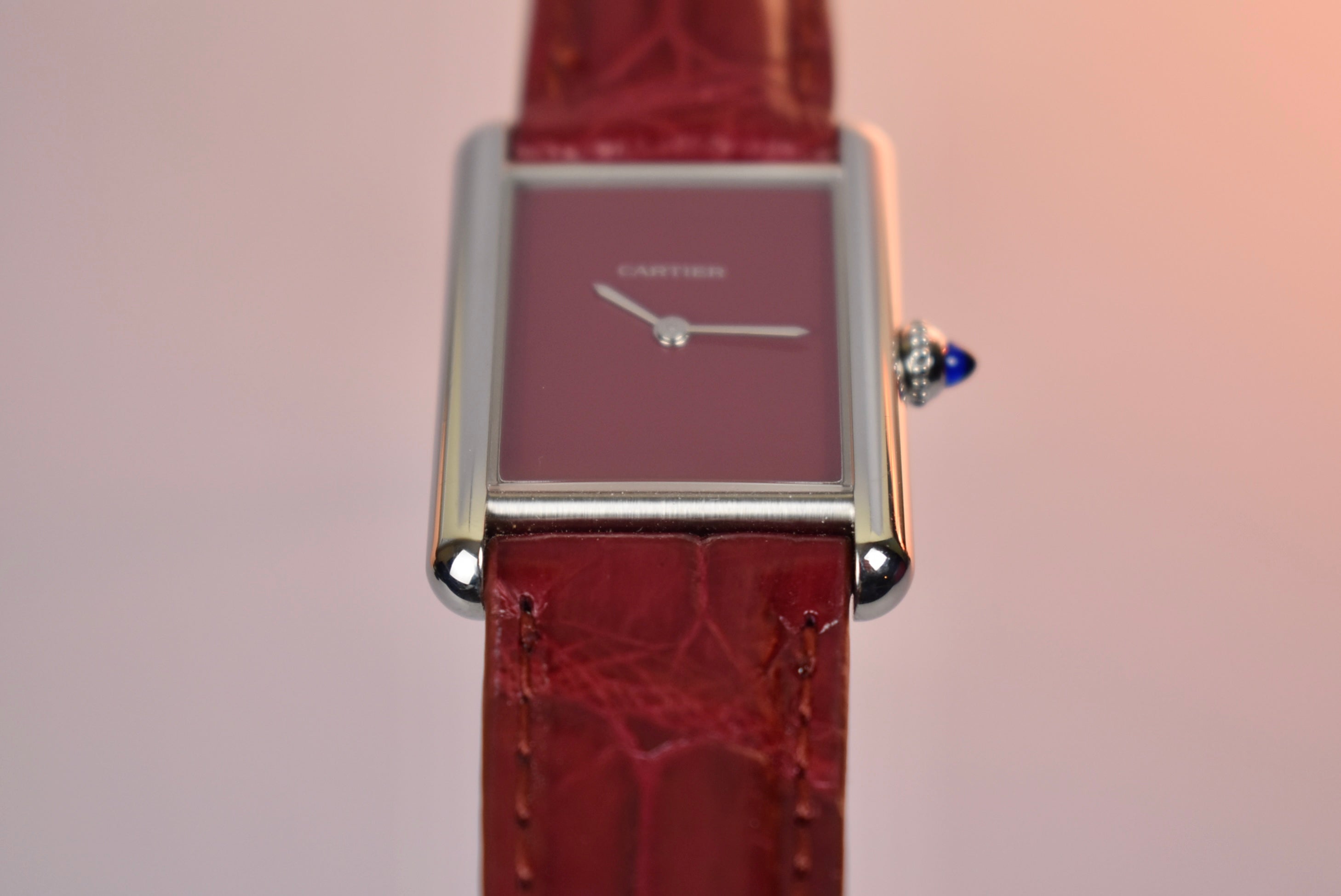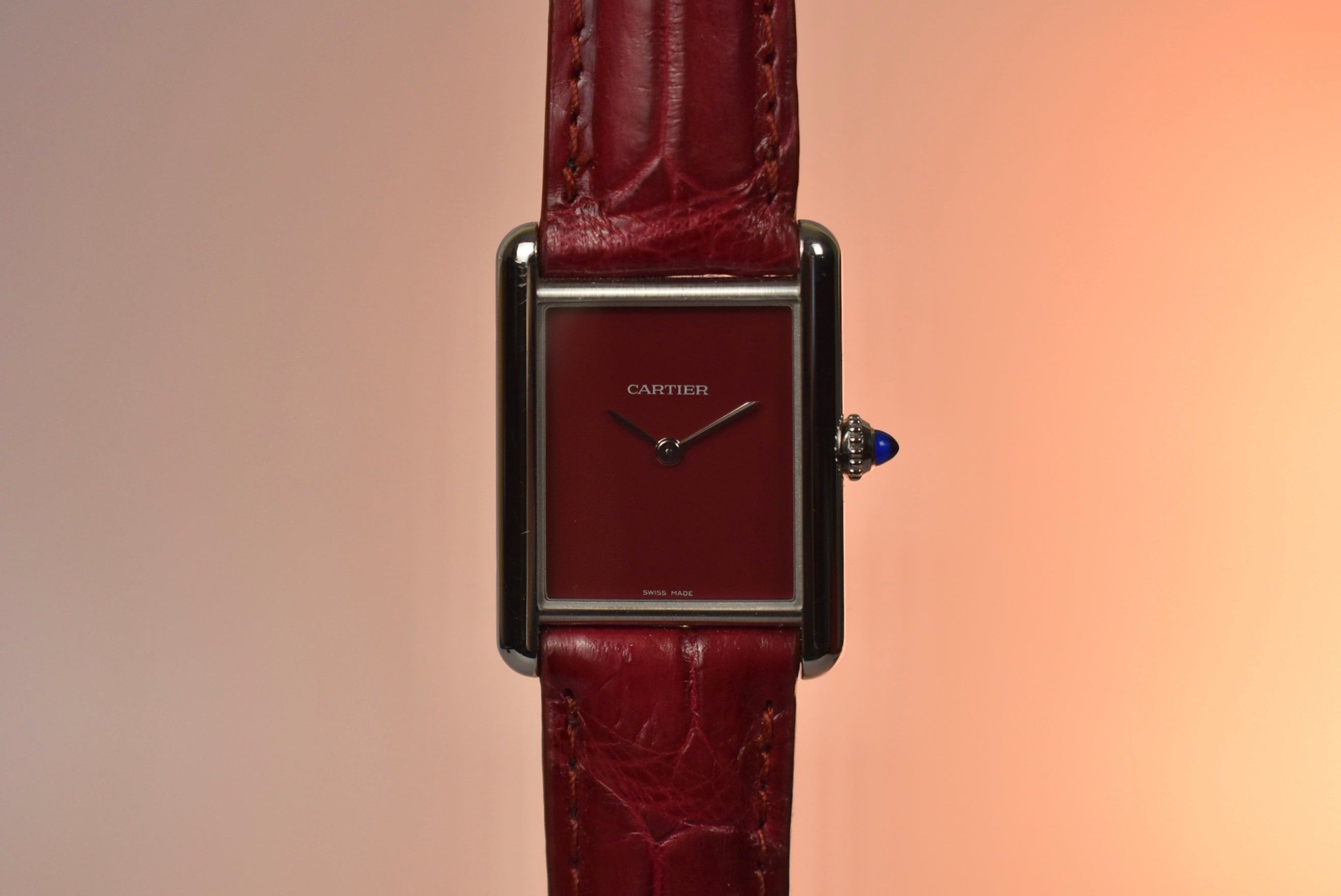 Cased in a bigger size, the new Must De line by Cartier gives you the vintage feel with a modern twist. Seen in the older Tank models, the burgundy dials were found with gold cases. This modern tank features a steel case, burgundy dial, a new strap and box with paperwork.