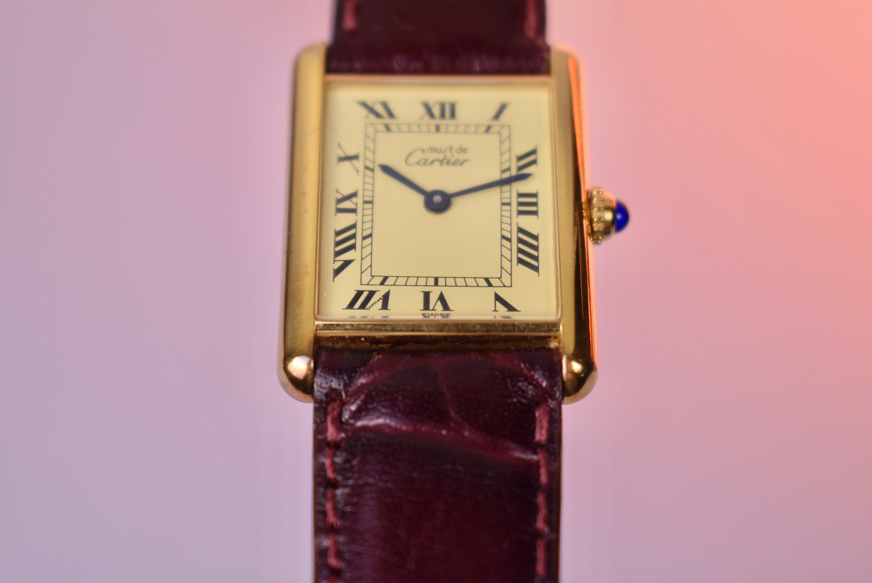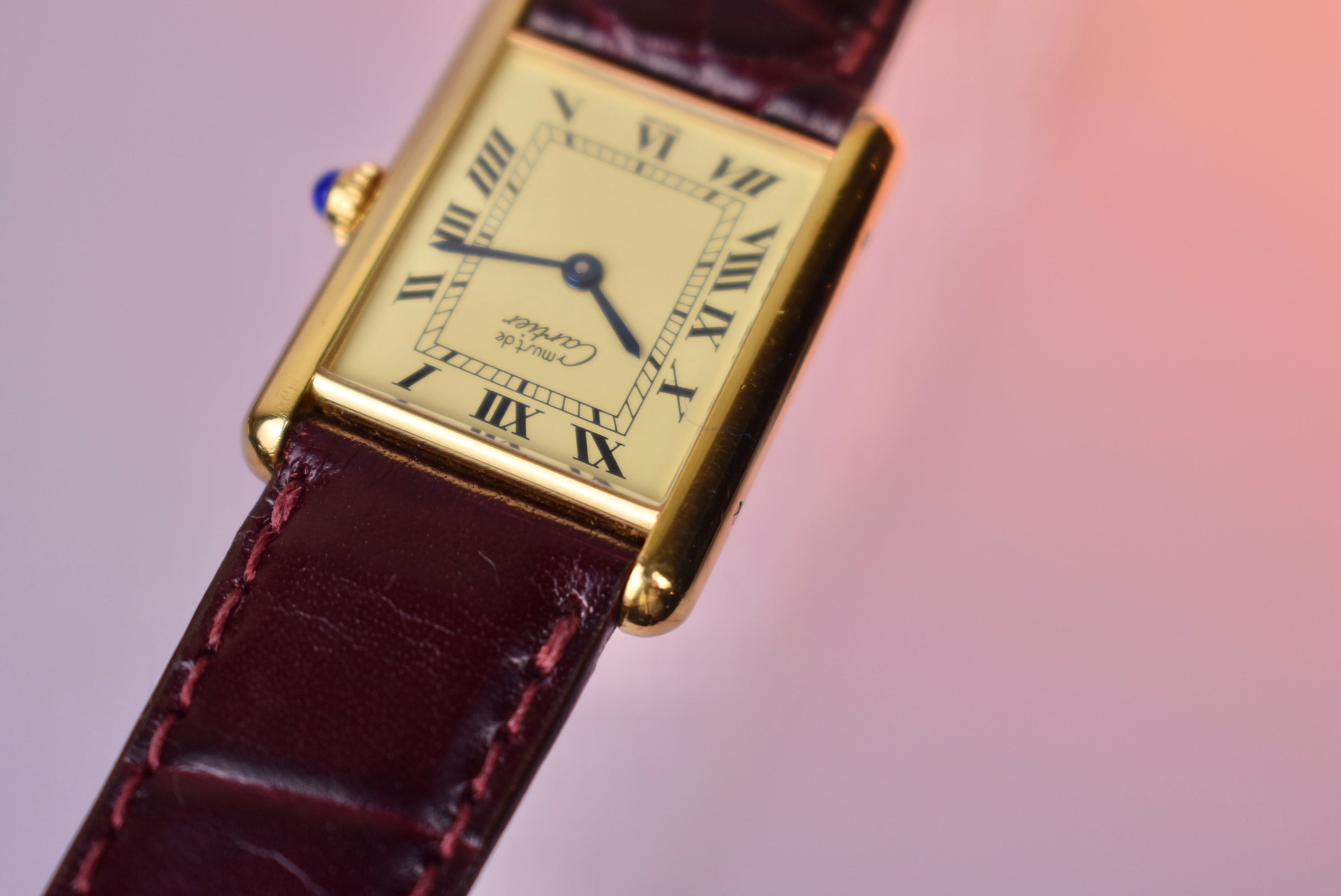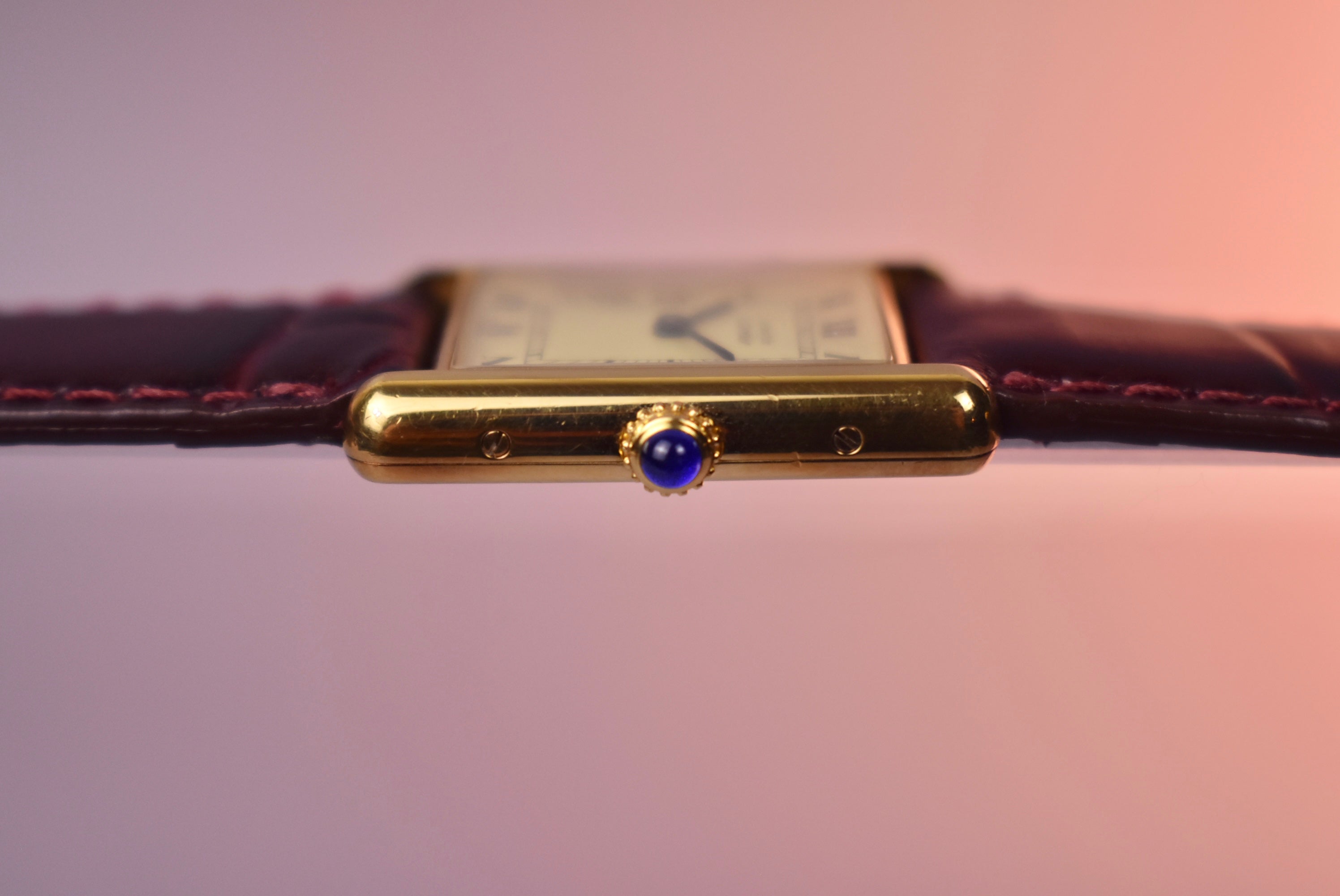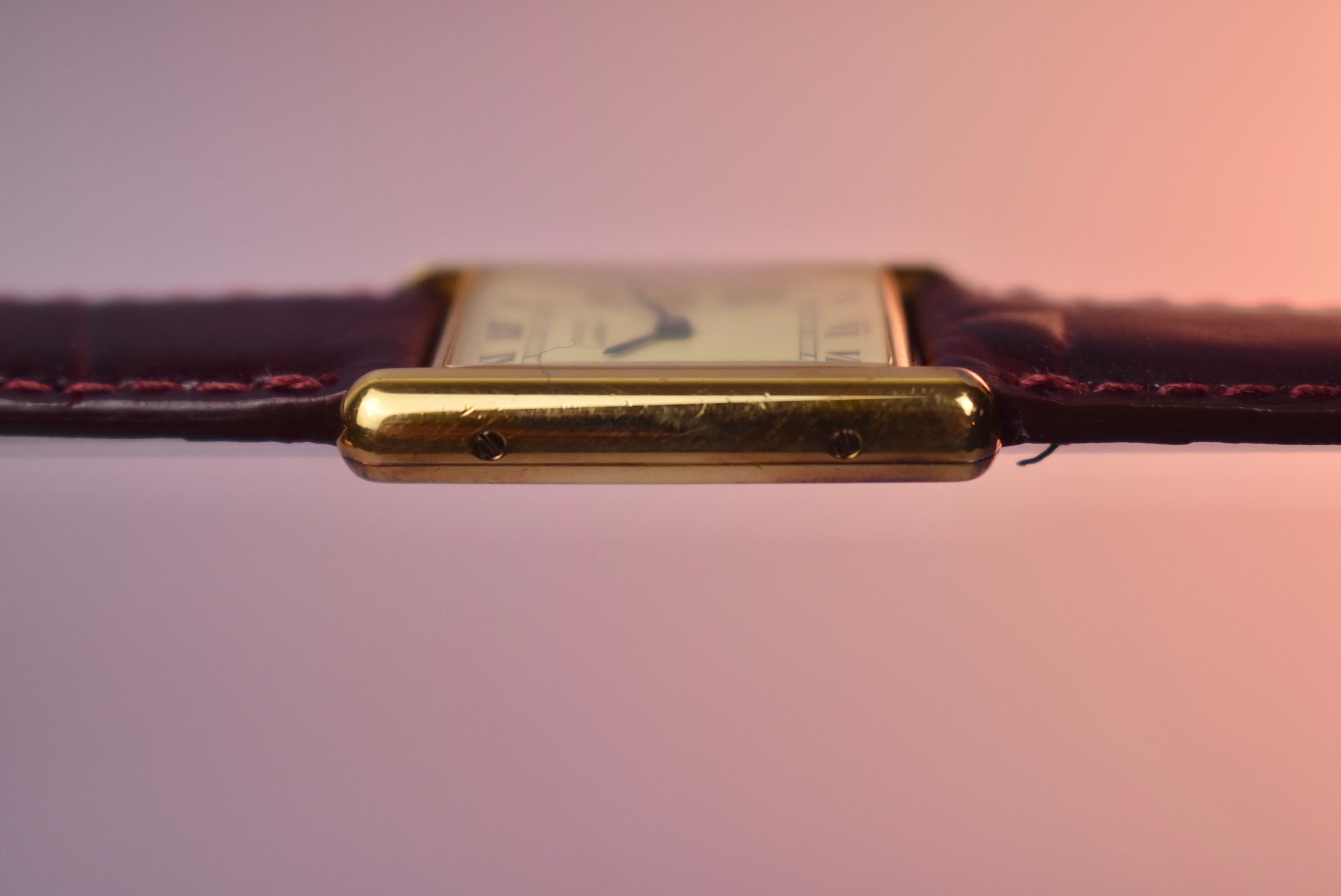 This example comes on a matching beige strap and its original cartier buckle. The dial is a perfect cream, roman, tank dial.