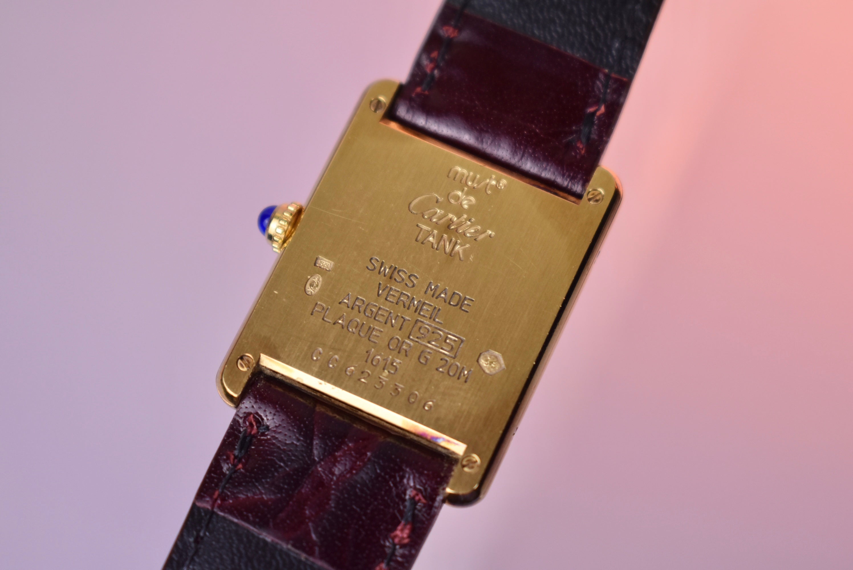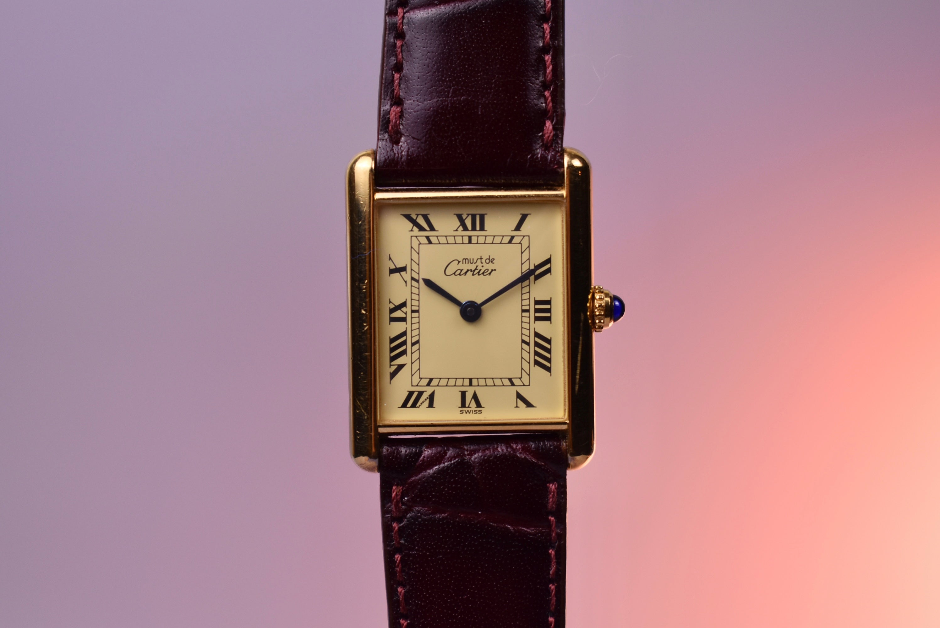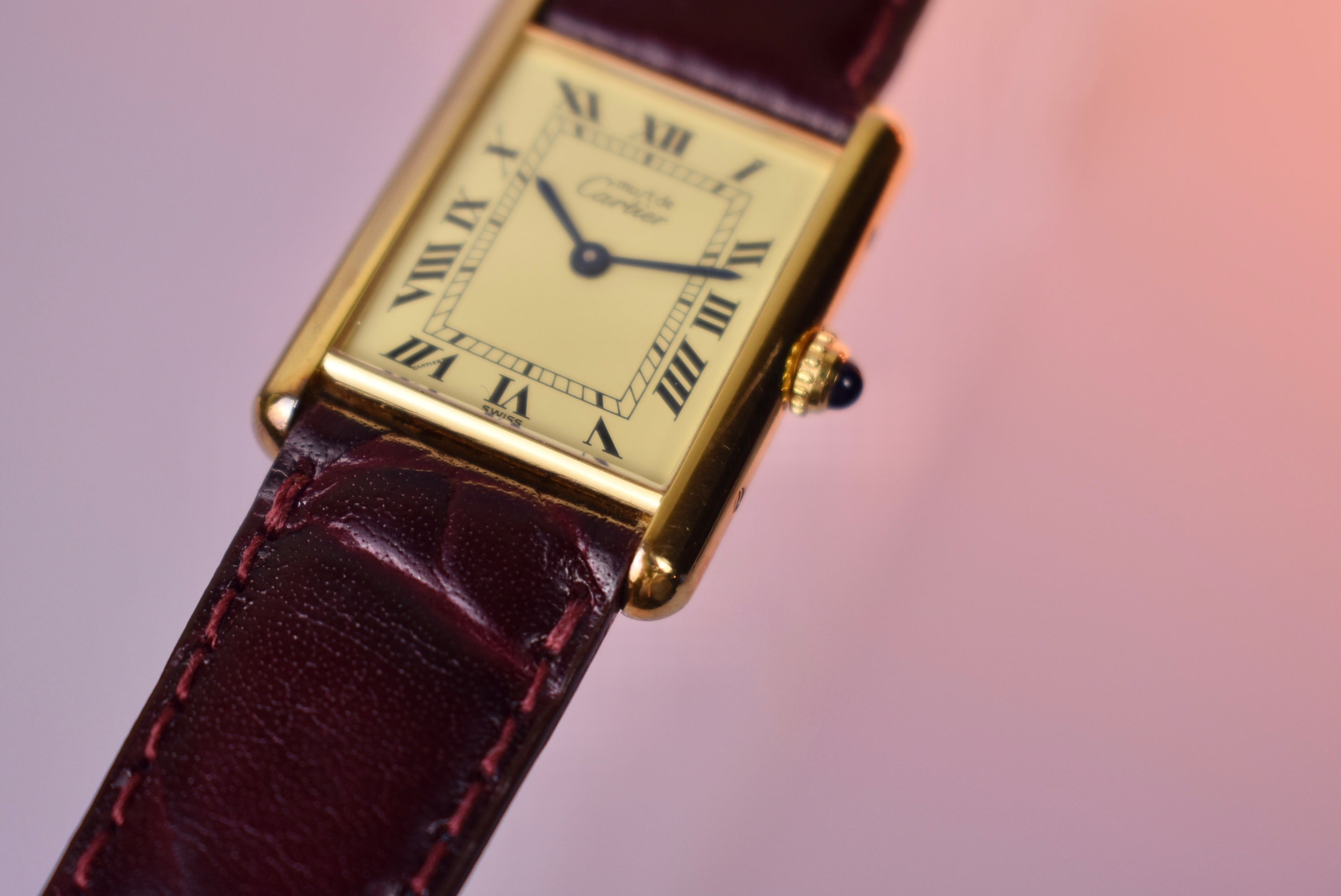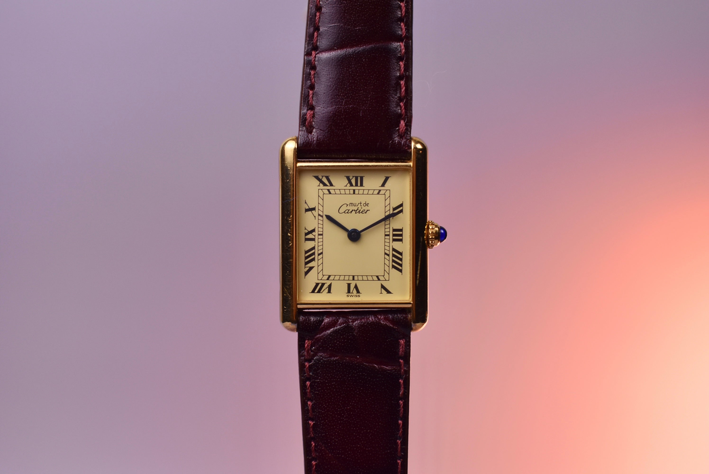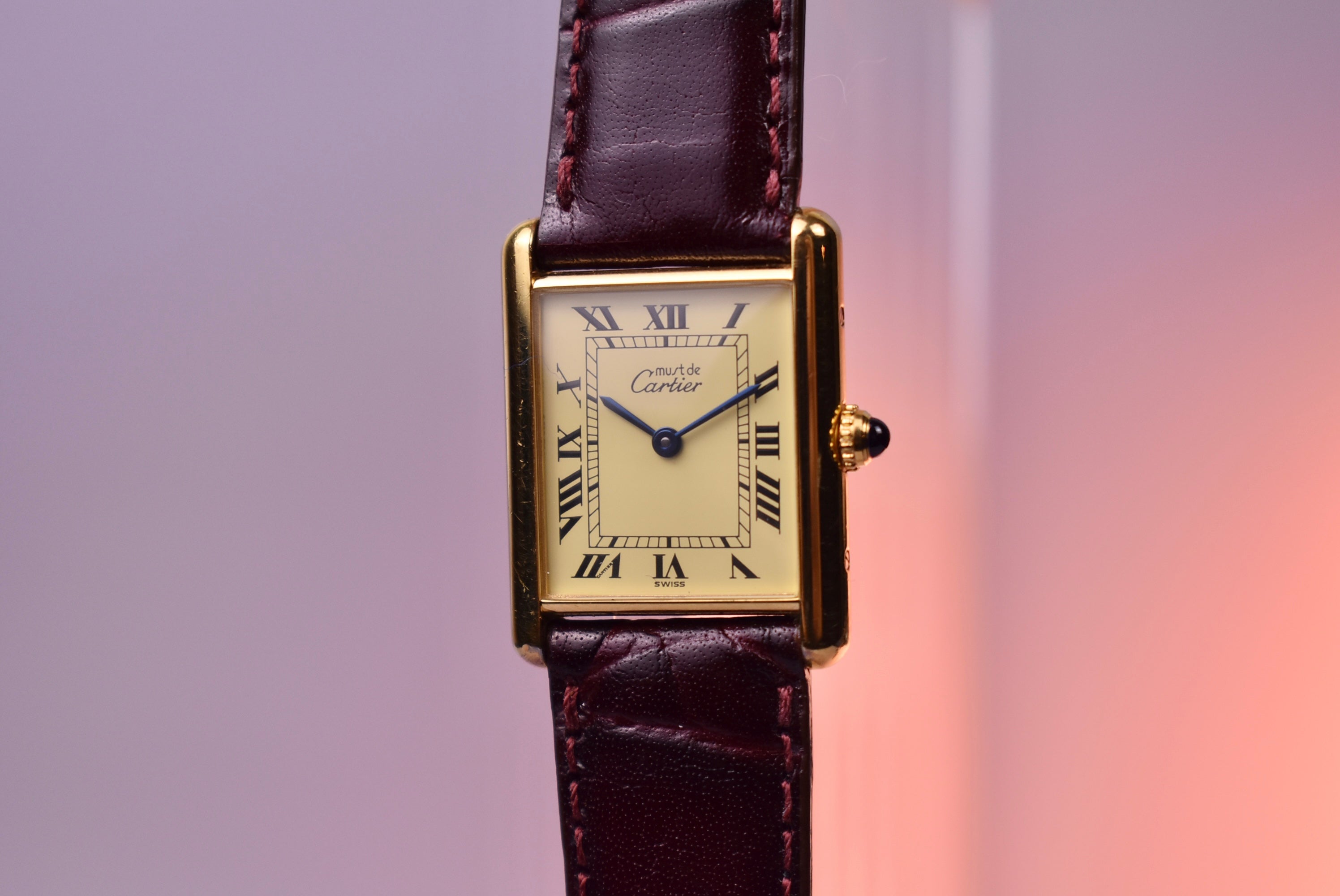 This example comes on a matching beige strap and its original cartier buckle. The dial is a perfect cream, roman, tank dial.