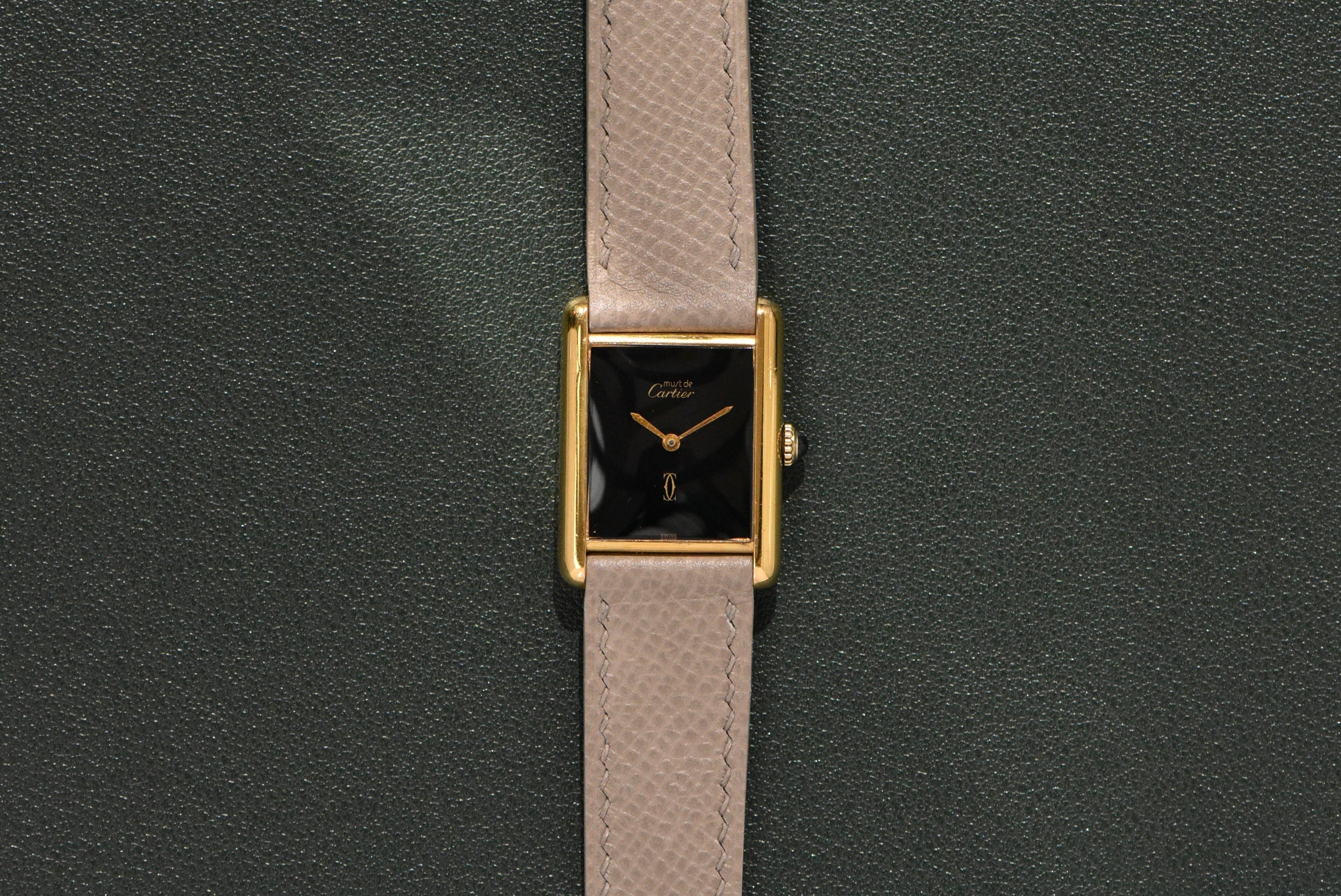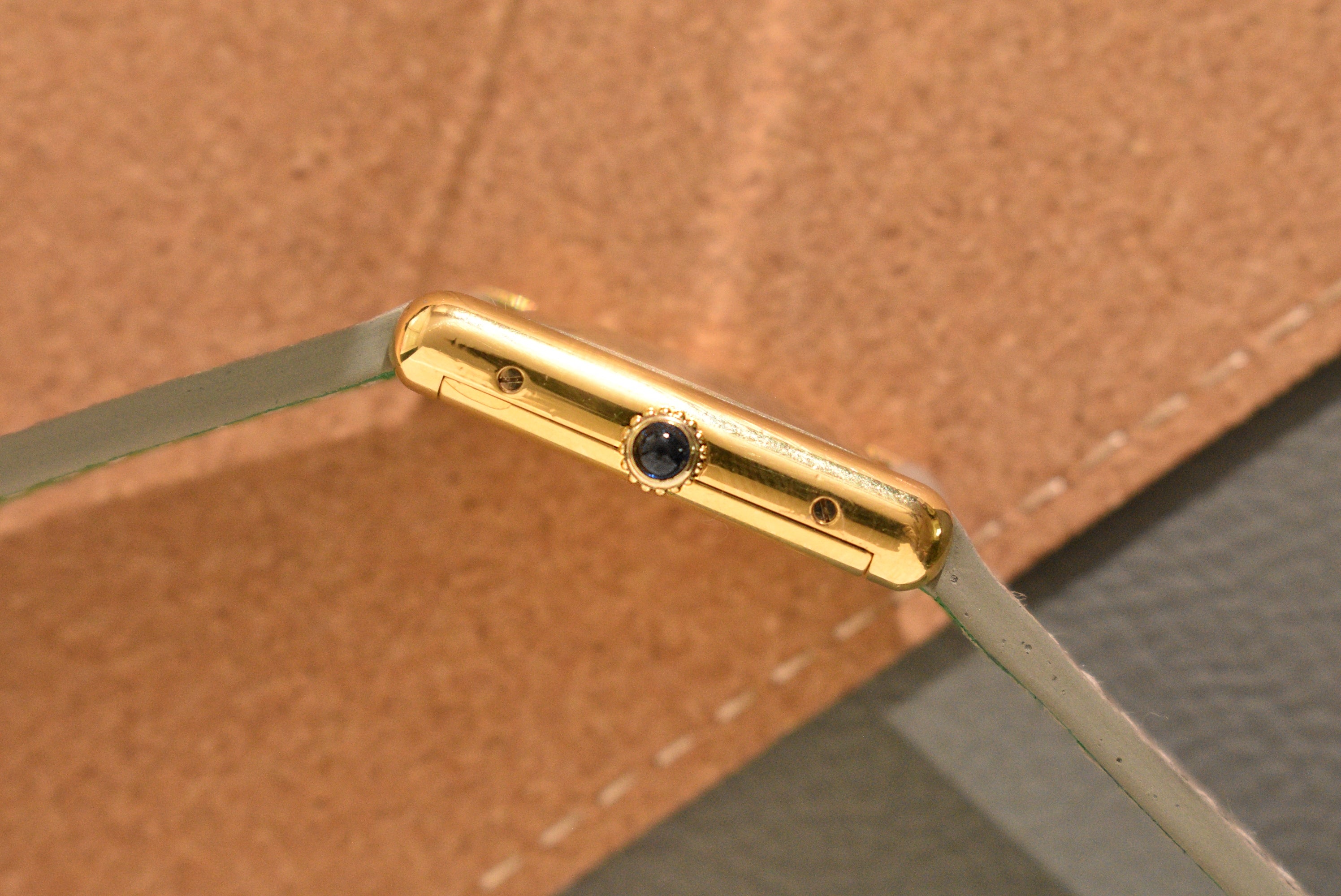 This dial is in fantastic condition with slight spidering and minimal age. The thick gold plating on the case is still intact. The blue cabochon is also in good condition with no chips. All around, this is a clean example of the black dial vermeil tanks.