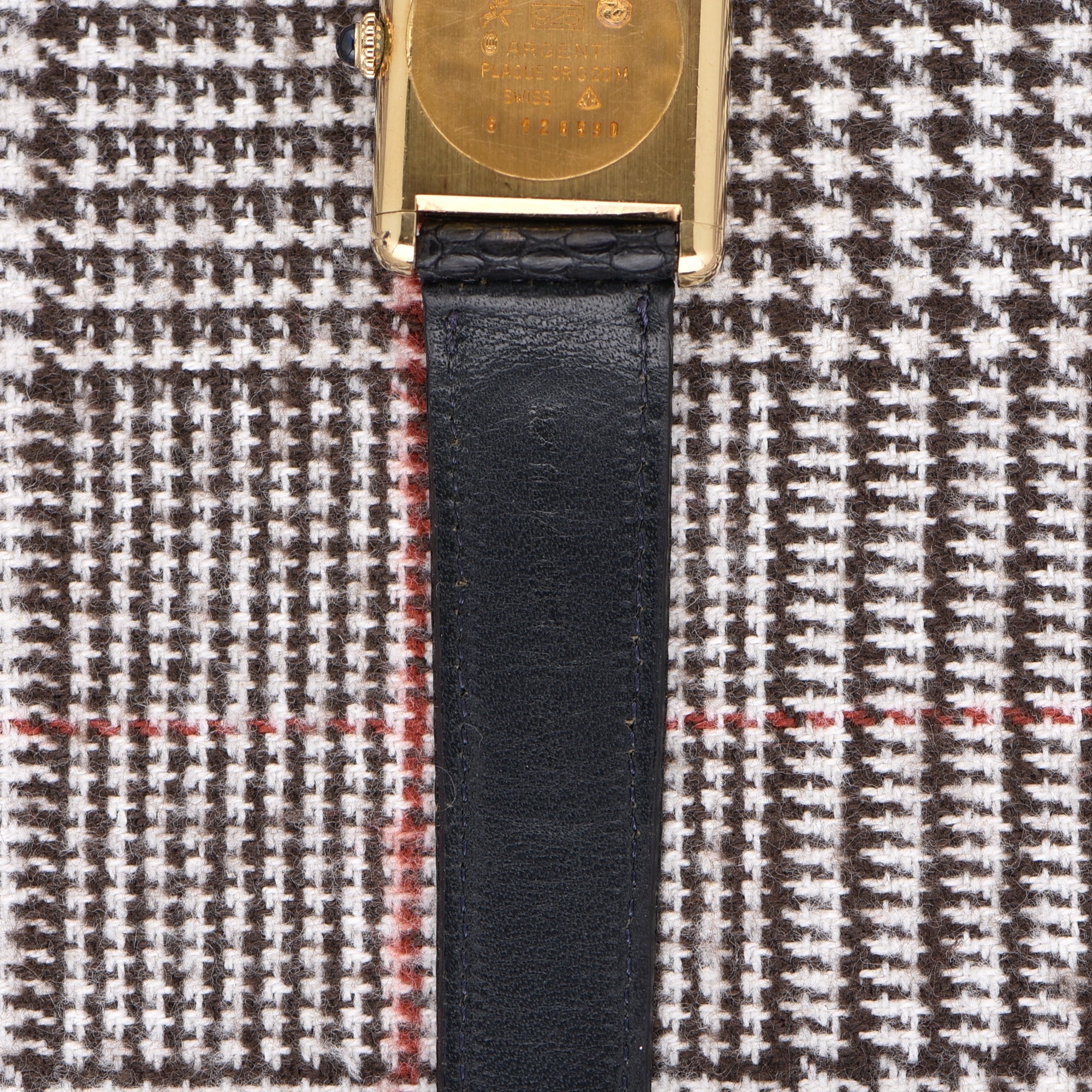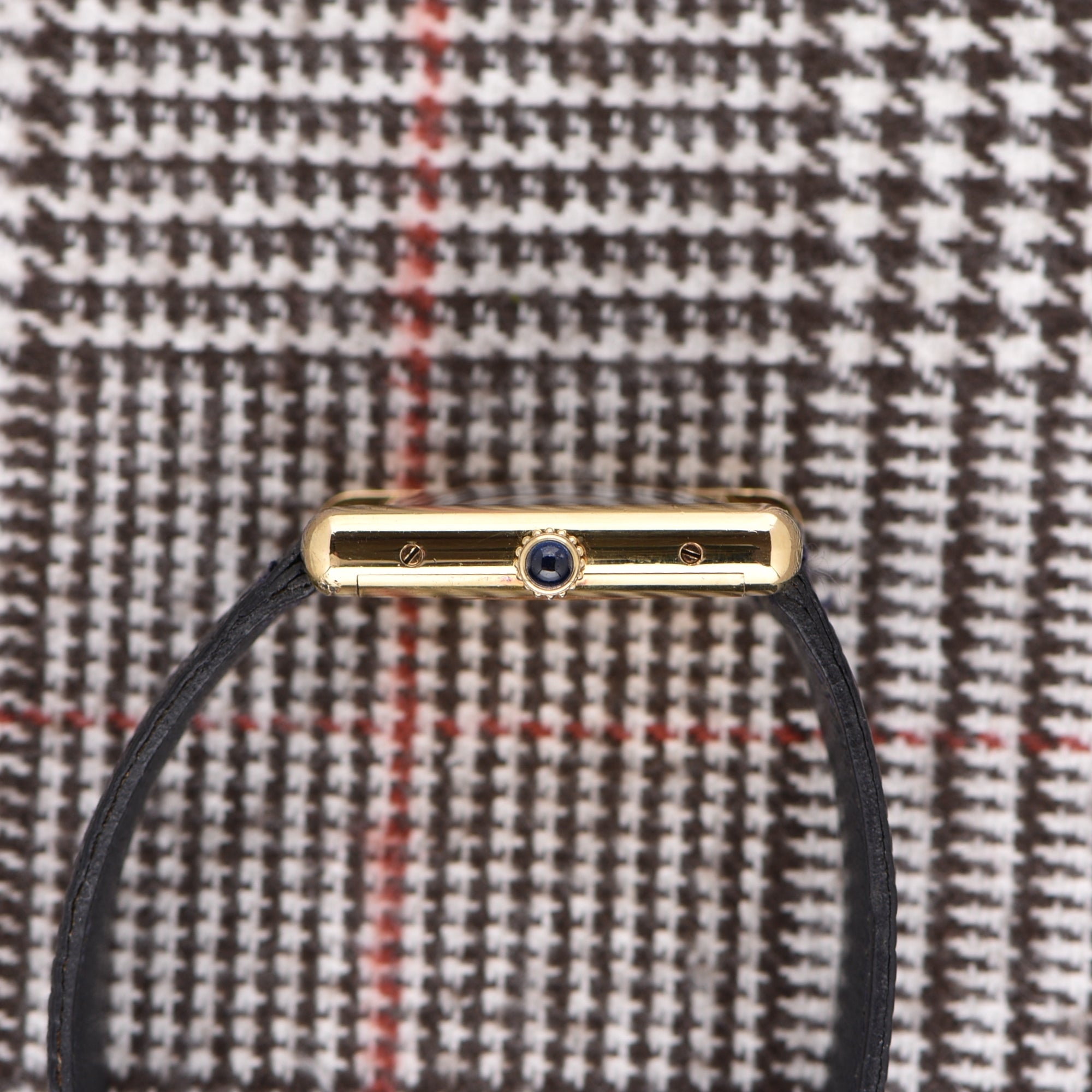 This Cartier Tank is in great condition. The blue dial has some of the nicest speckling with some spidering. The watch houses a manual movement. The case has no plate wearing on any part of the gold with the only noticeable mark being on the back of one of the lugs. The strap is original with Must De Tank still faintly stamped.