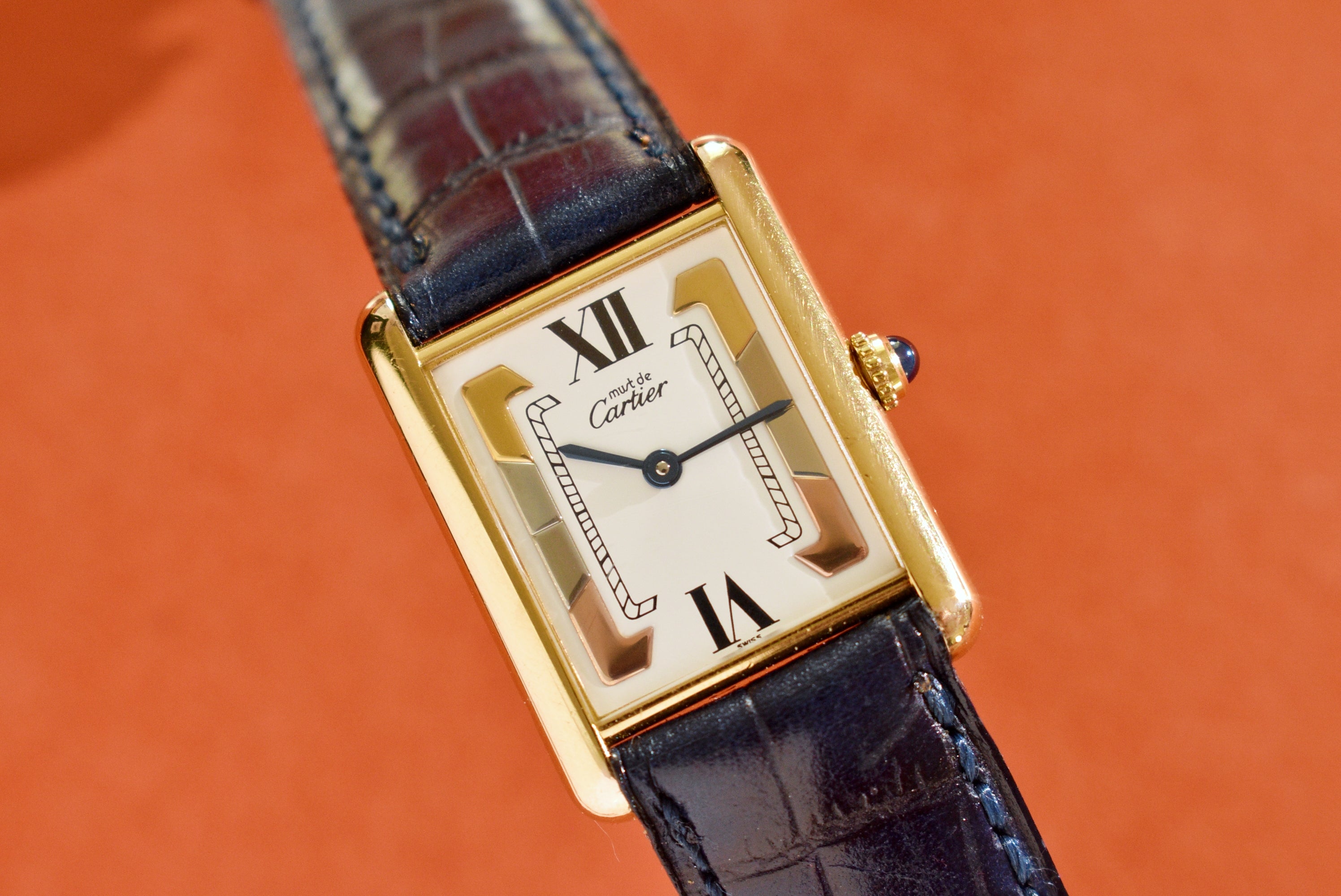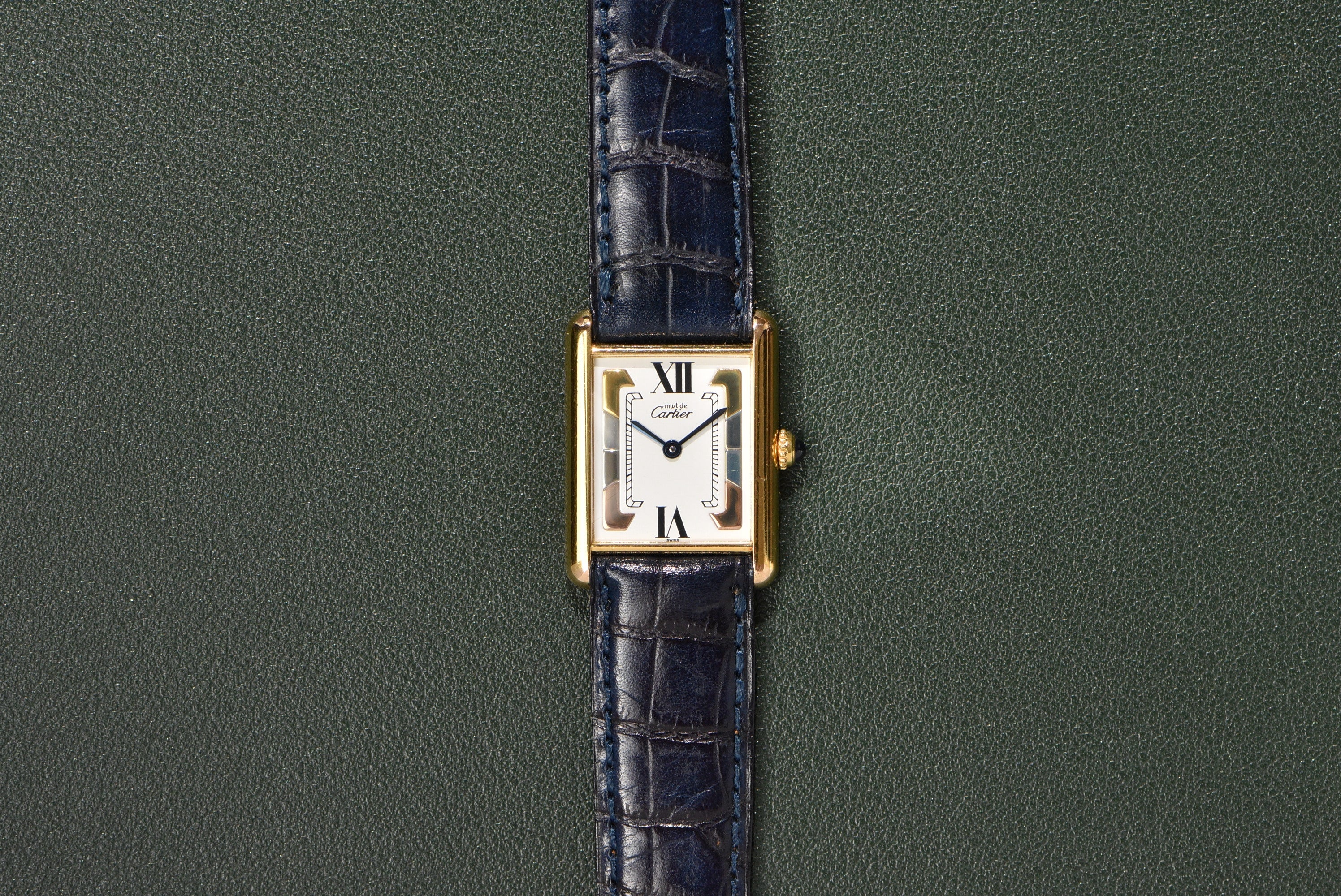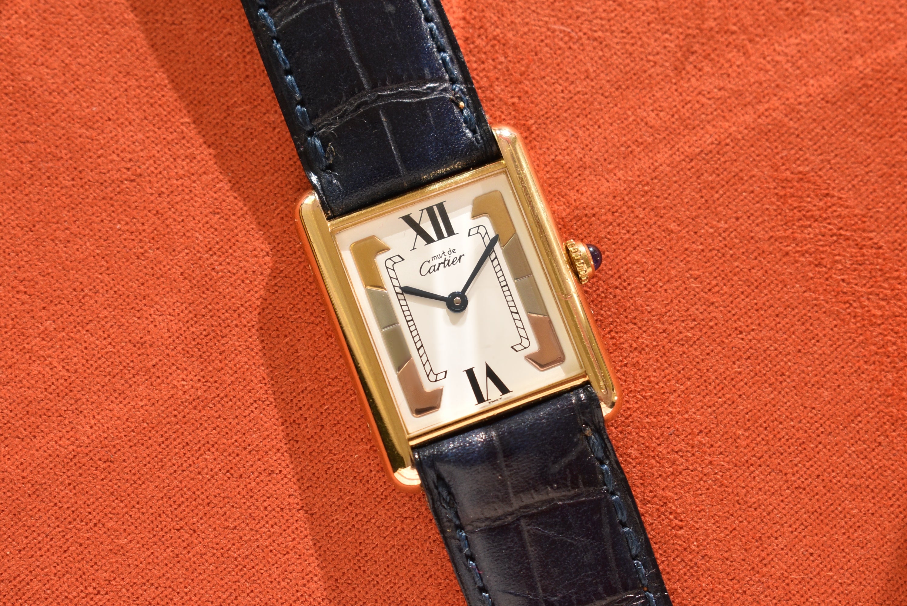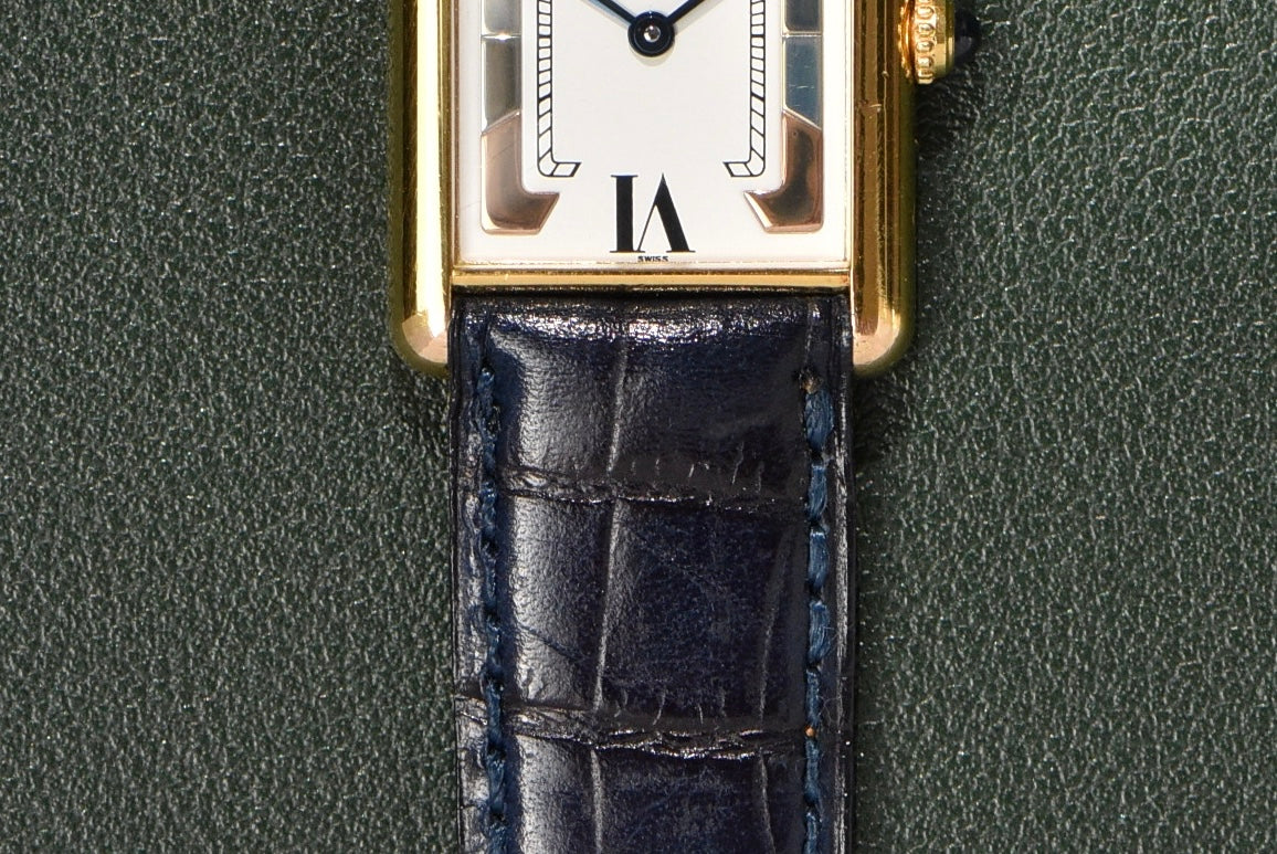 This dial is relatively uncommon in the world of neo-vintage Tanks. The case is in excellent condition, with all the gold plating still intact. The enamel dial is also in great condition, with no serious cracking or aging at all. The watch comes on a Daniel Mink navy strap.