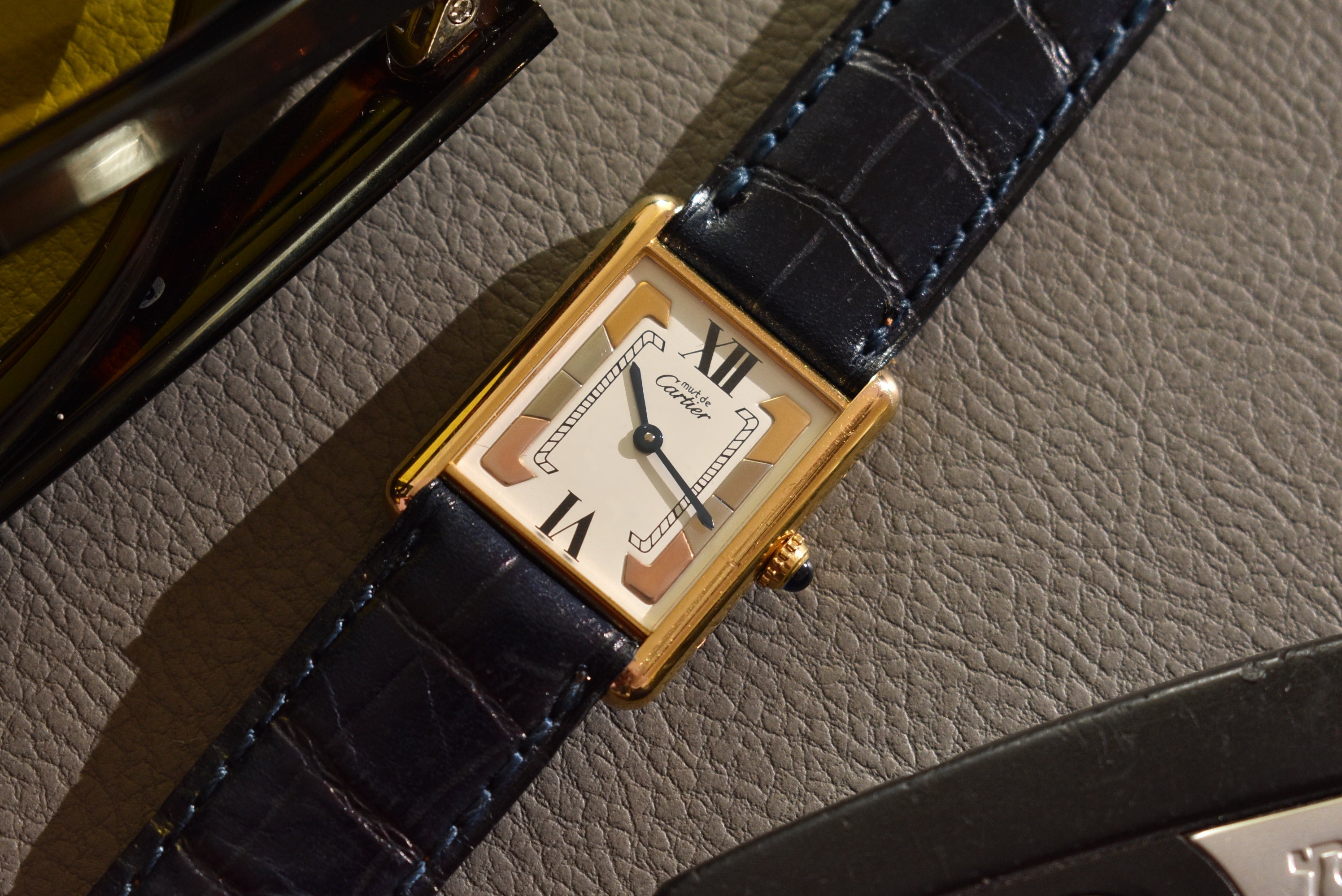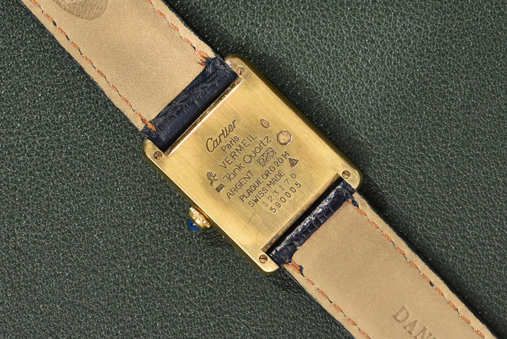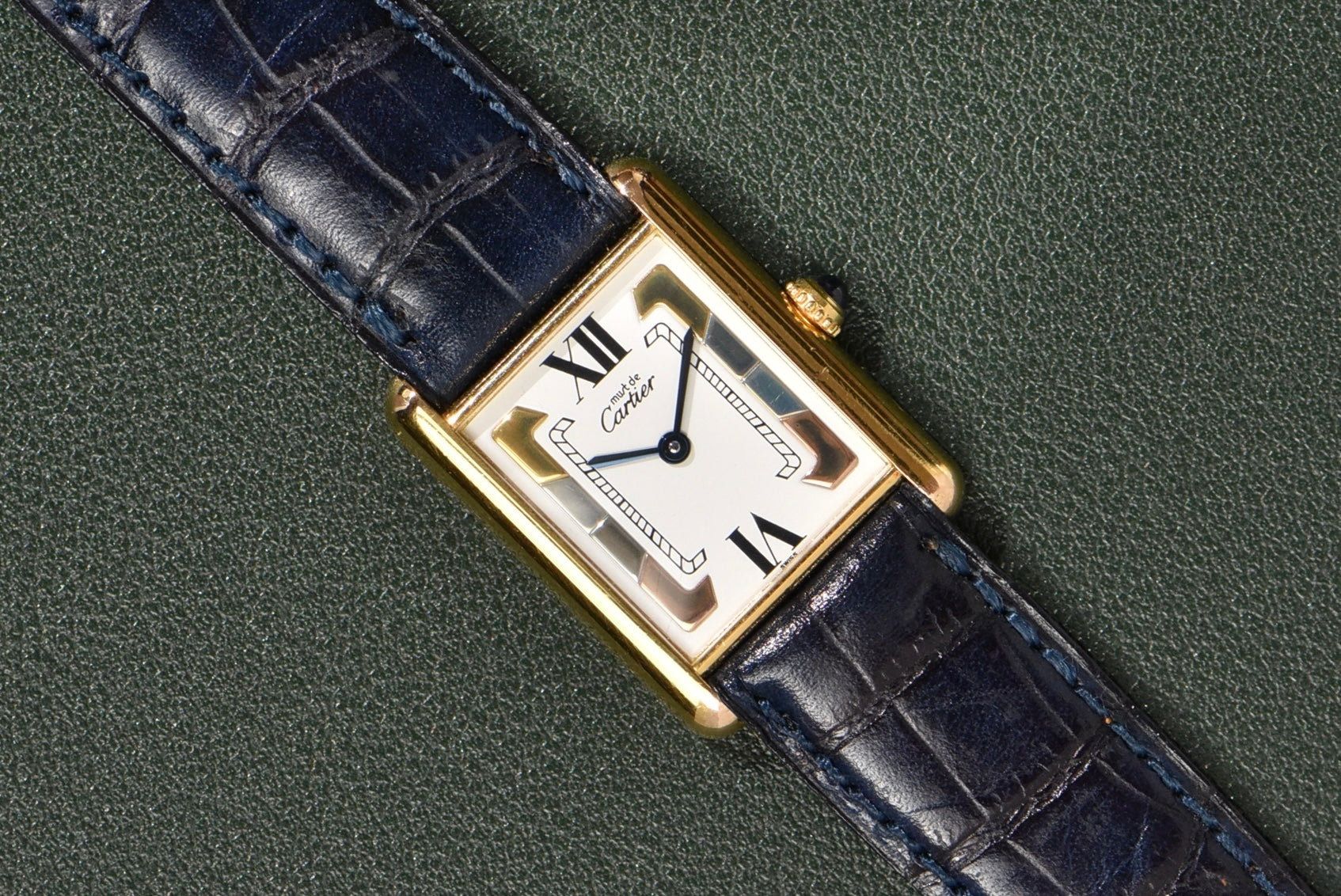 This dial is relatively uncommon in the world of neo-vintage Tanks. The case is in excellent condition, with all the gold plating still intact. The enamel dial is also in great condition, with no serious cracking or aging at all. The watch comes on a Daniel Mink navy strap.