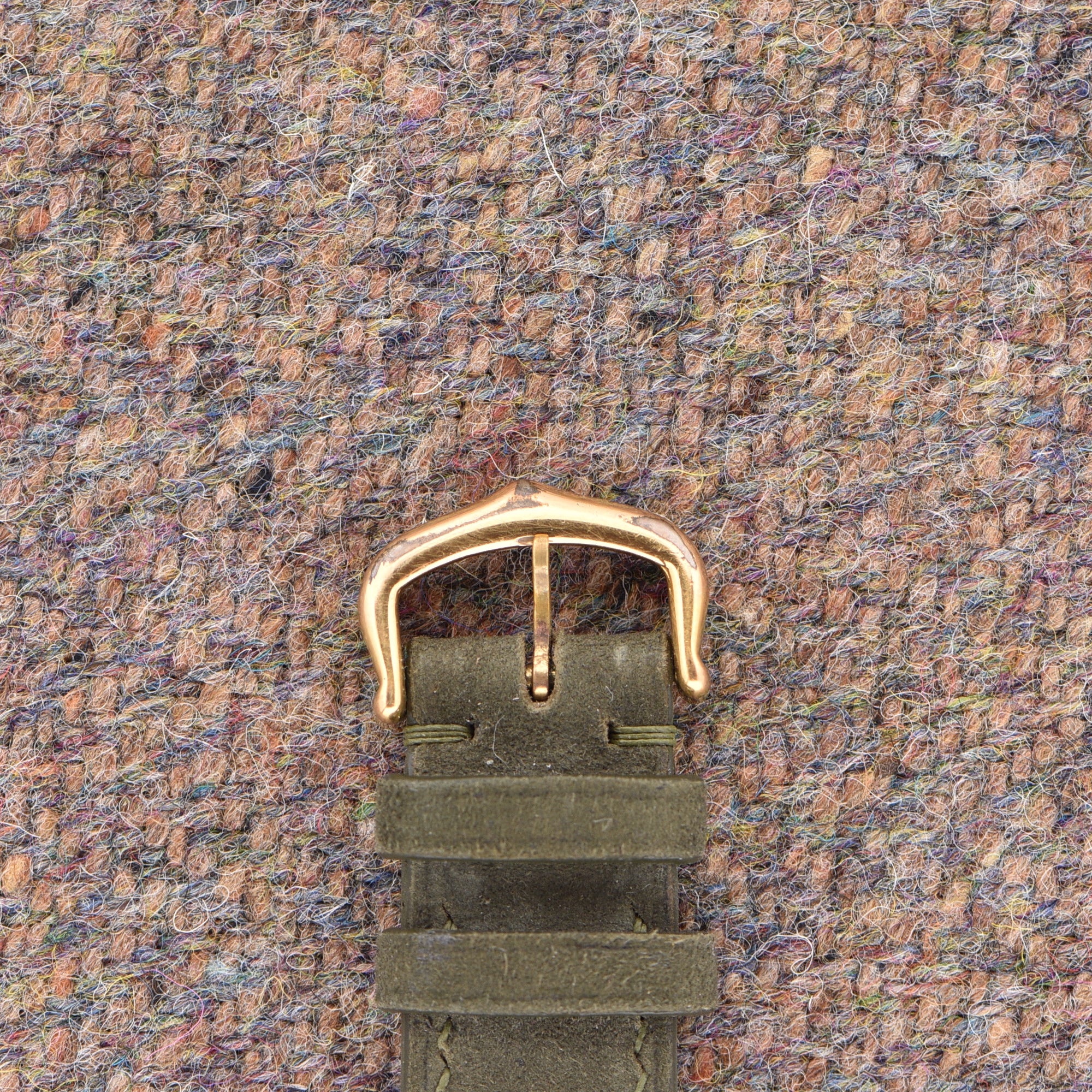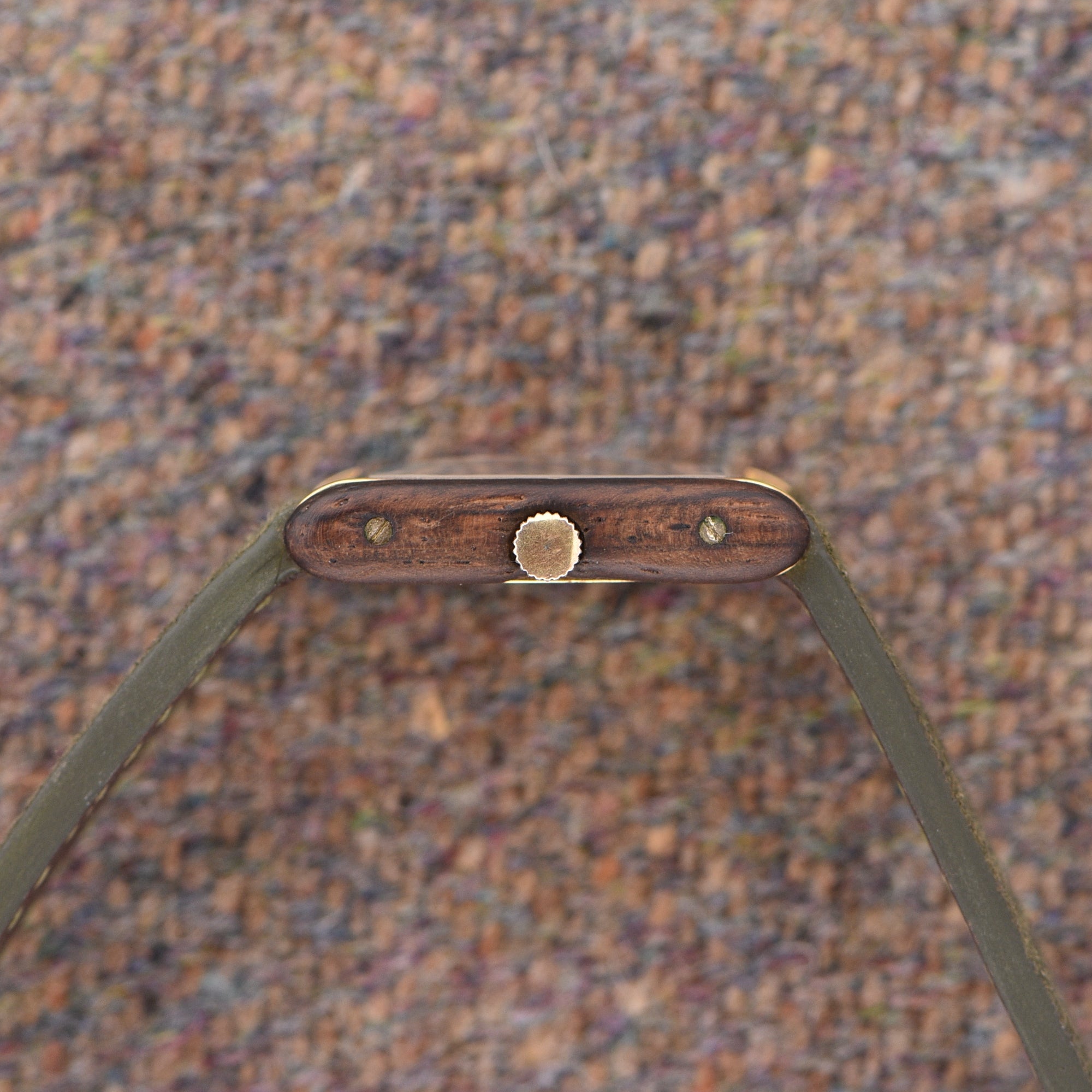 The wood trim on the dial and case sides is all still in great condition. The case back shows some wear, but nothing that would affect wearability. The watch does come with a non-cabochon crown, which is not original but looks quite fitting with its design. It also comes on our suede strap with its original buckle.