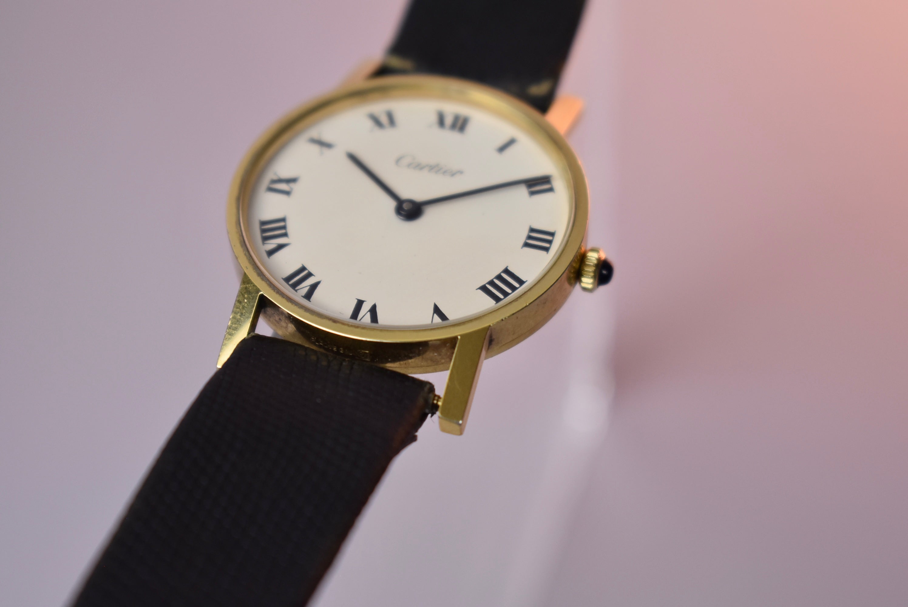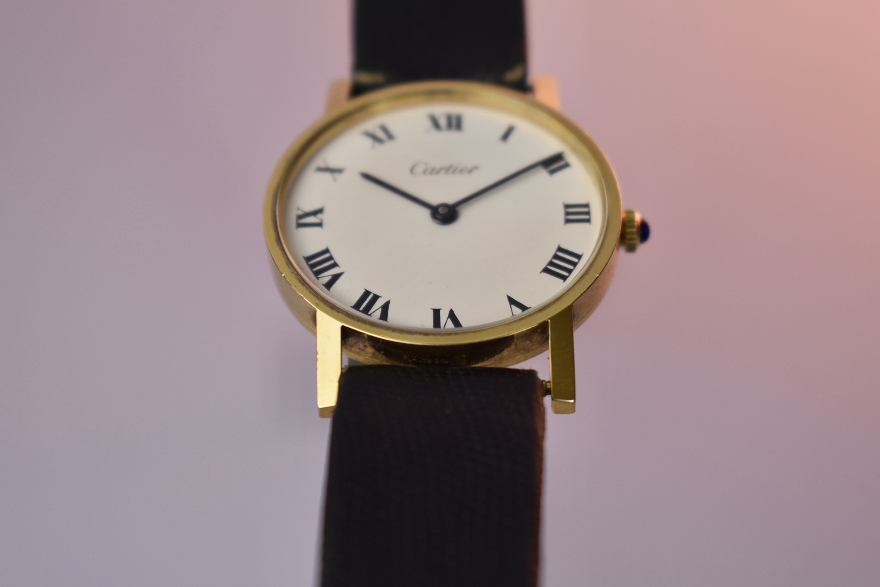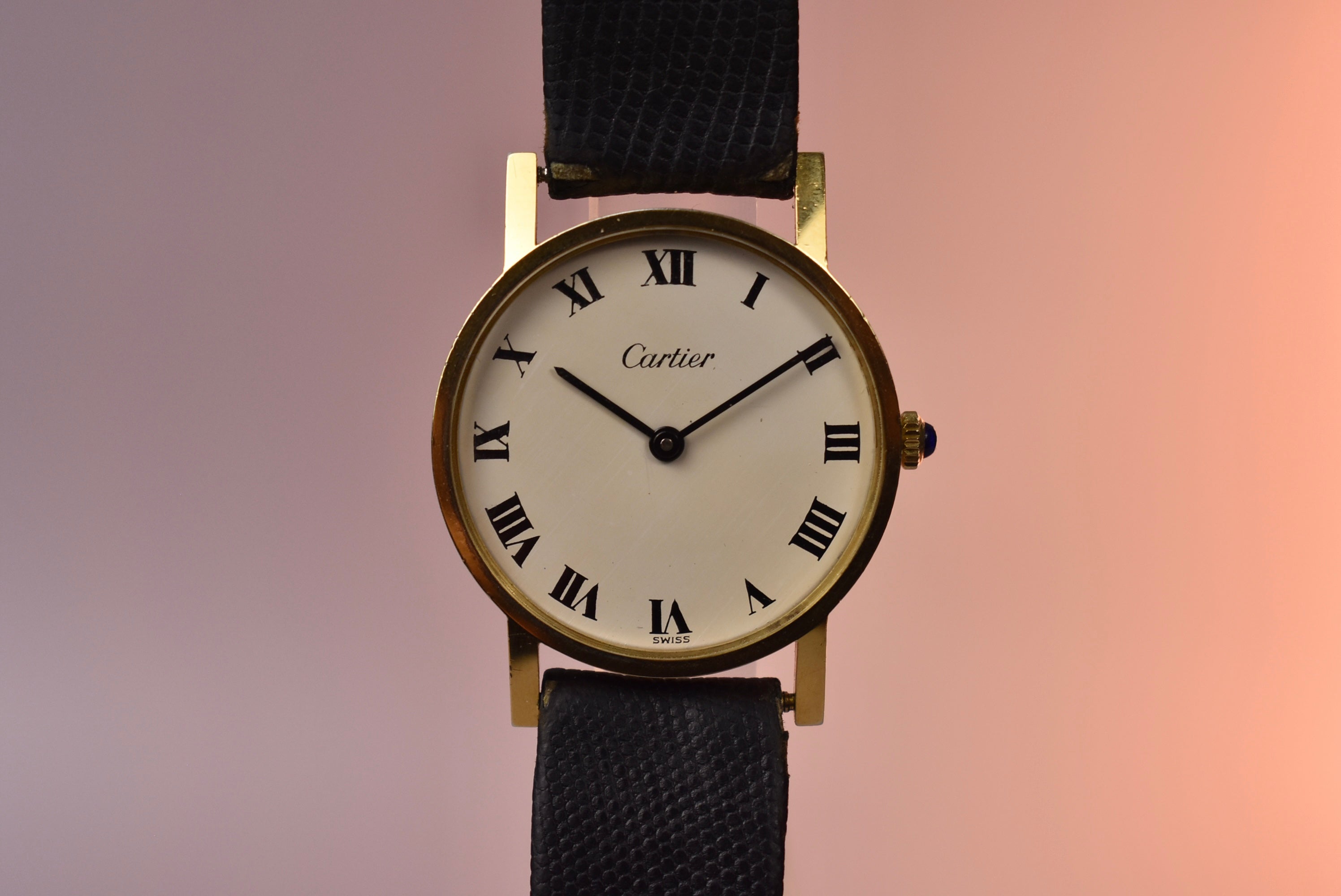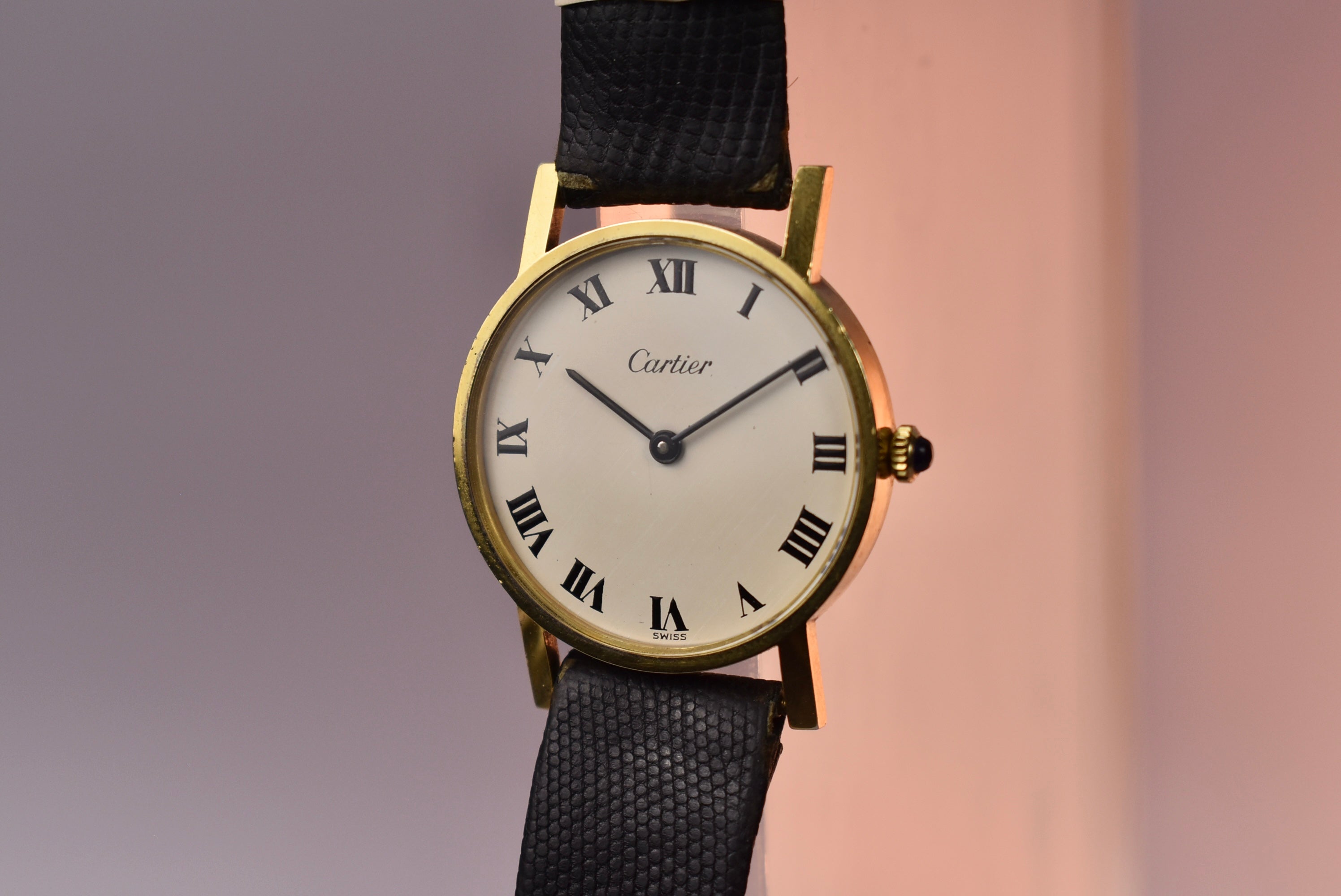 This example is a bit different. Part of the Ronde Collection, this Cartier features a round case and dial. It also comes on its original strap and buckle. The movement inside is a Swiss Manual wind.