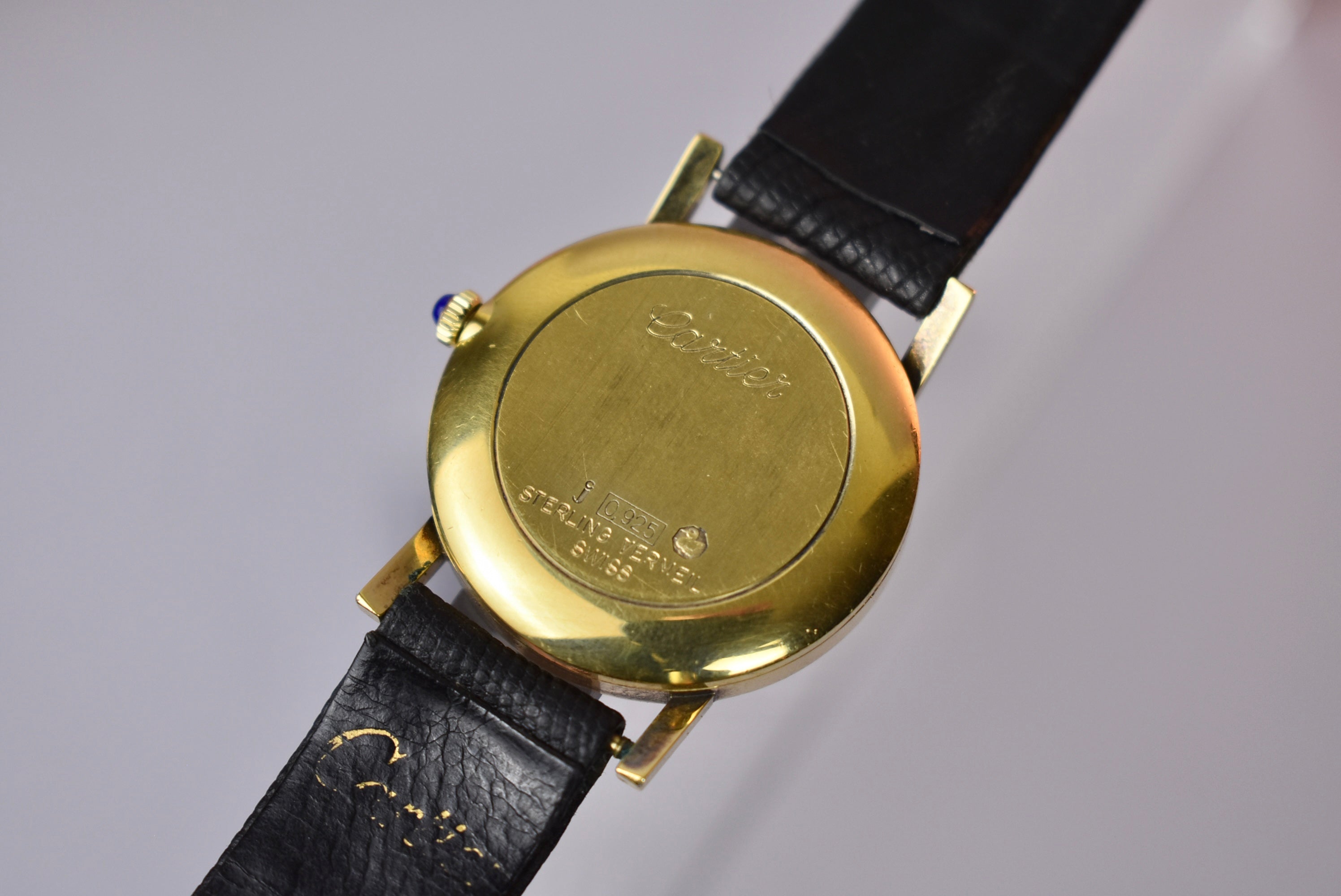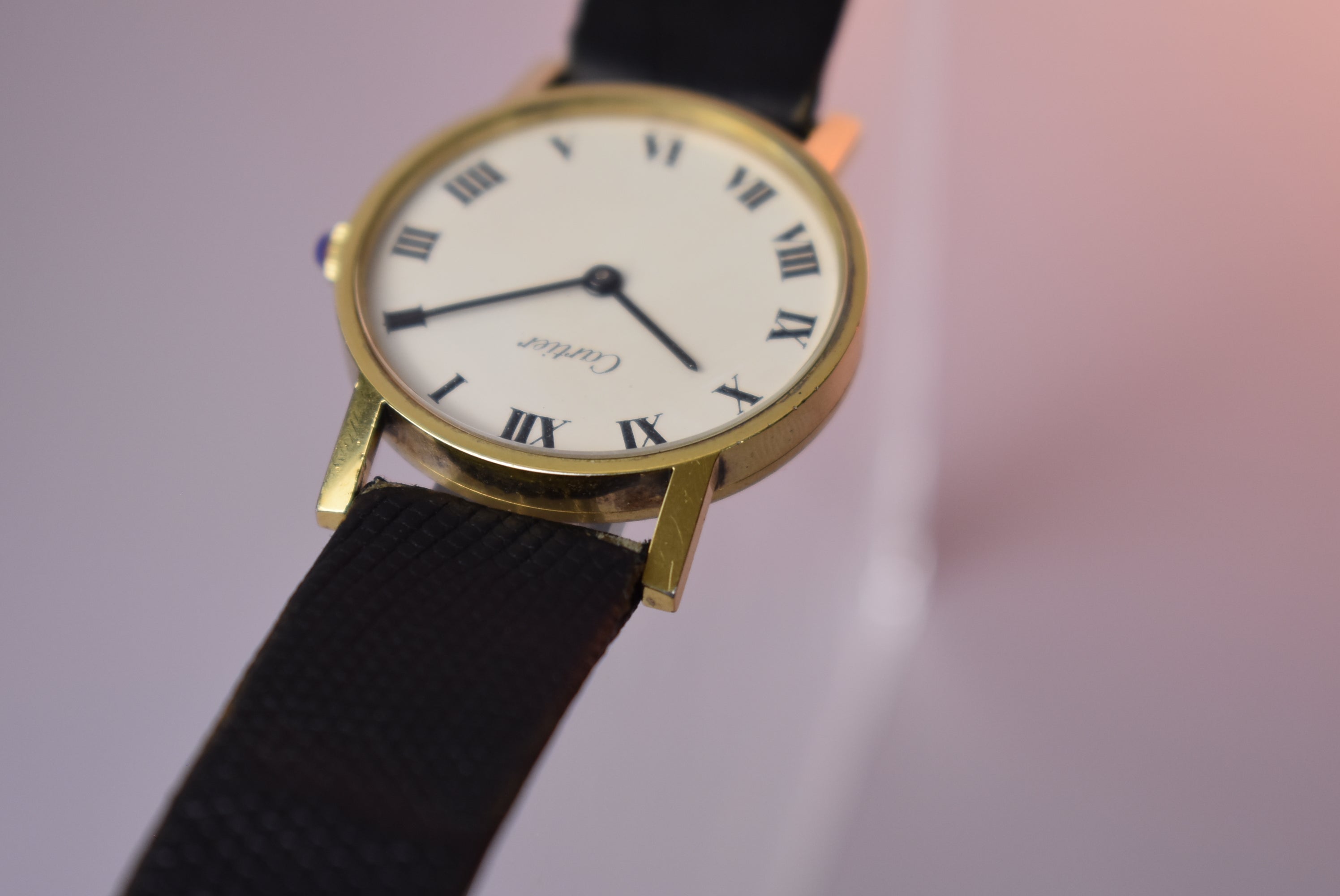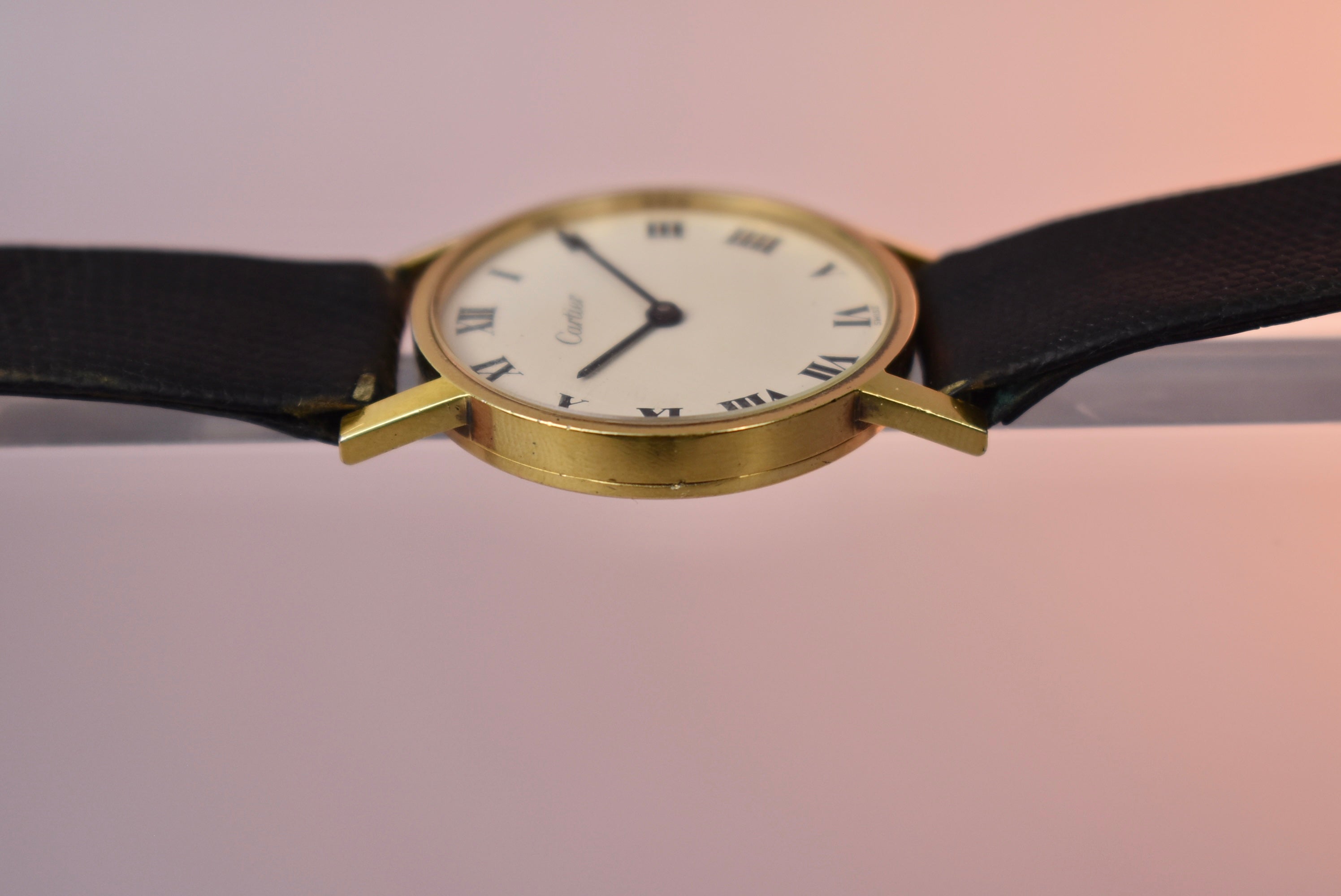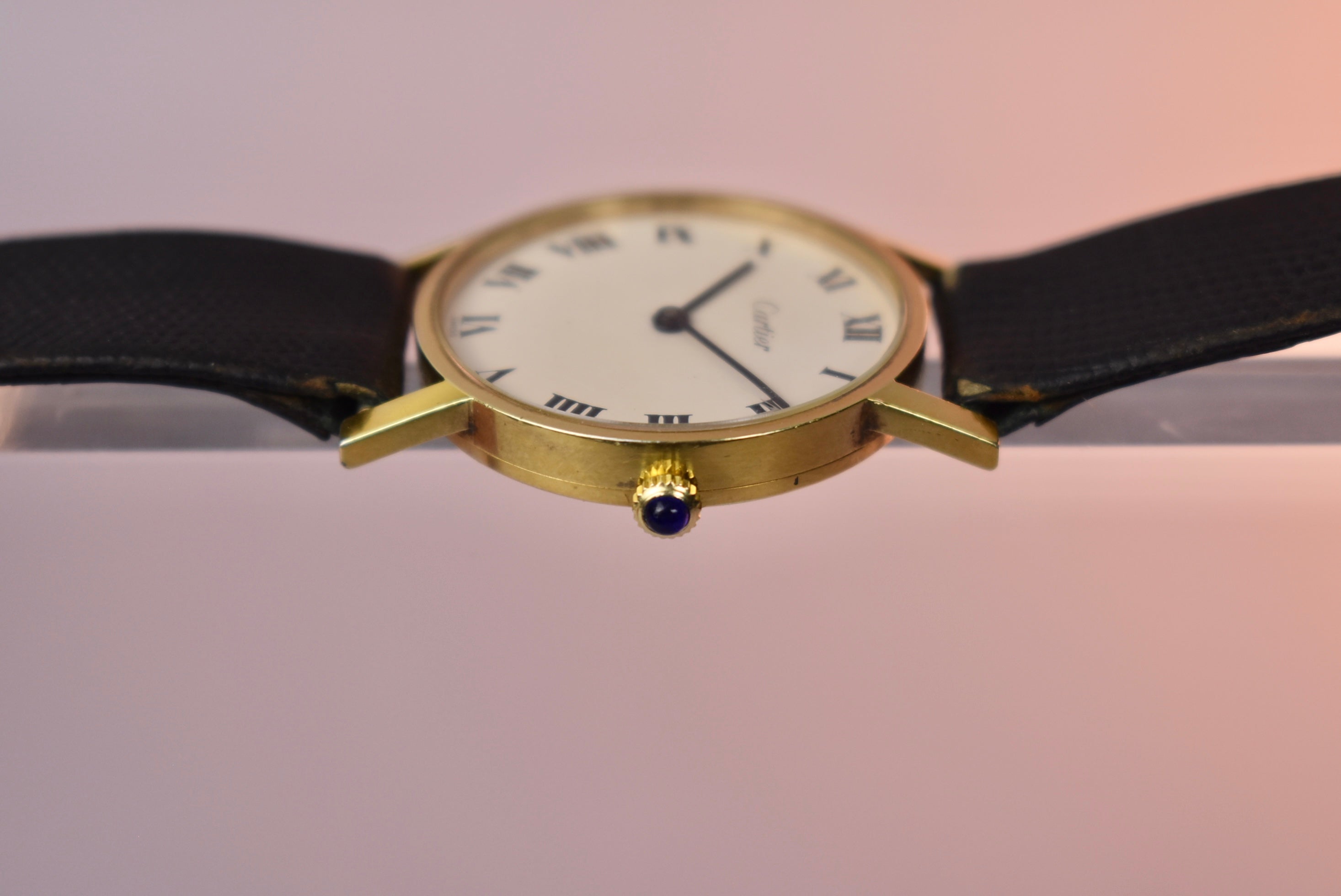 This example is a bit different. Part of the Ronde Collection, this Cartier features a round case and dial. It also comes on its original strap and buckle. The movement inside is a Swiss Manual wind.