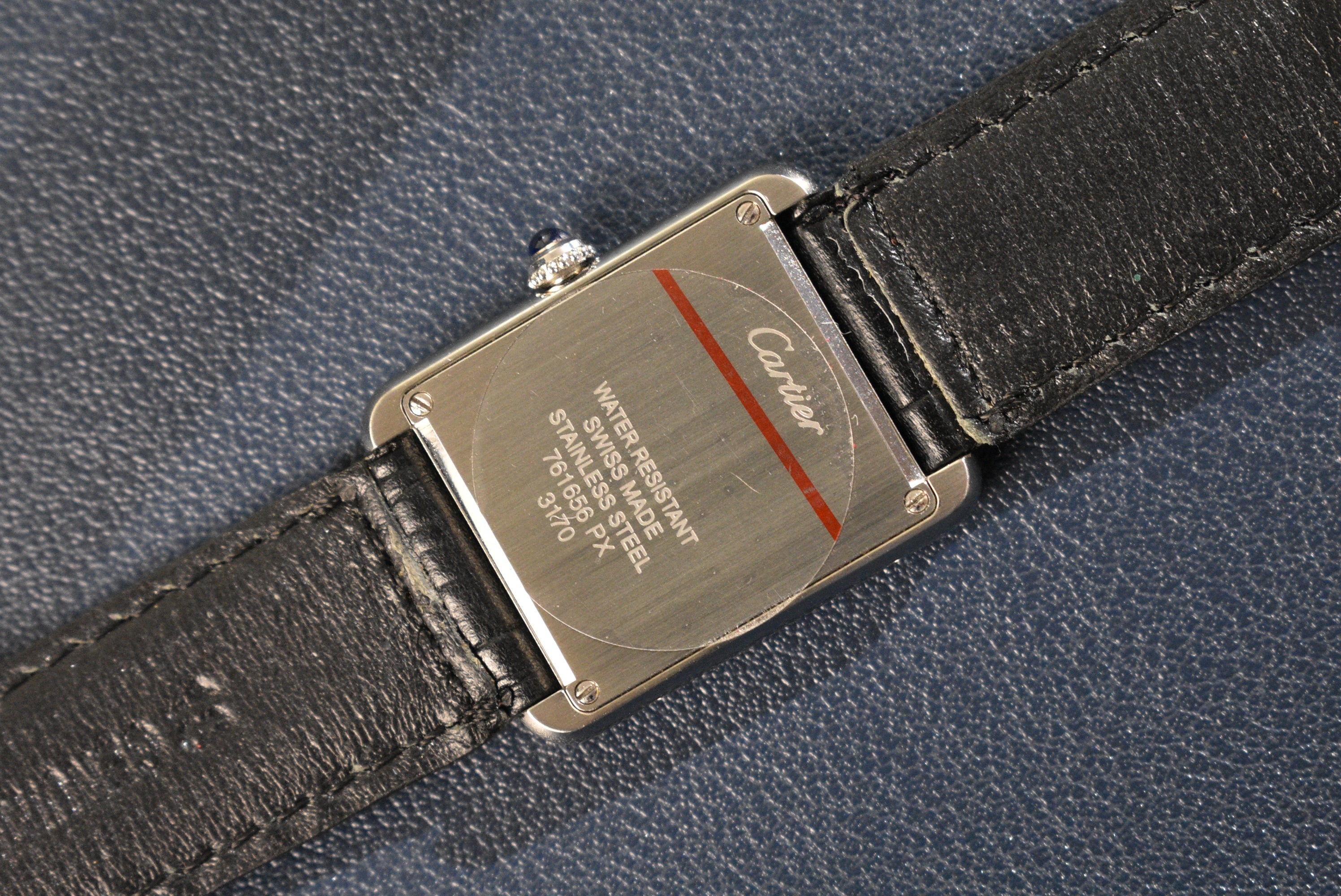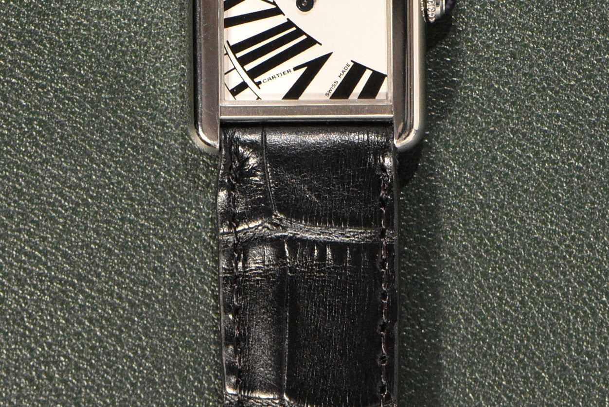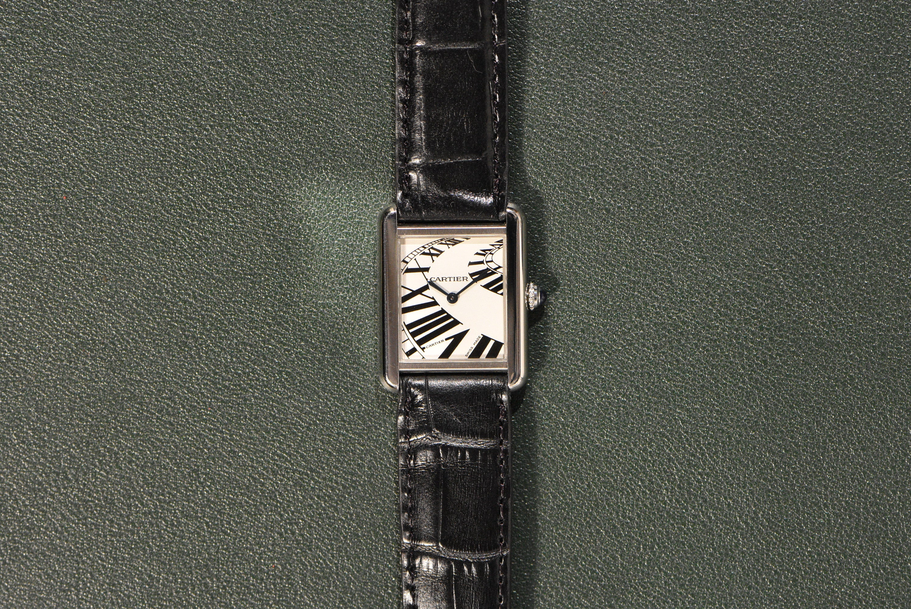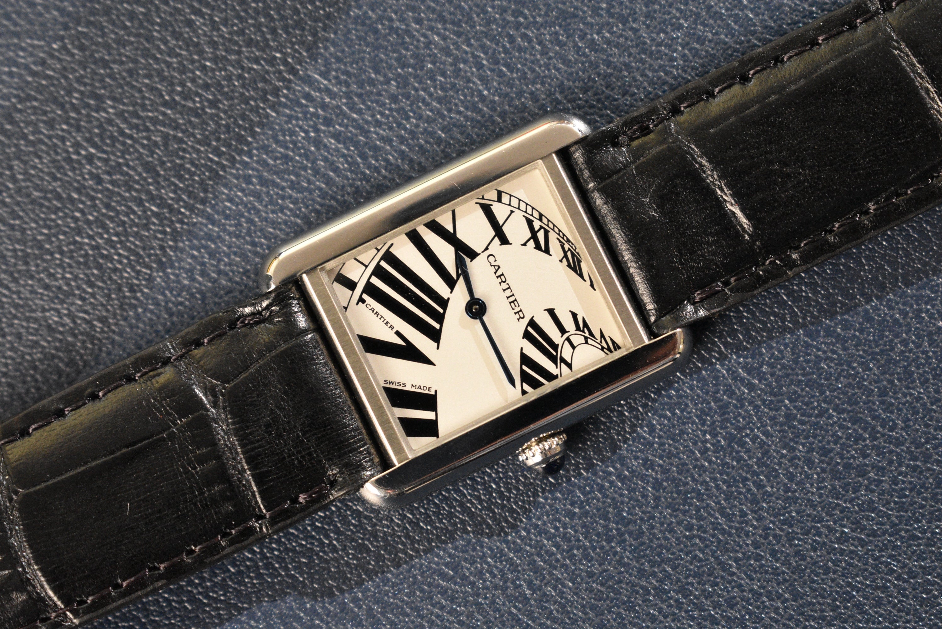 This rare iteration of the Tank Solo features a "Piano" dial that wraps around the dial from 6 to 12. The watch is in very good condition throughout and even has the original case back sticker still intact. The watch comes on a non-Cartier strap and buckle.