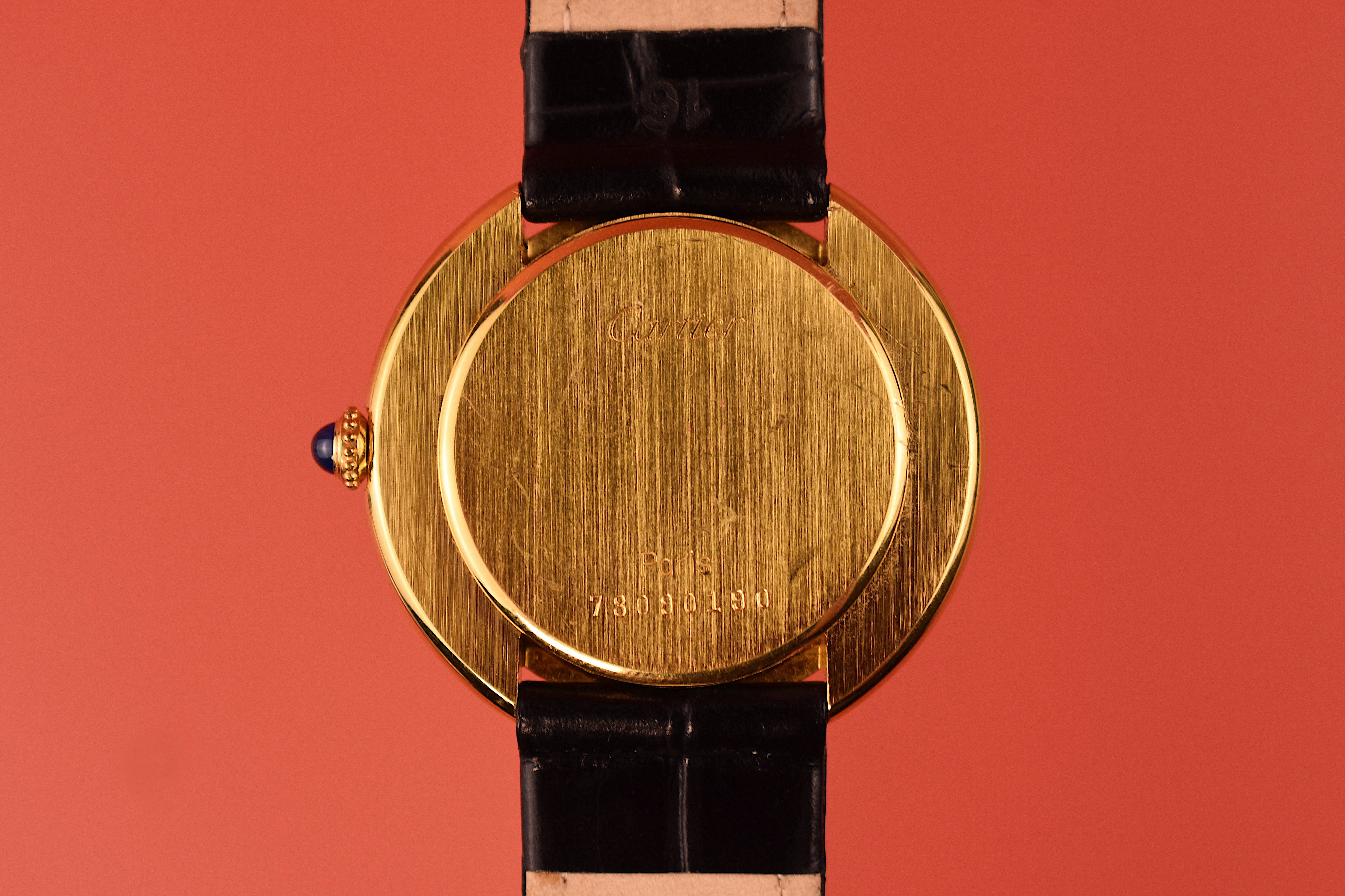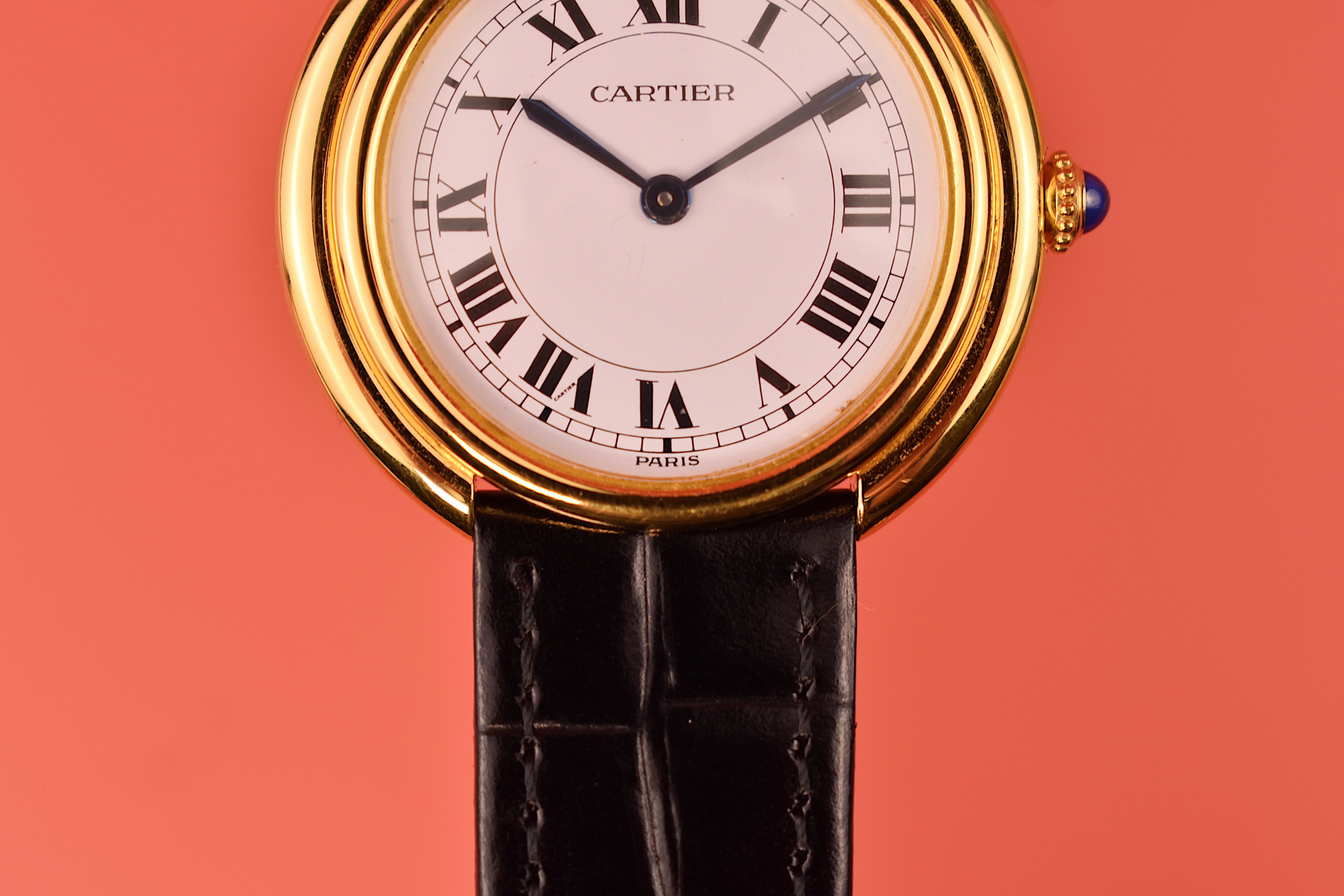 Cartier is known for class and elegance and this perfectly shows that. A clean step case surrounding the white dial with big Roman numerals. This piece also features the word “PARIS” under the Six where “Swiss Made” would usually be found.