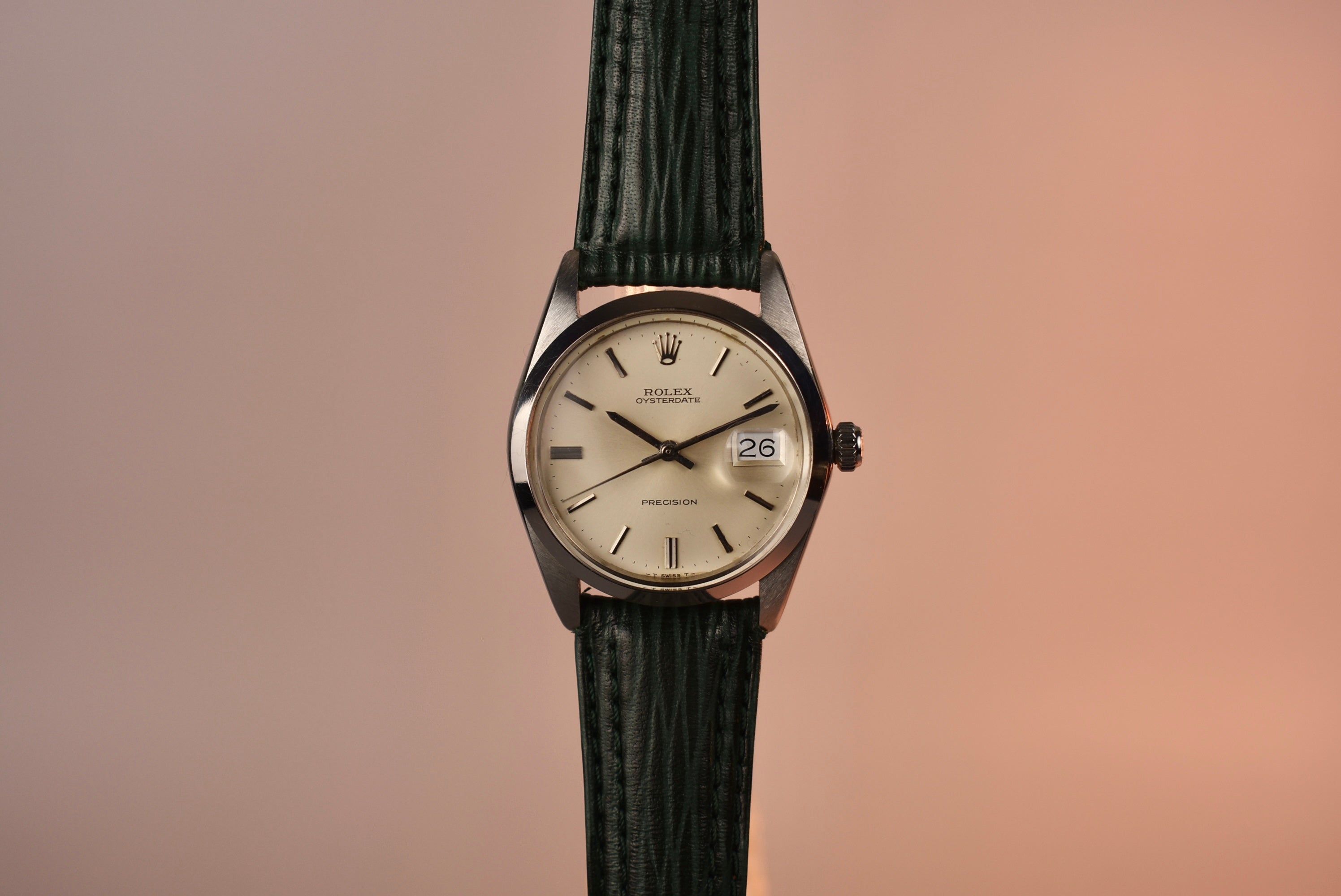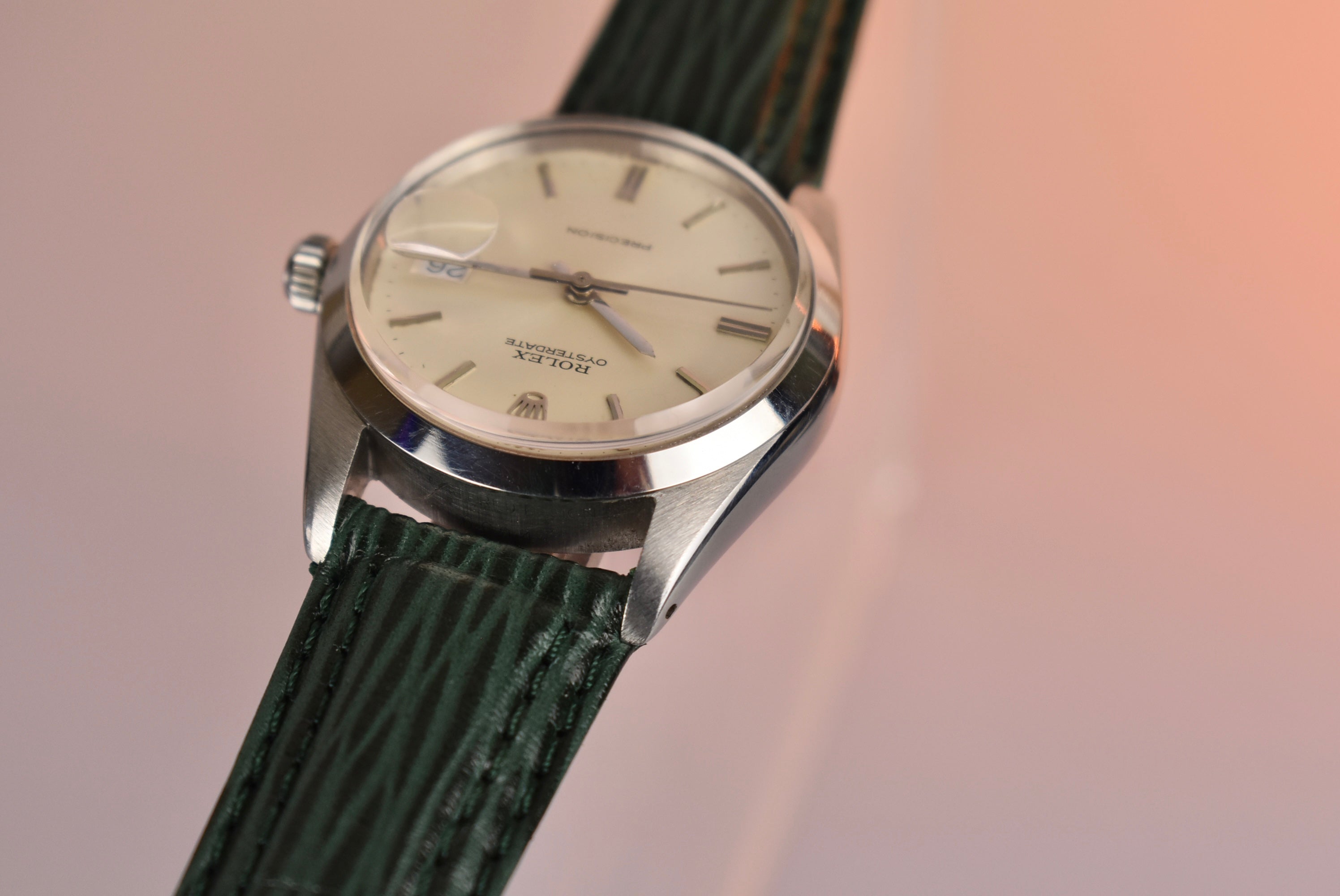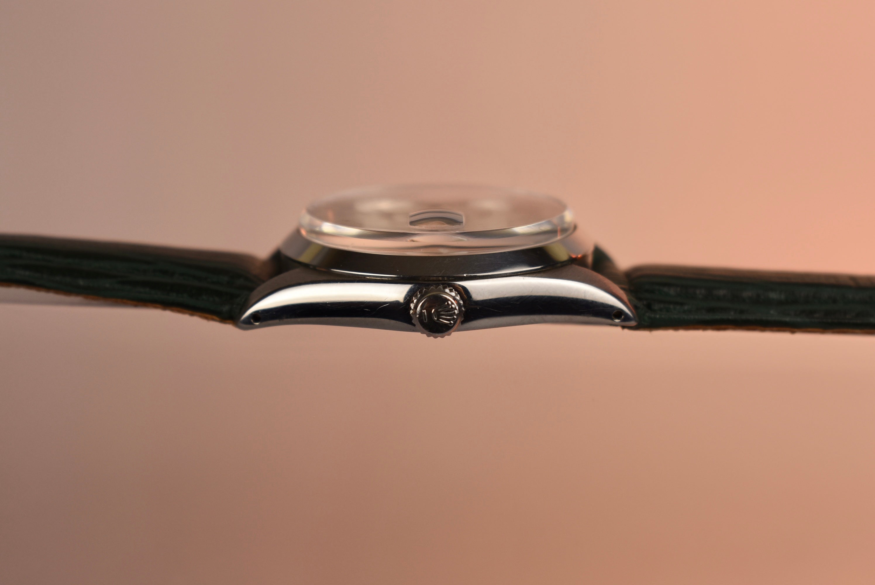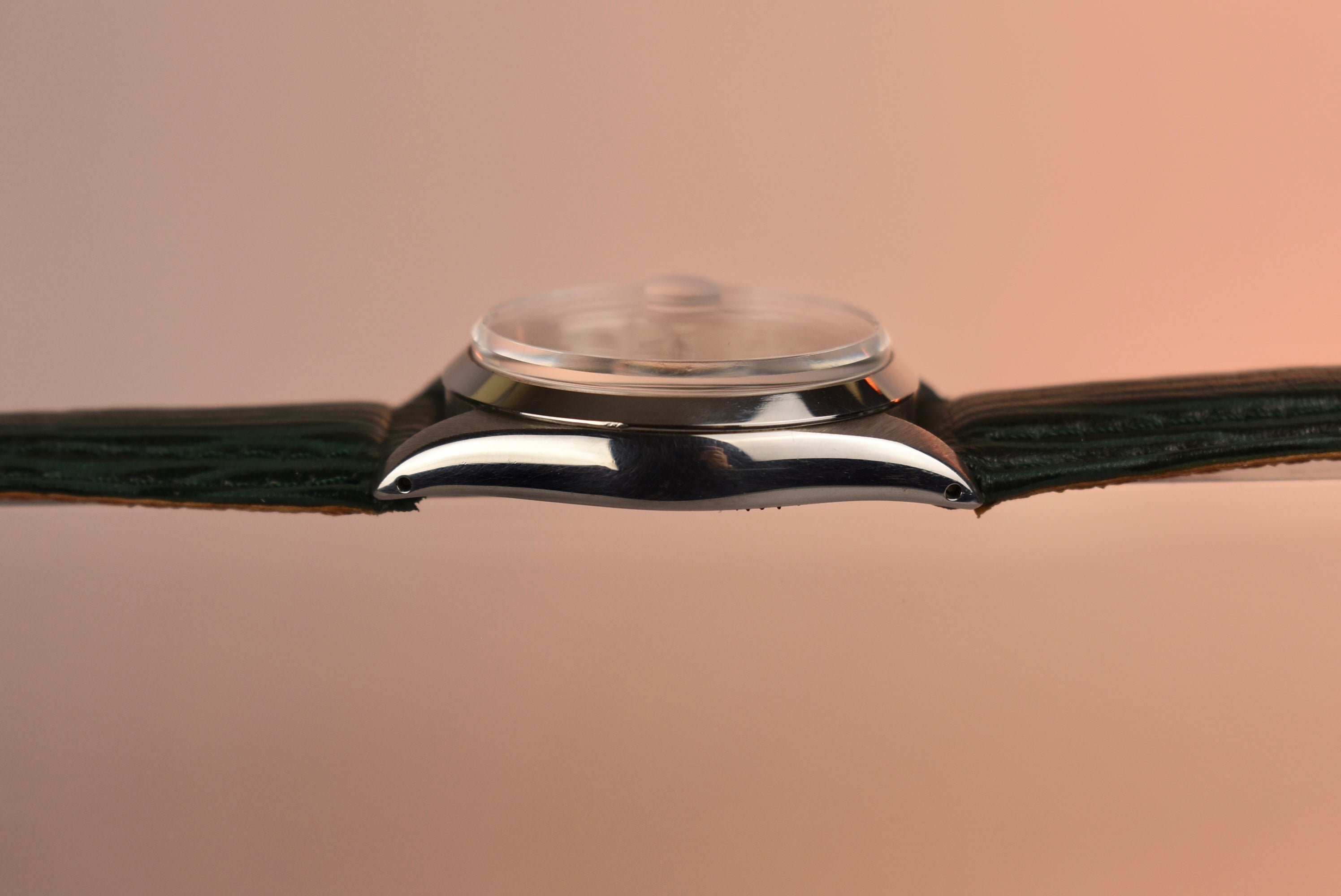 Before there were ever datejusts, there were oysterdates and no-date oysters. A simple, manually wound, 34mm Rolex. Totally different to any 34mm omega or Patek, the 34mm Rolexs wear bigger and nicer on the wrist. Nothing wrong with owning a more affordable and smaller rolex, that’s what makes these so great. This example has a super clean glacier white dial and is fitted on a dark green shark strap.