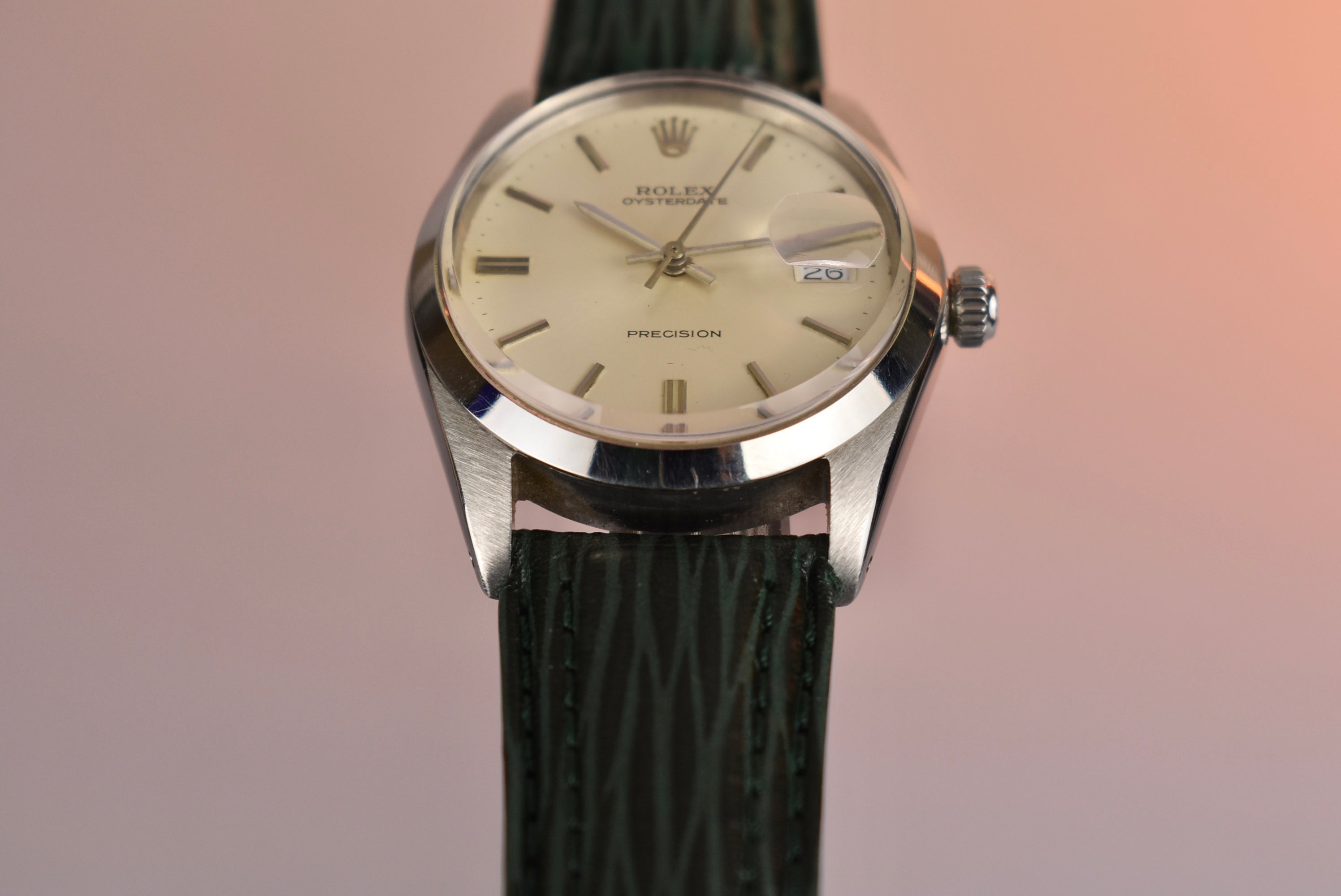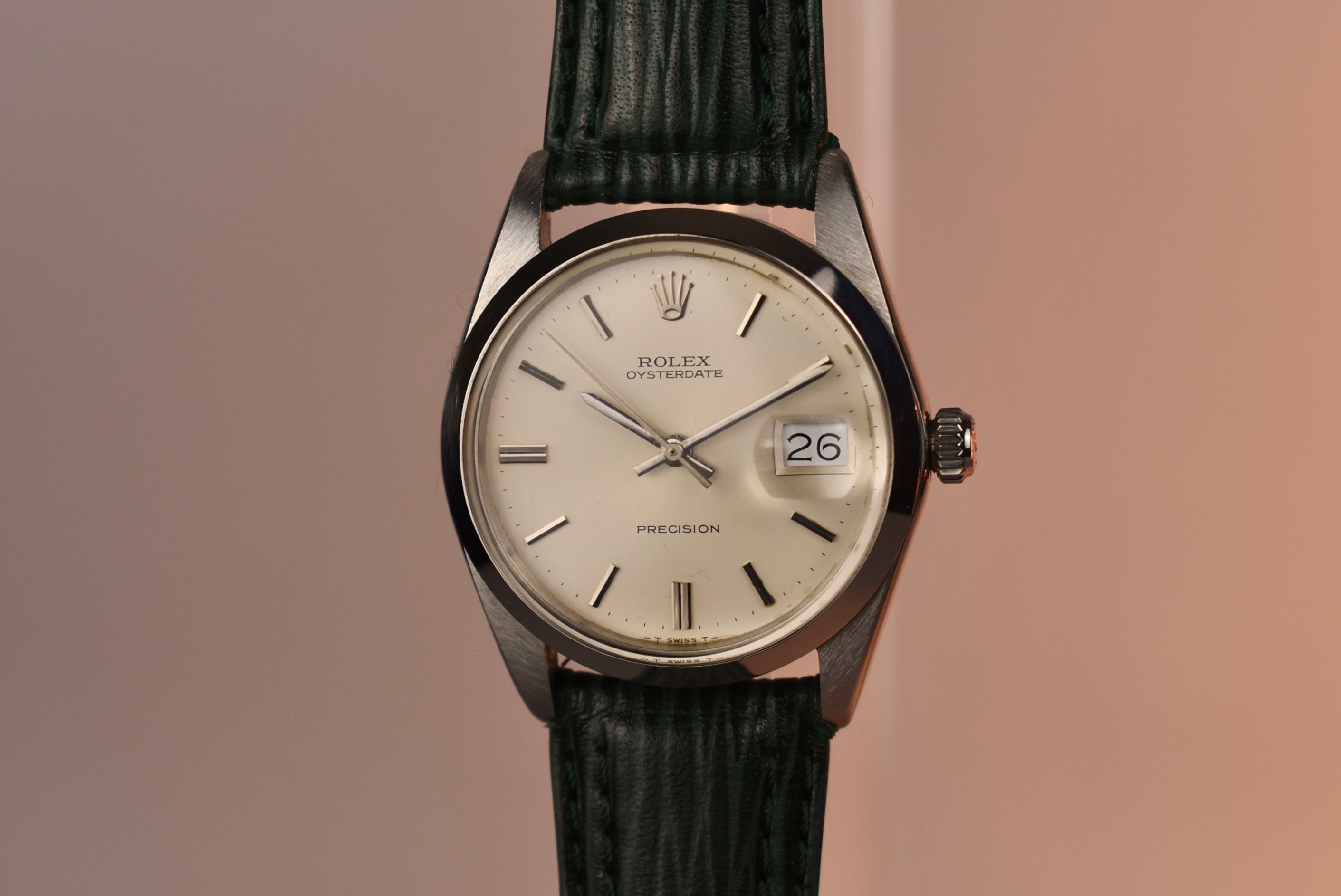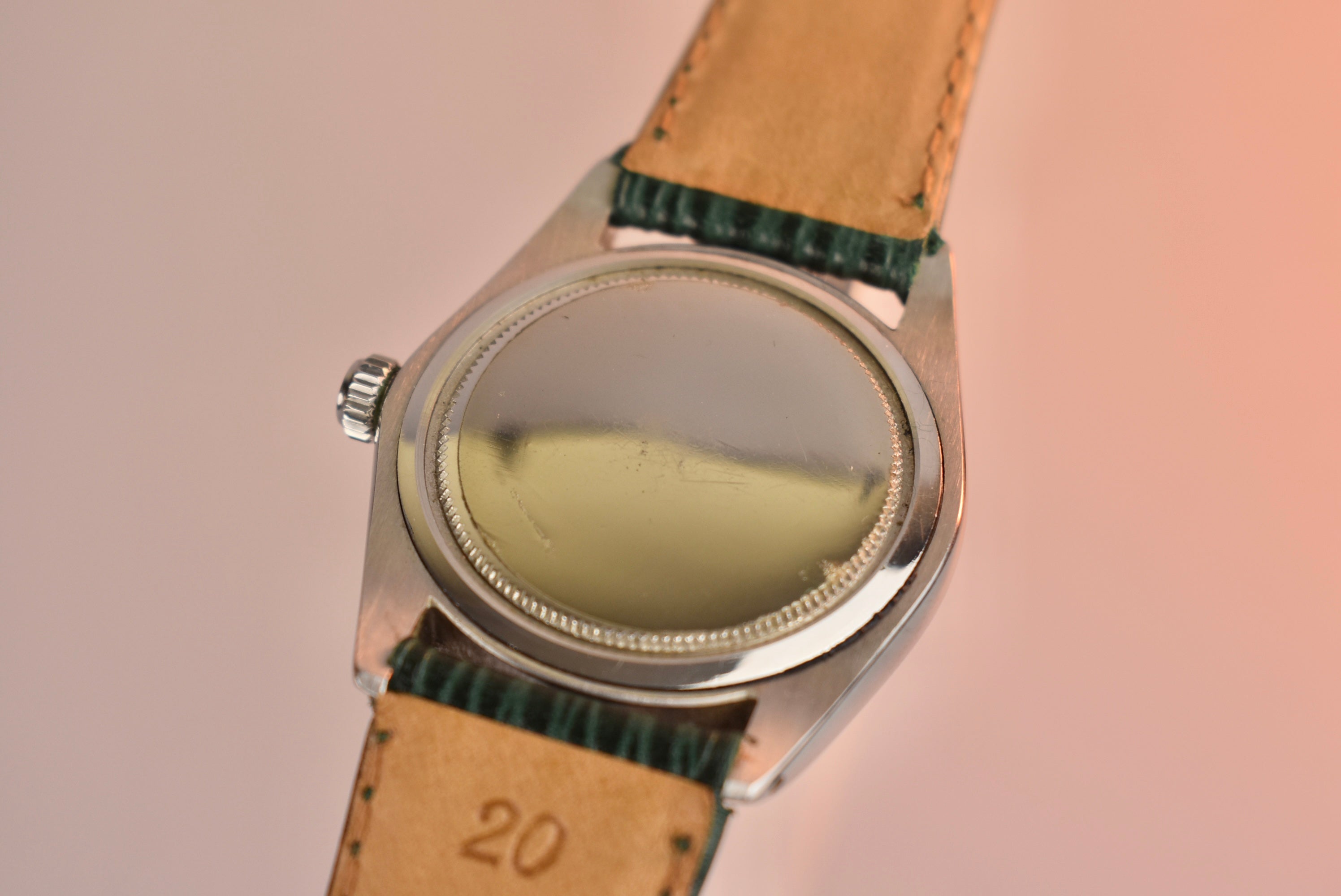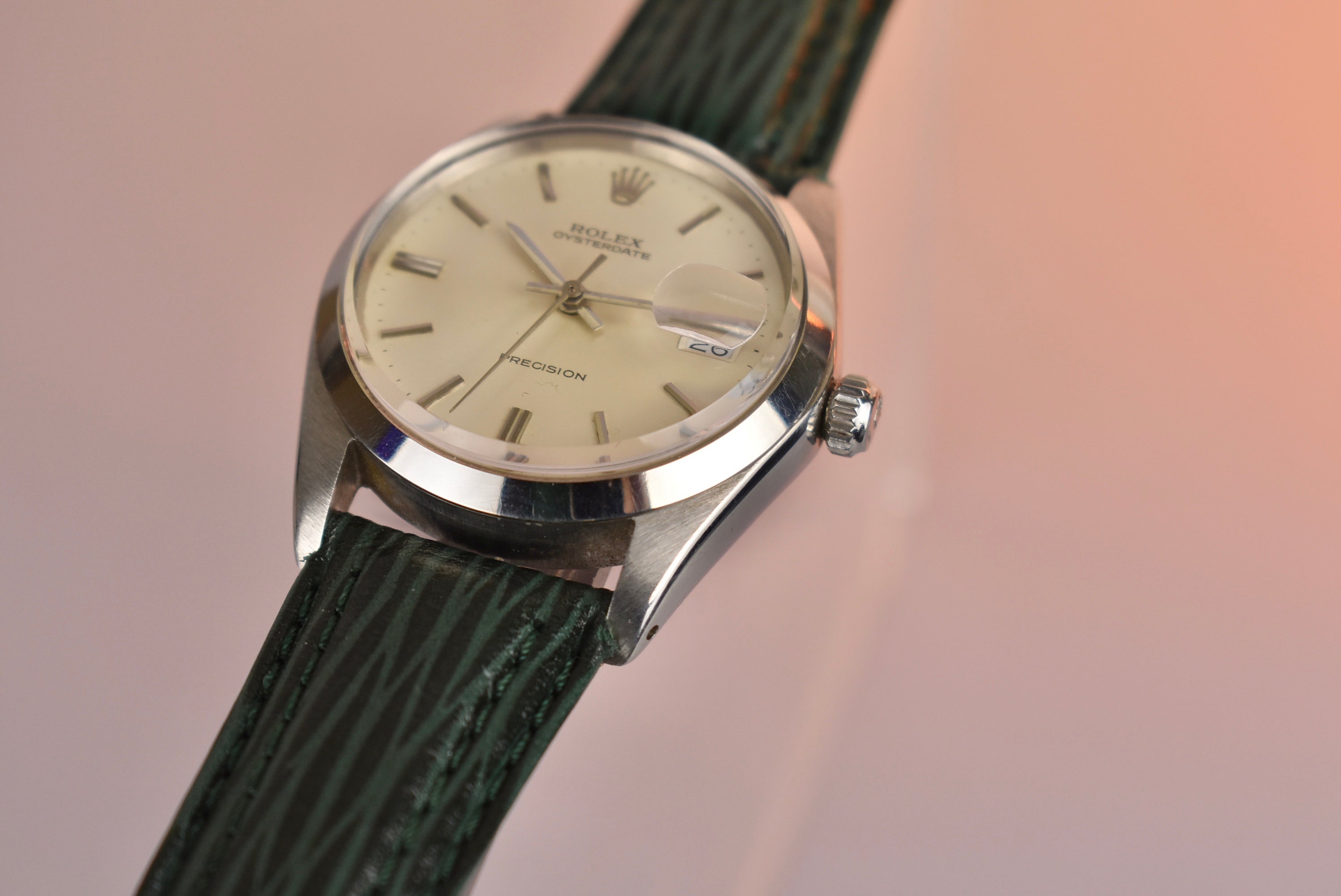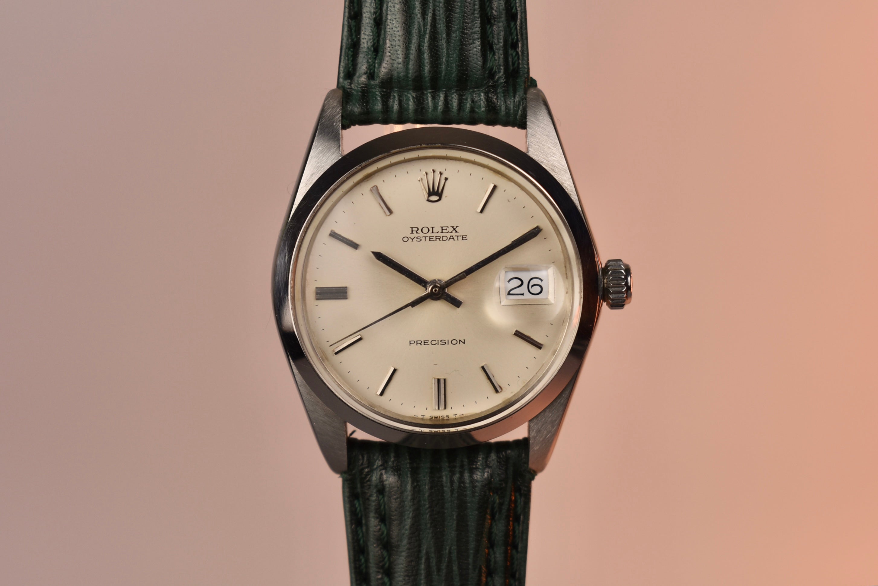 Before there were ever datejusts, there were oysterdates and no-date oysters. A simple, manually wound, 34mm Rolex. Totally different to any 34mm omega or Patek, the 34mm Rolexs wear bigger and nicer on the wrist. Nothing wrong with owning a more affordable and smaller rolex, that’s what makes these so great. This example has a super clean glacier white dial and is fitted on a dark green shark strap.