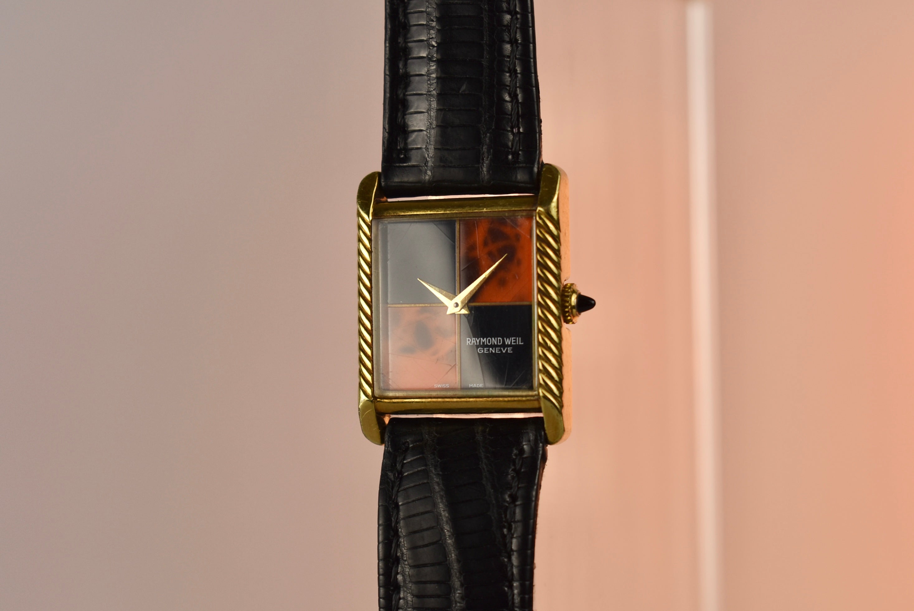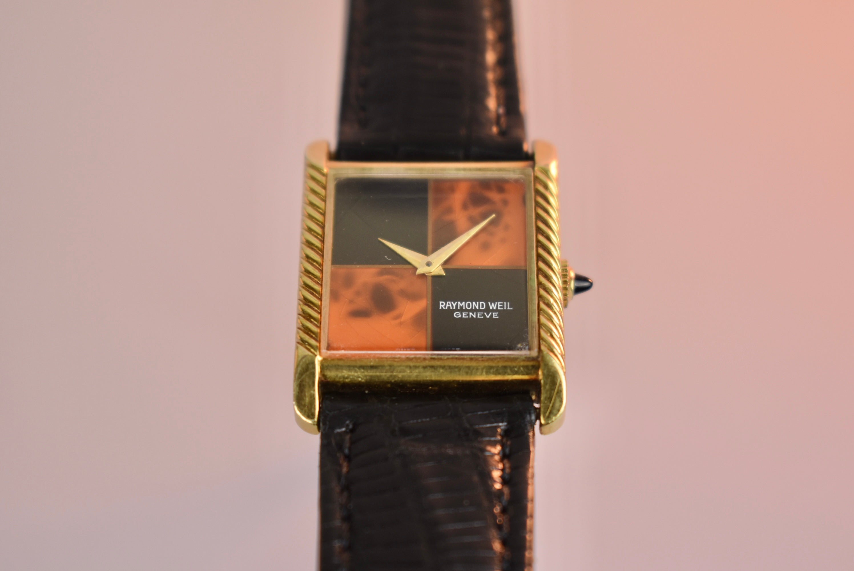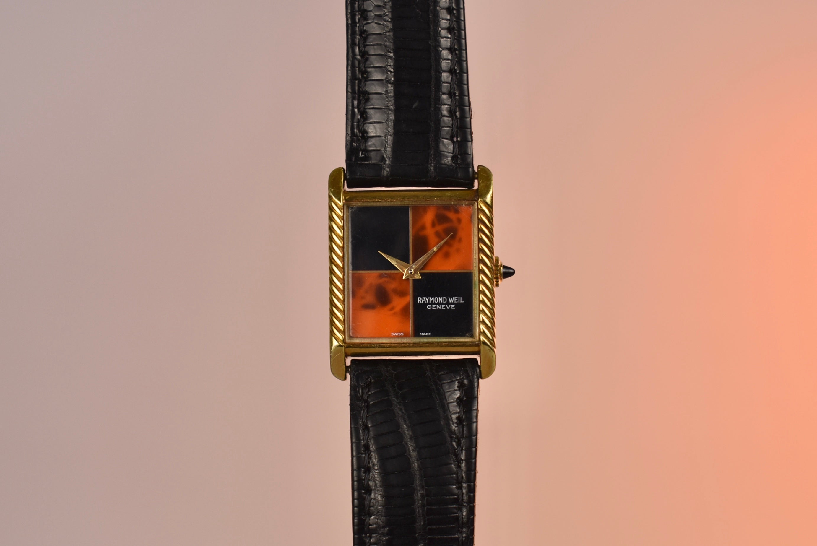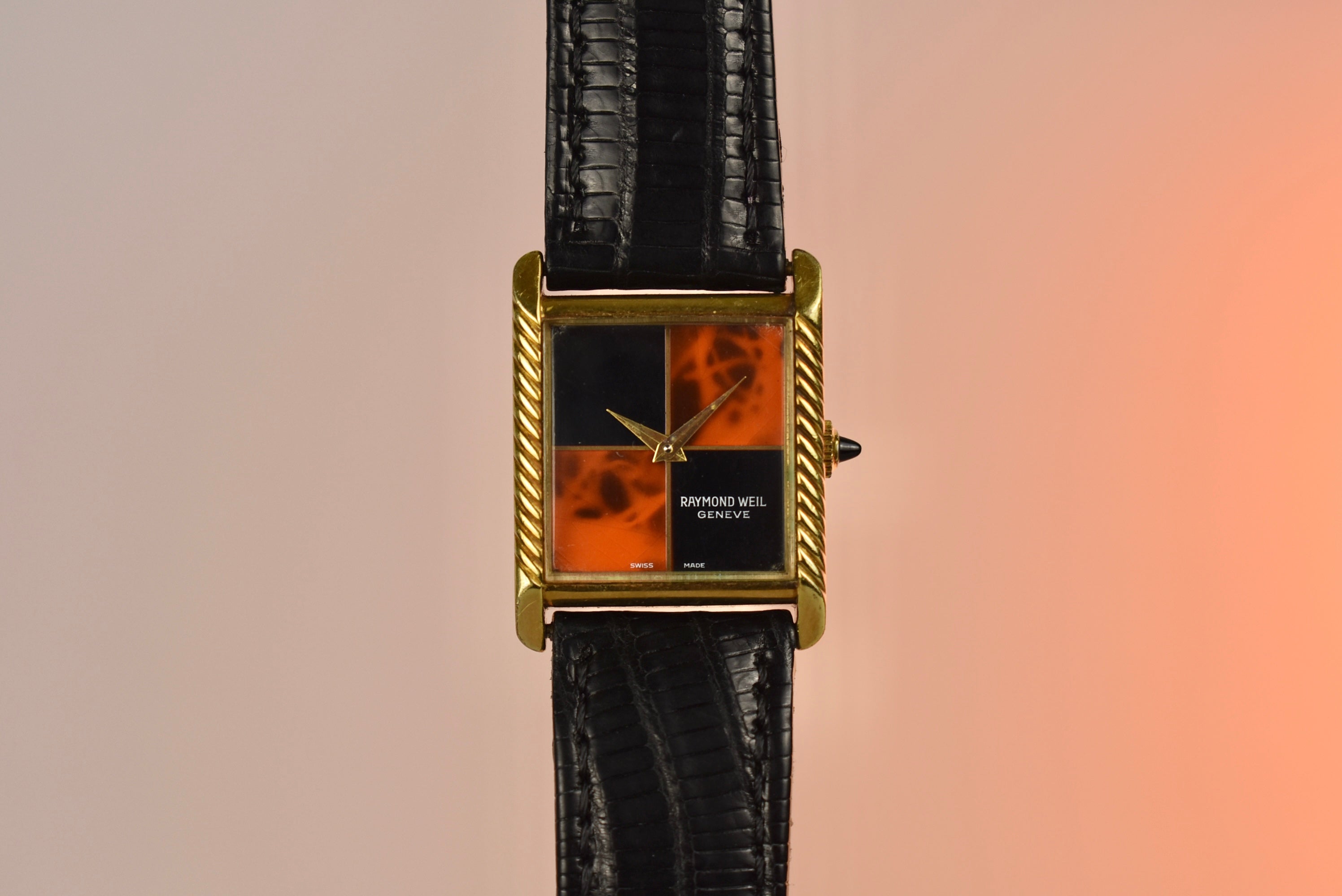 A very rare piece by Raymond Weil. A stunning dial with a flame like pattern in each corner. A Cartier Tank is a watch many of us love but sometimes it’s hard spending that much on a watch. This becomes one of the coolest alternatives that’ll scratch that itch and is even better then some Cartier tanks that are triple the price. Featuring a stunning spiral case and rare dial with its spider patina, you can’t beat it!