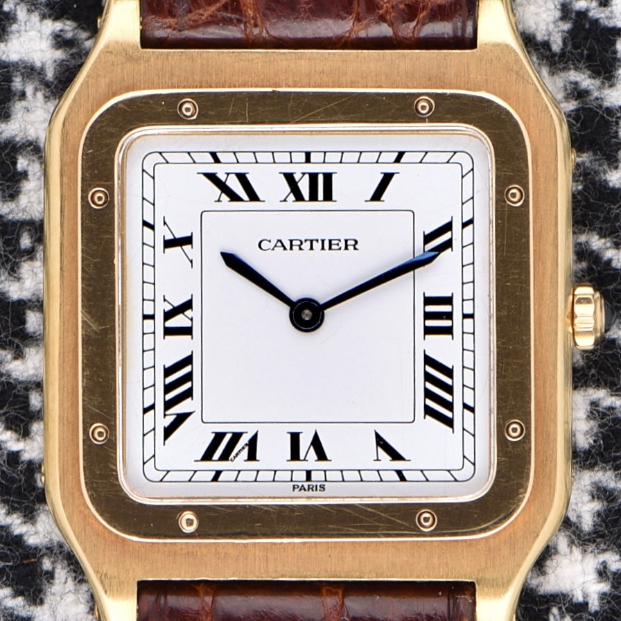 This might be the Santos to have when it comes to the Dumonts. Housed inside is the famous Piaget manual movement. The dial is stamped Paris at 6 o'clock and has beautifully, Cartier signature, blued hands. The case profile is nice and thin and the size is just perfect.